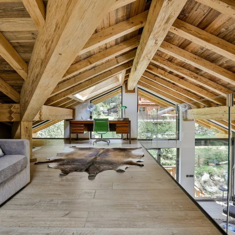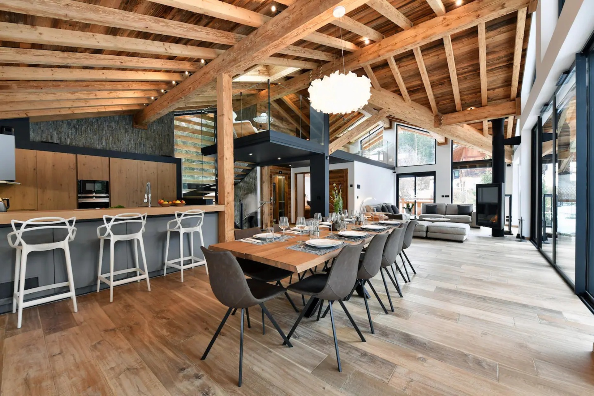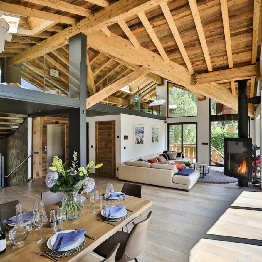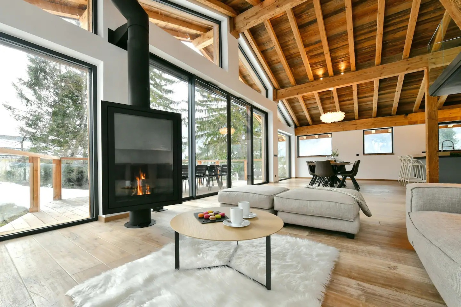 Upon entering the chalet, you will be welcomed in a bright and spacious open-plan living area, where floor to ceiling windows flood the space with natural light. Here, wooden beam ceiling recall the classic chalet structure and is elegantly blended with a contemporary finish and modern furnishings. A comfortable L-shaped sofa and a fireplace creates the ideal place where to come back to at the end of a busy day.
