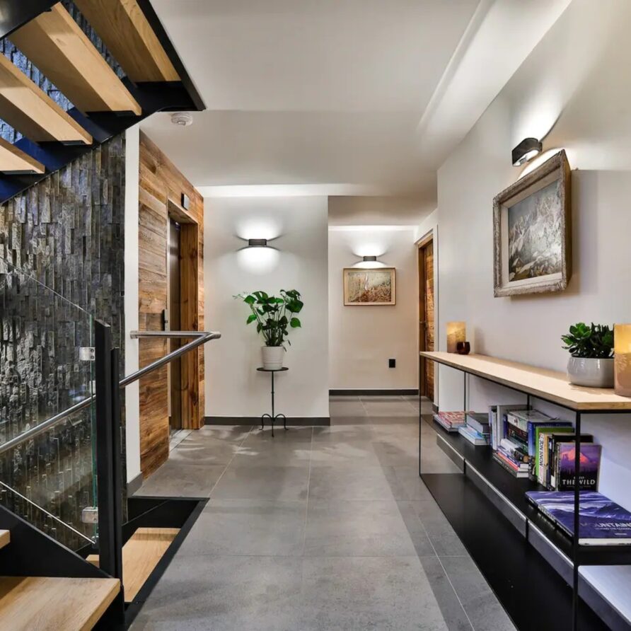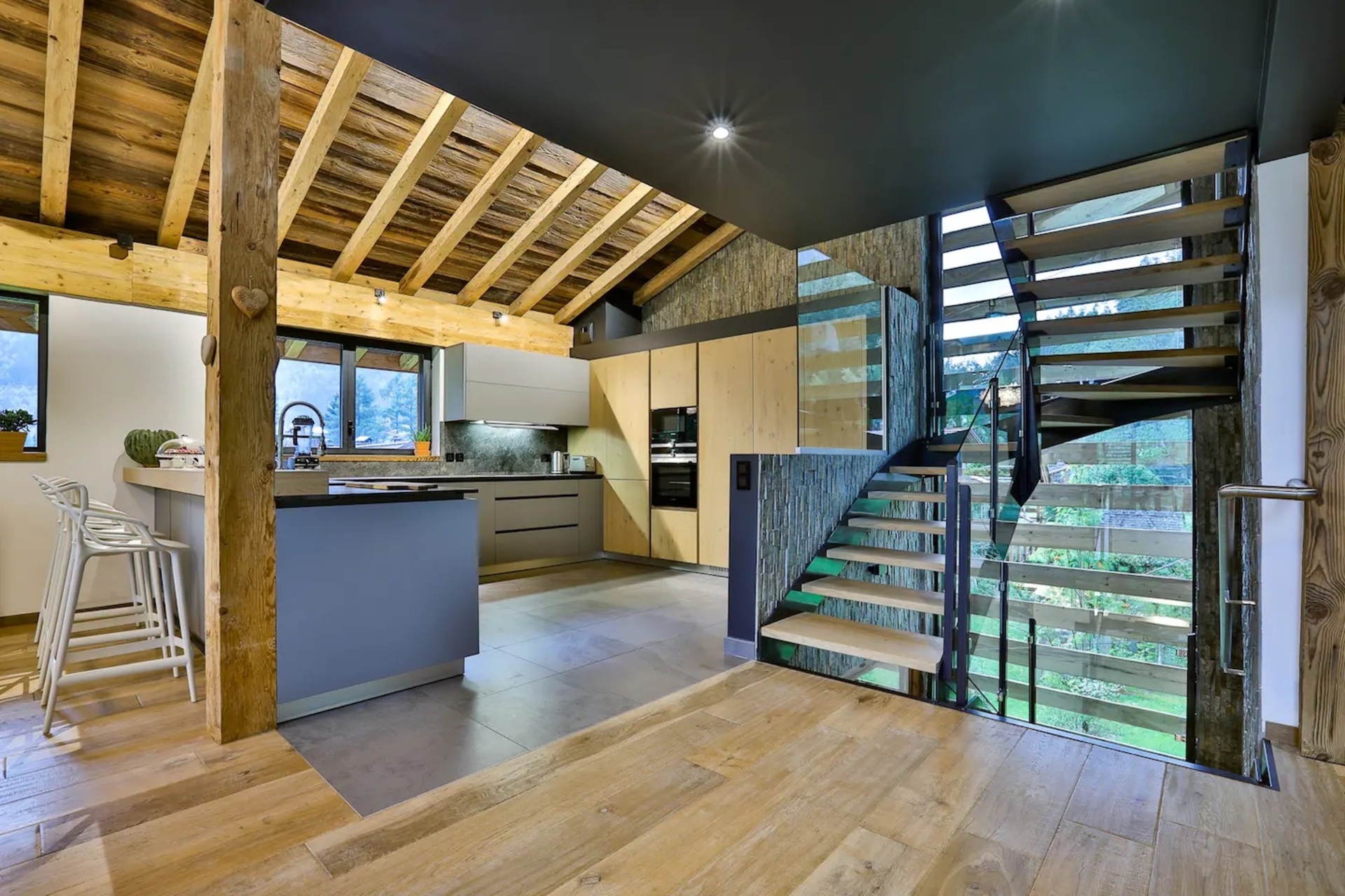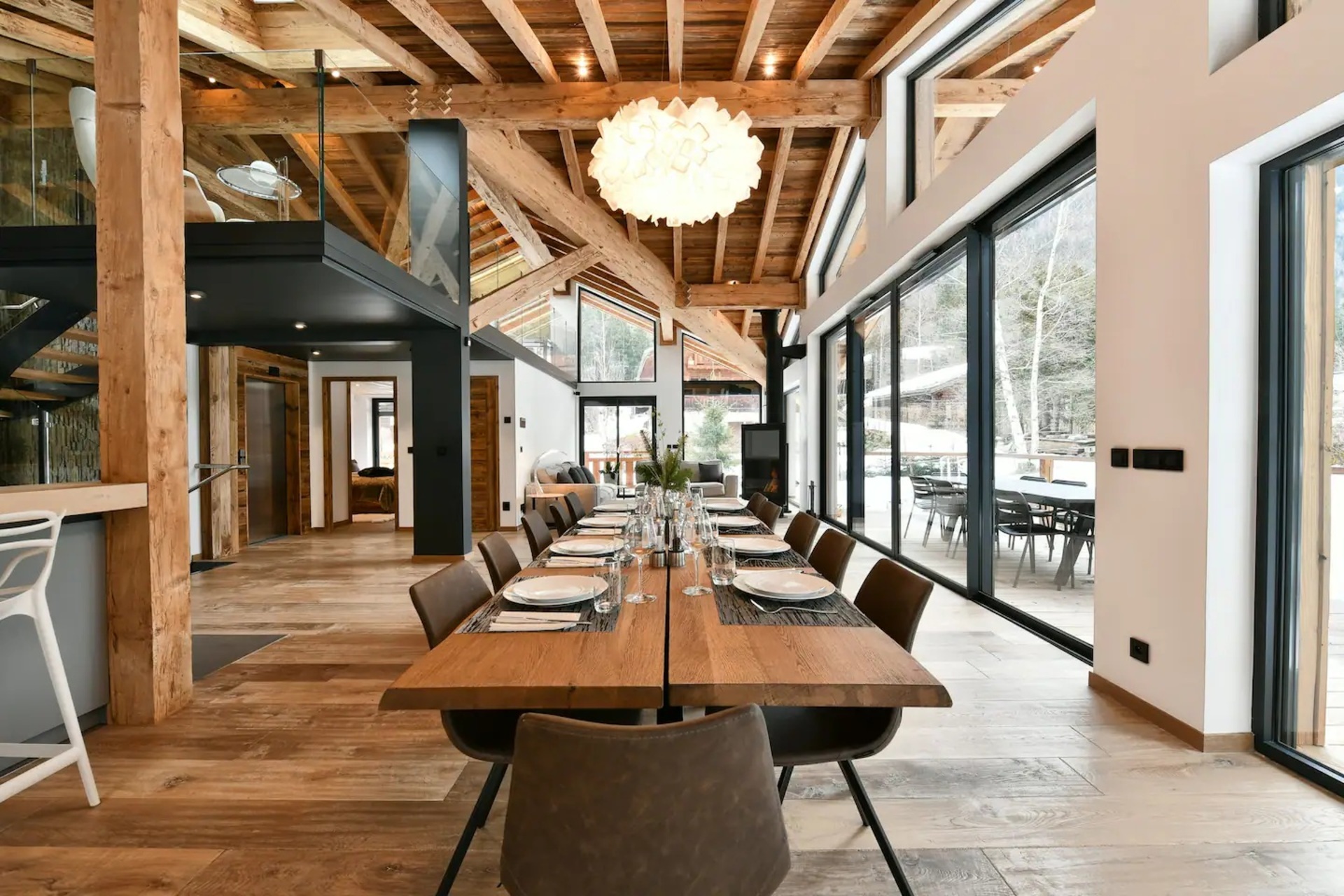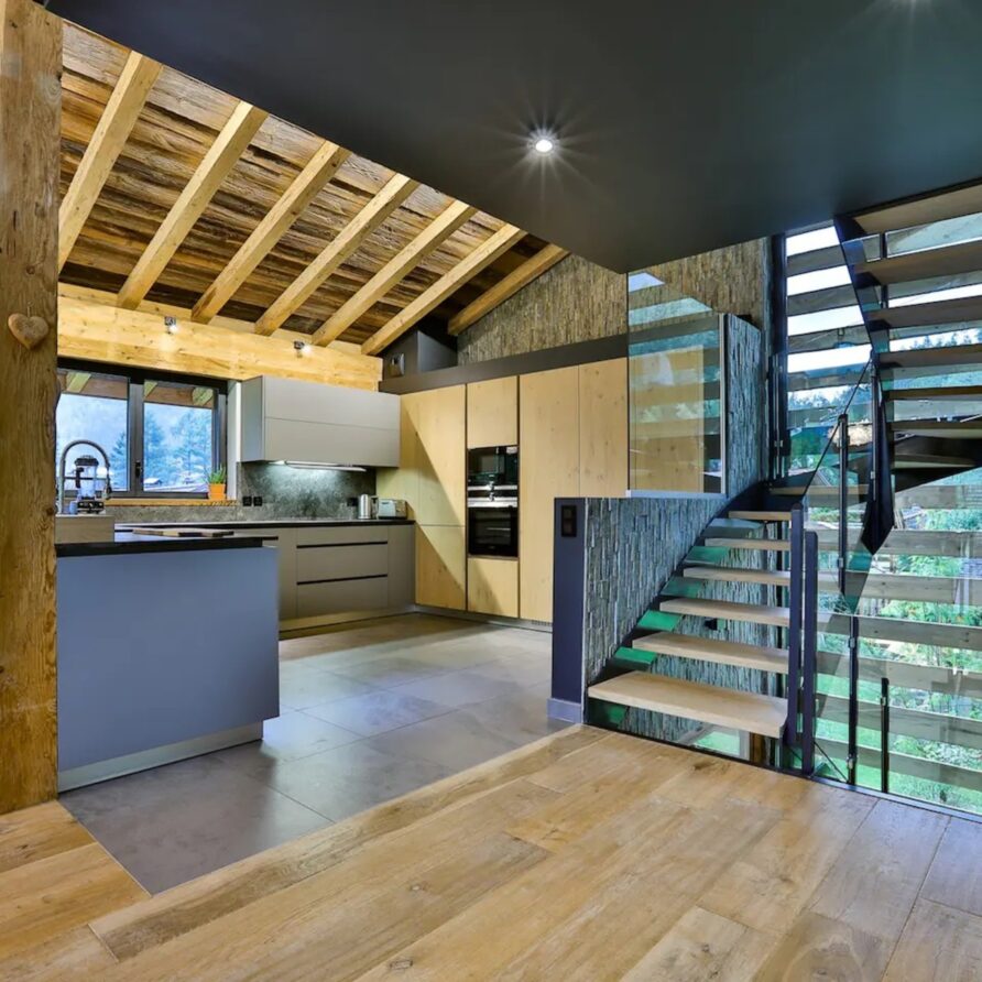 Upon entering the chalet, you will be welcomed in a bright and spacious open-plan living area, where floor to ceiling windows flood the space with natural light. Here, wooden beam ceiling recall the classic chalet structure and is elegantly blended with a contemporary finish and modern furnishings. A comfortable L-shaped sofa and a fireplace creates the ideal place where to come back to at the end of a busy day.