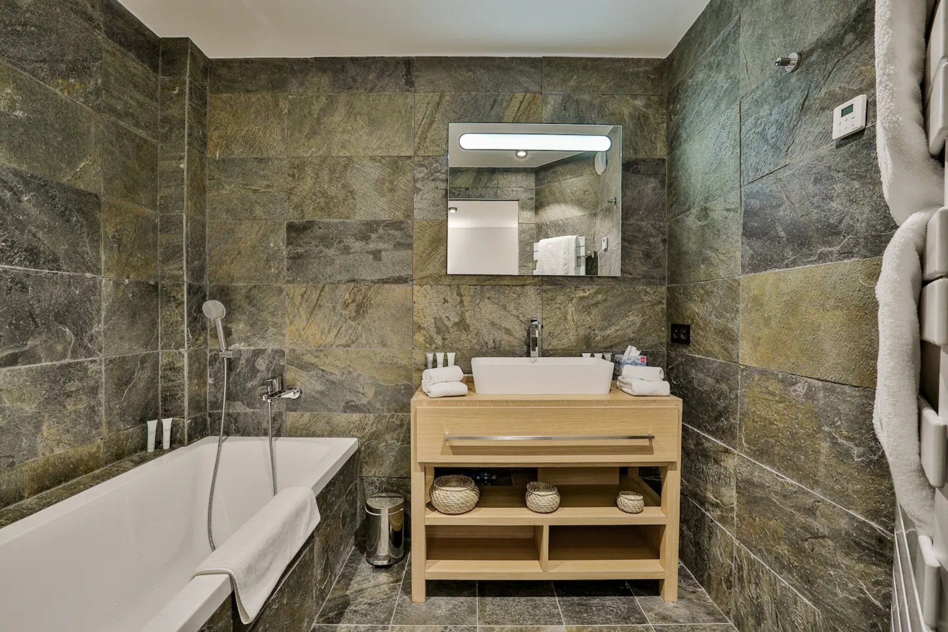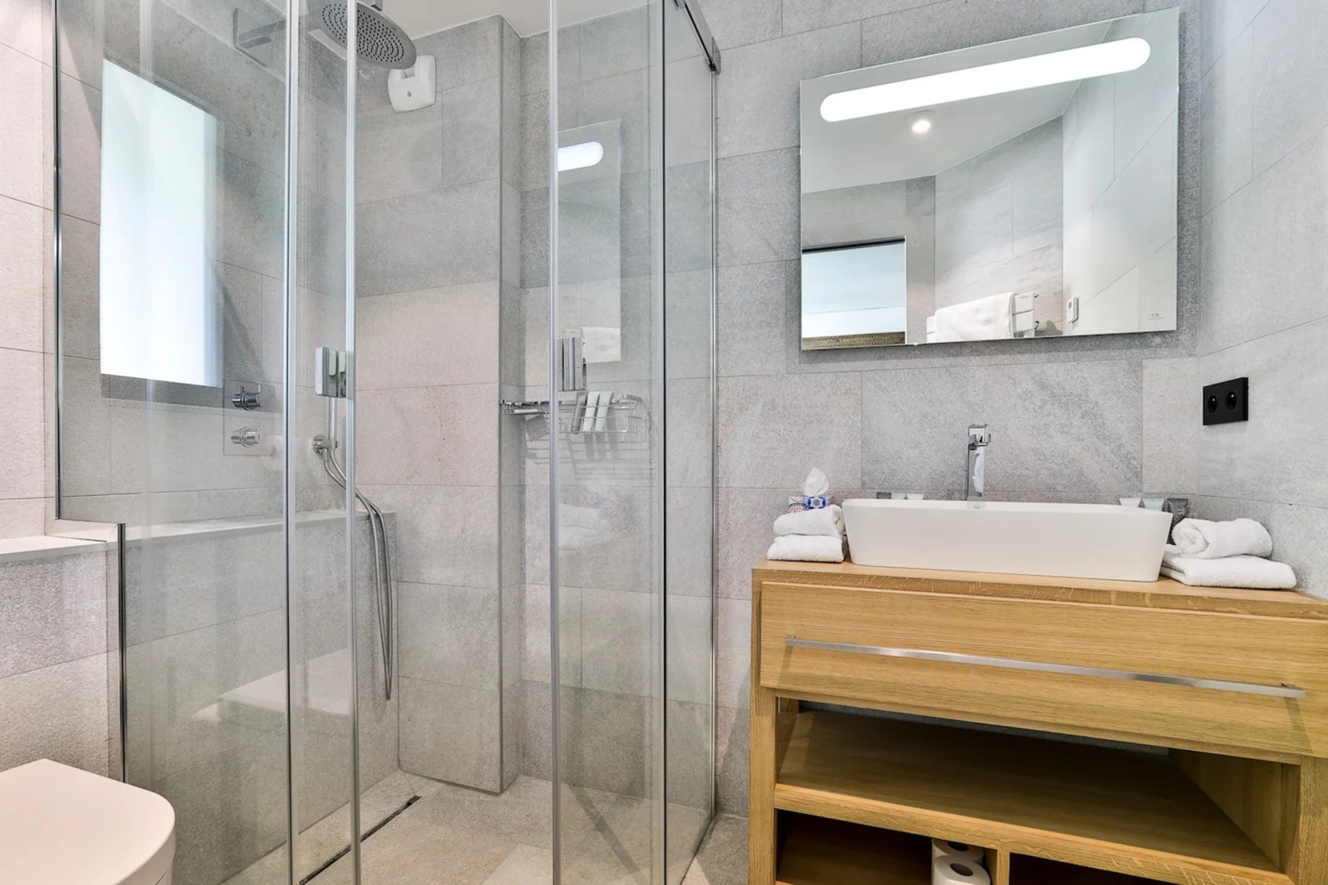 To the other side of the living area, a classy dining space and a fully-equipped modern kitchen await. Any budding cook will enjoy the open-plan kitchen and should find all they need to prepare a quality home-cooked meal. With a raised bar area, there’s a suitable spot for you to enjoy an aperitif. Alternatively, leading outside through the large patio doors, you step out onto the south-facing balcony. With an alfresco dining set up, you can enjoy meals with the whole group, appreciating the warm summer weather and beautiful surroundings.