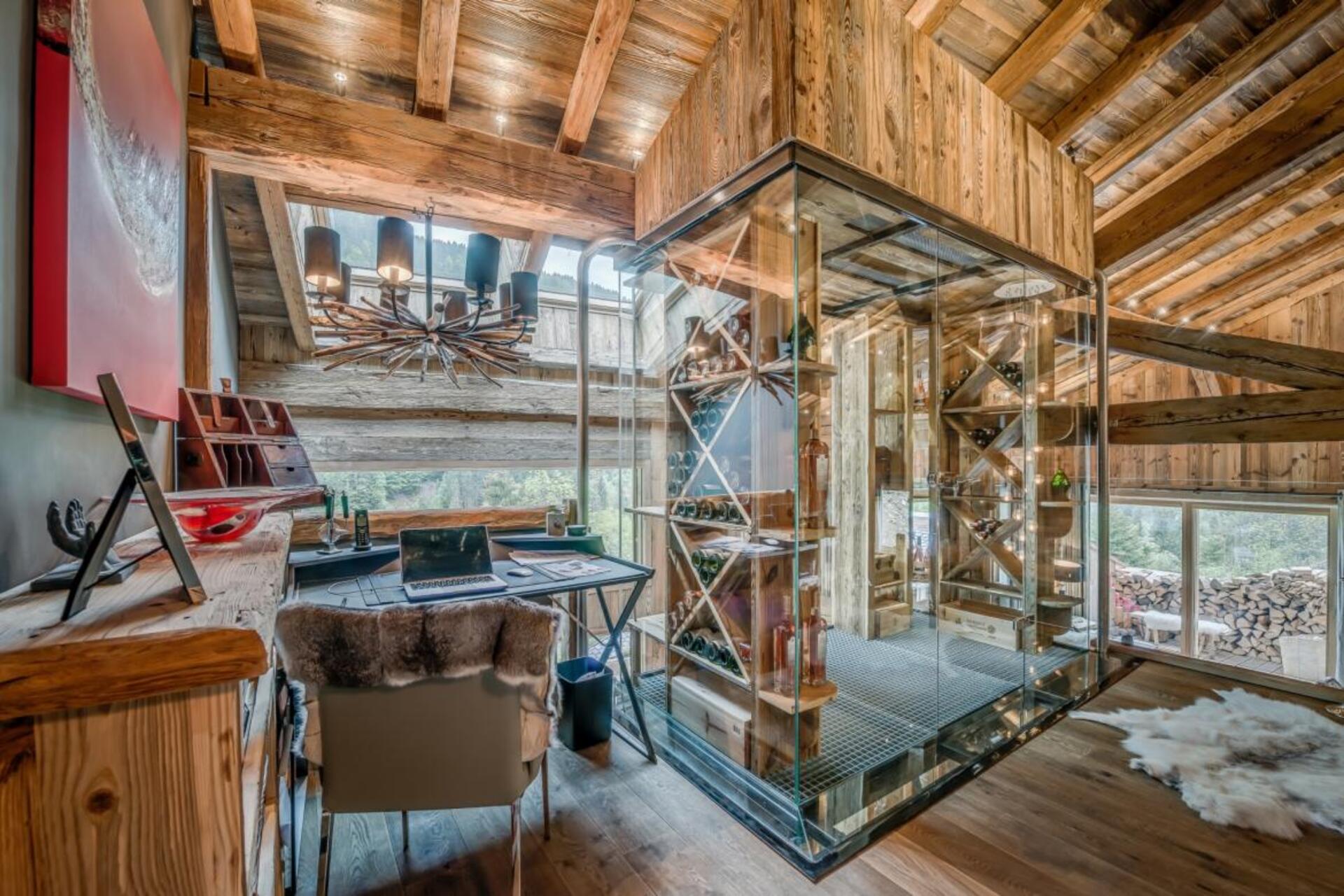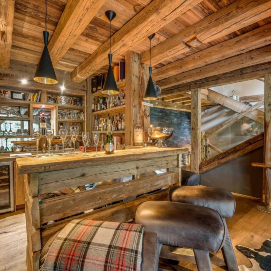 The chalet has several separate living areas; a large bright living area with open fireplace located on the top floor of the chalet. There is a fabulous cinema room located next to a stocked bar with pool table which can be either open or closed off and hidden, which will keep both adults and children happy. The open plan kitchen and dining area looks out over the expansive terrace and affords beautiful views of the mountains.