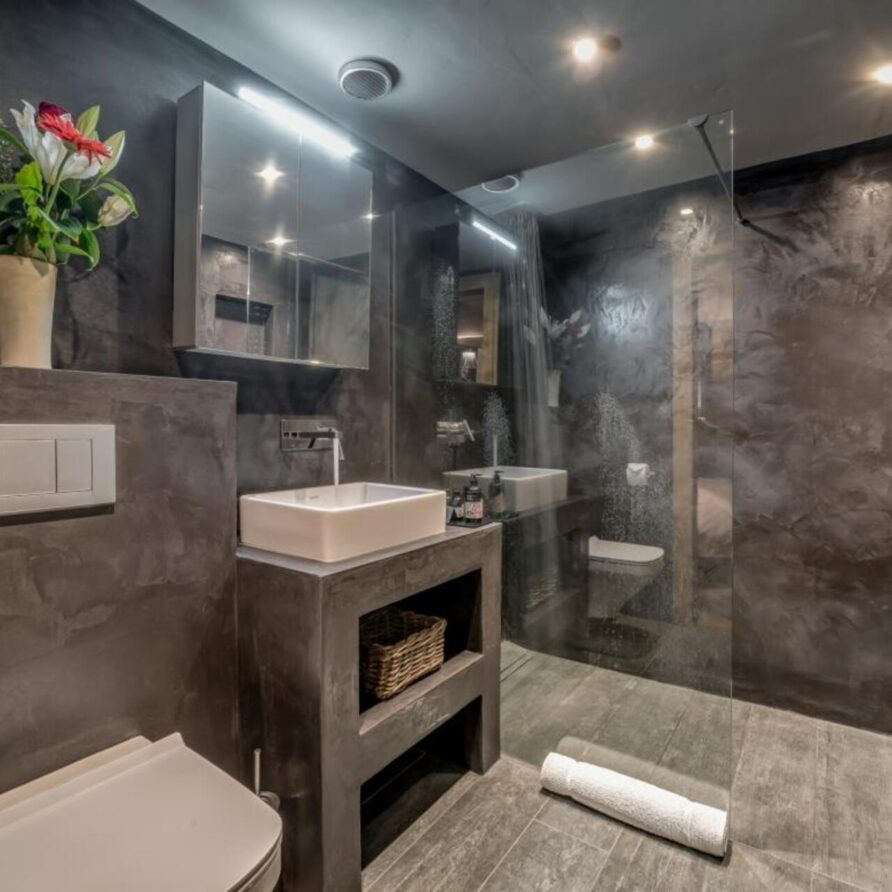The spa area is located on the middle floor of the chalet with floor to ceiling glass windows; it comprises of a sunken Jacuzzi complete with stepping stones. There is a further relaxation zone to enjoy the sweeping valley views.