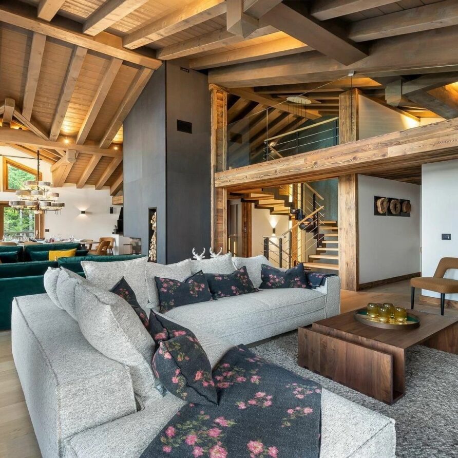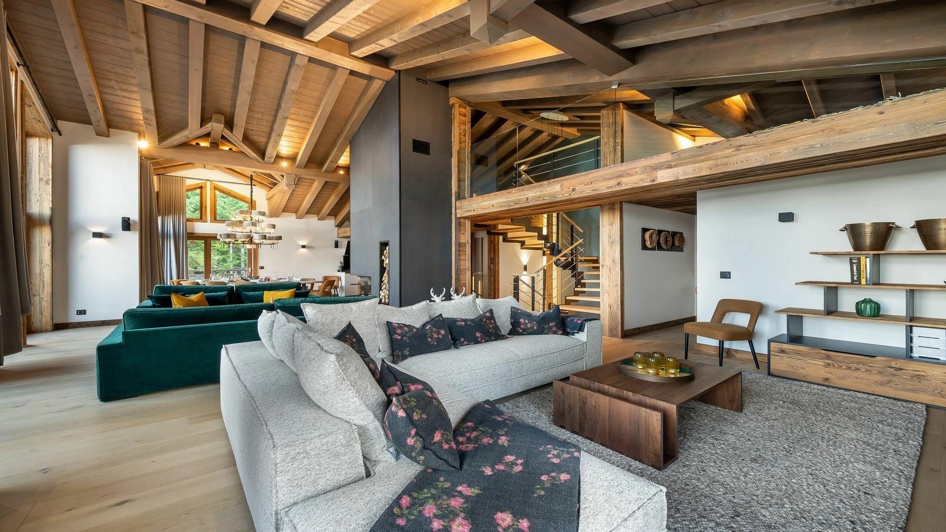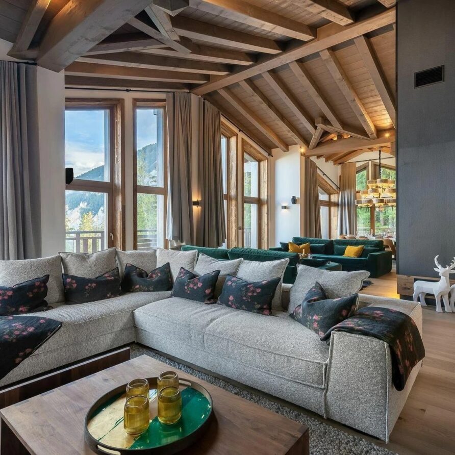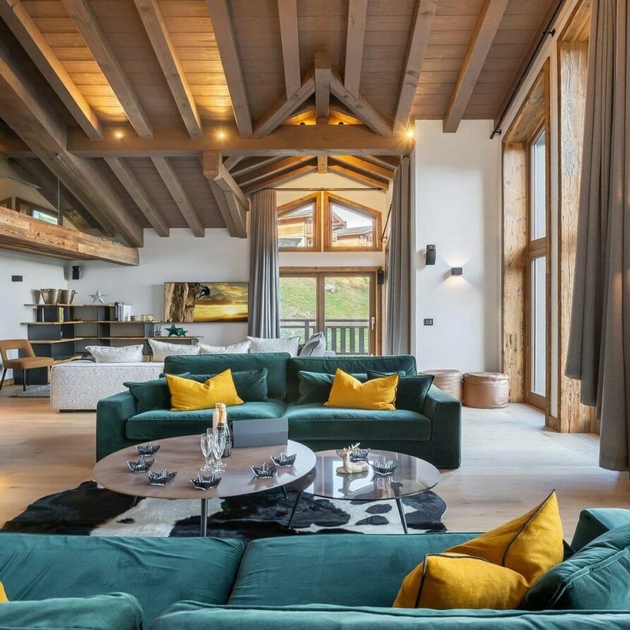 The top floor welcomes you into a light-filled, open-plan living space, where floor-to-ceiling windows frame mesmerizing vistas of the surrounding peaks. The large living room is dominated by two color-contrasting sofa ensembles – plush, deep-set fir-green velvet sofas with mustard-colored cushions and an expansive, cream-colored L-shaped sofa invite to sink into their warmth beside the crackling wood-burning fireplace, creating the perfect setting for unwinding after an exhilarating day on the slopes.