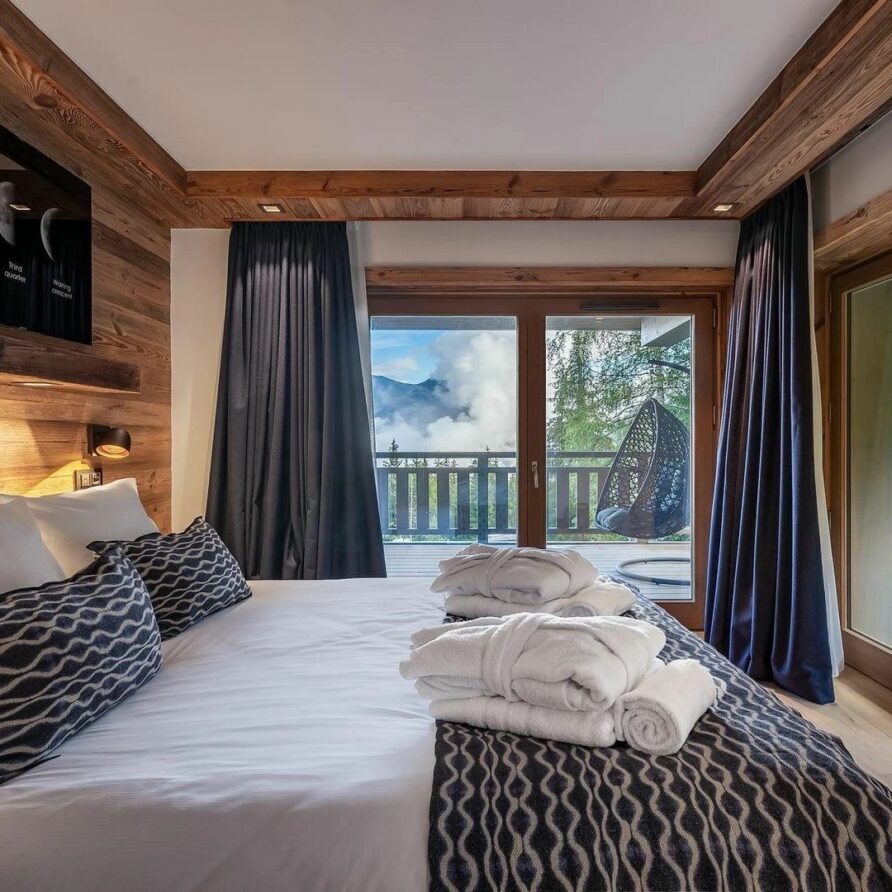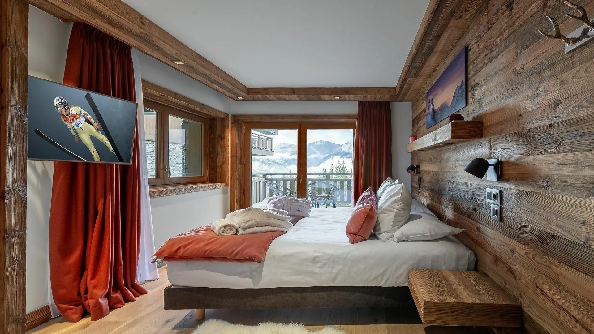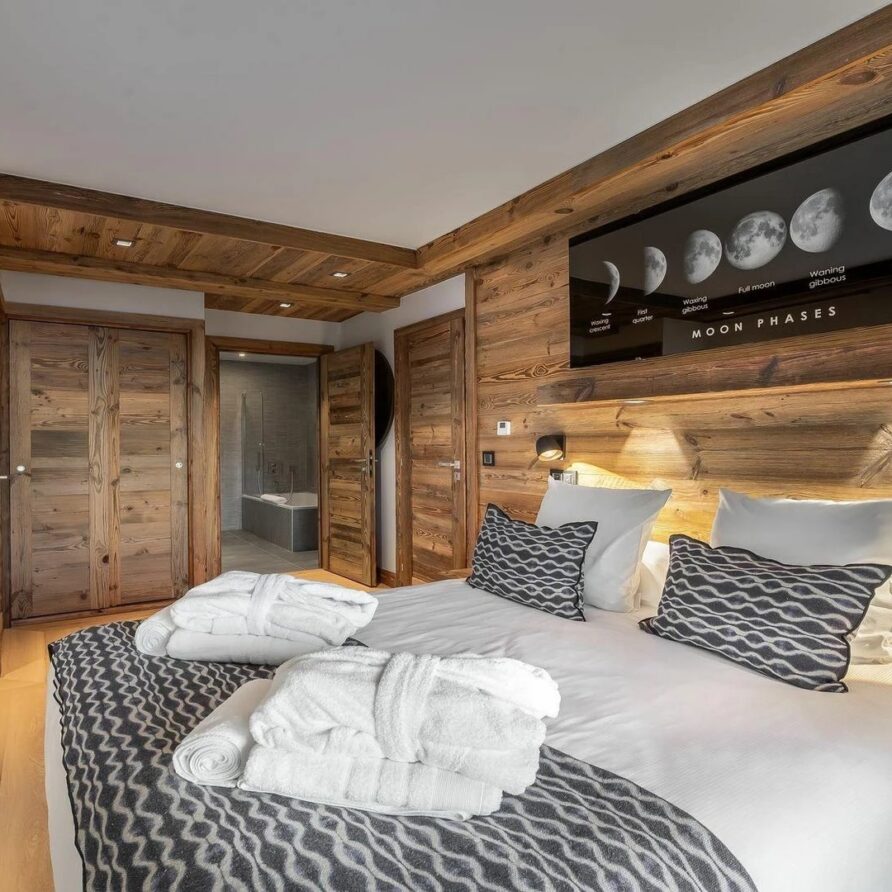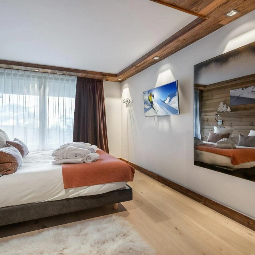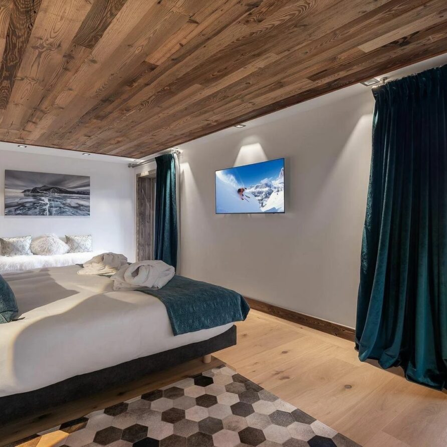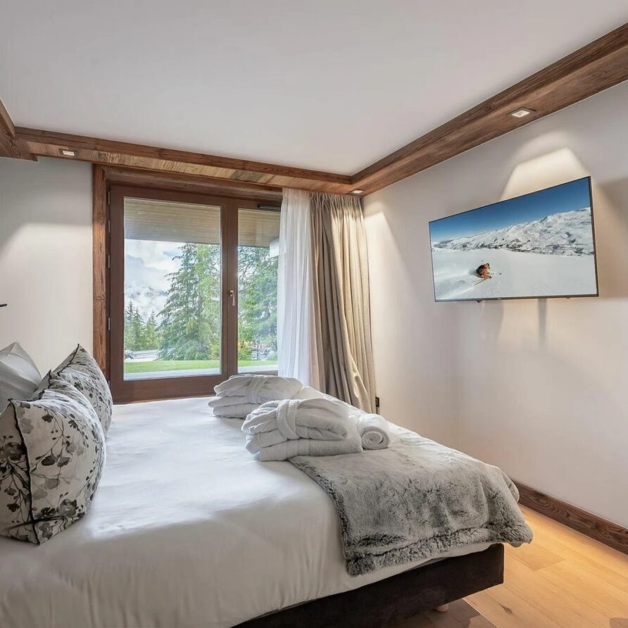 The chalet offers six beautifully appointed double bedrooms, accommodating up to 12 guests in supreme comfort. Each bedroom is adorned with sleek wooden interiors, exuding a sophisticated alpine charm, and features plush bedding, en-suite bathrooms with bathtubs and luxurious walk-in showers. Several rooms also benefit from private balcony or terrace access, allowing you to wake up to spectacular views.