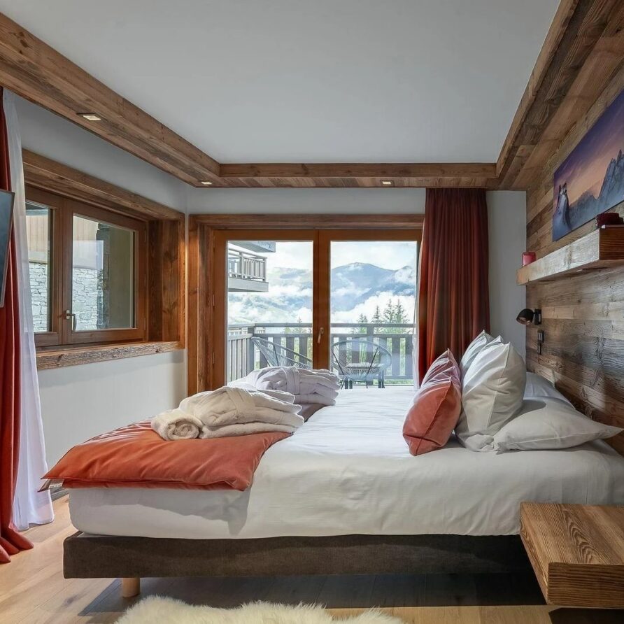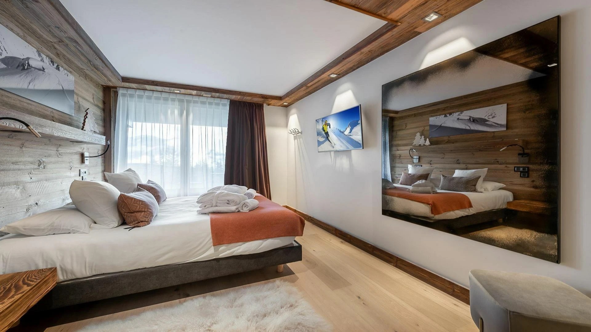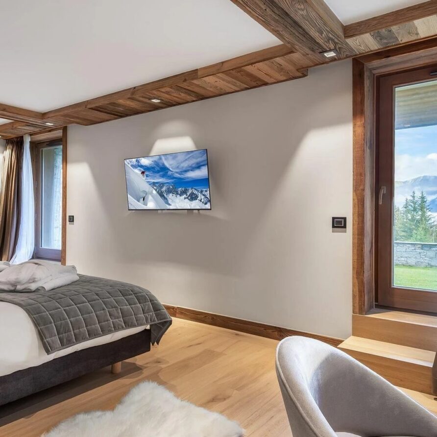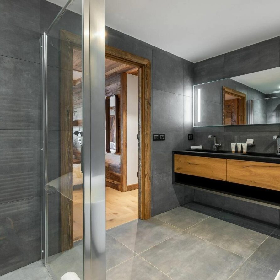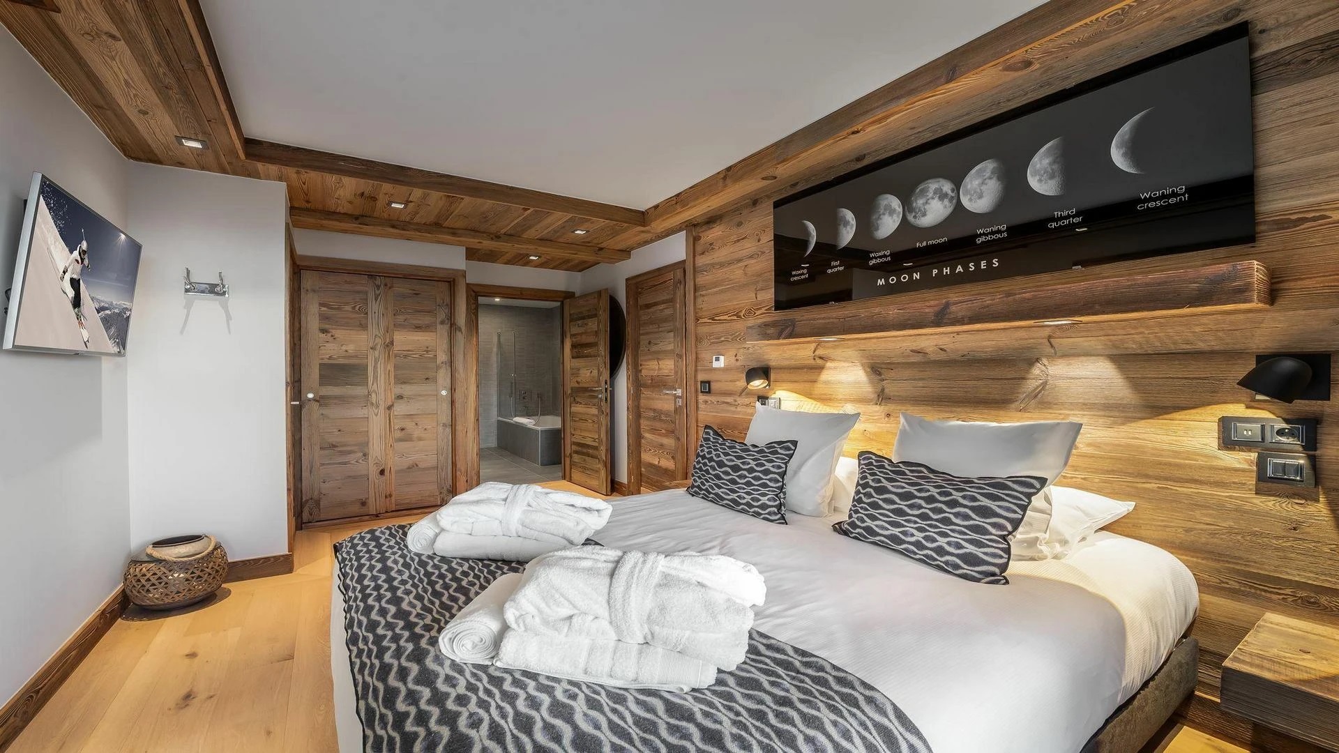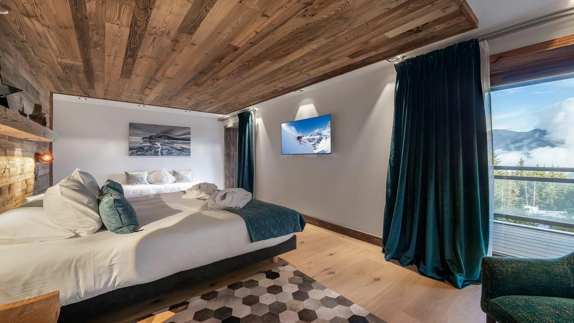 The chalet offers six beautifully appointed double bedrooms, accommodating up to 12 guests in supreme comfort. Each bedroom is adorned with sleek wooden interiors, exuding a sophisticated alpine charm, and features plush bedding, en-suite bathrooms with bathtubs and luxurious walk-in showers. Several rooms also benefit from private balcony or terrace access, allowing you to wake up to spectacular views.