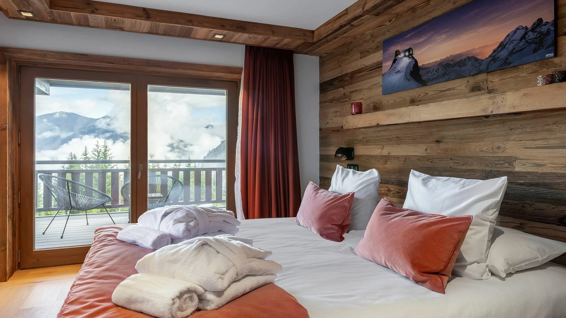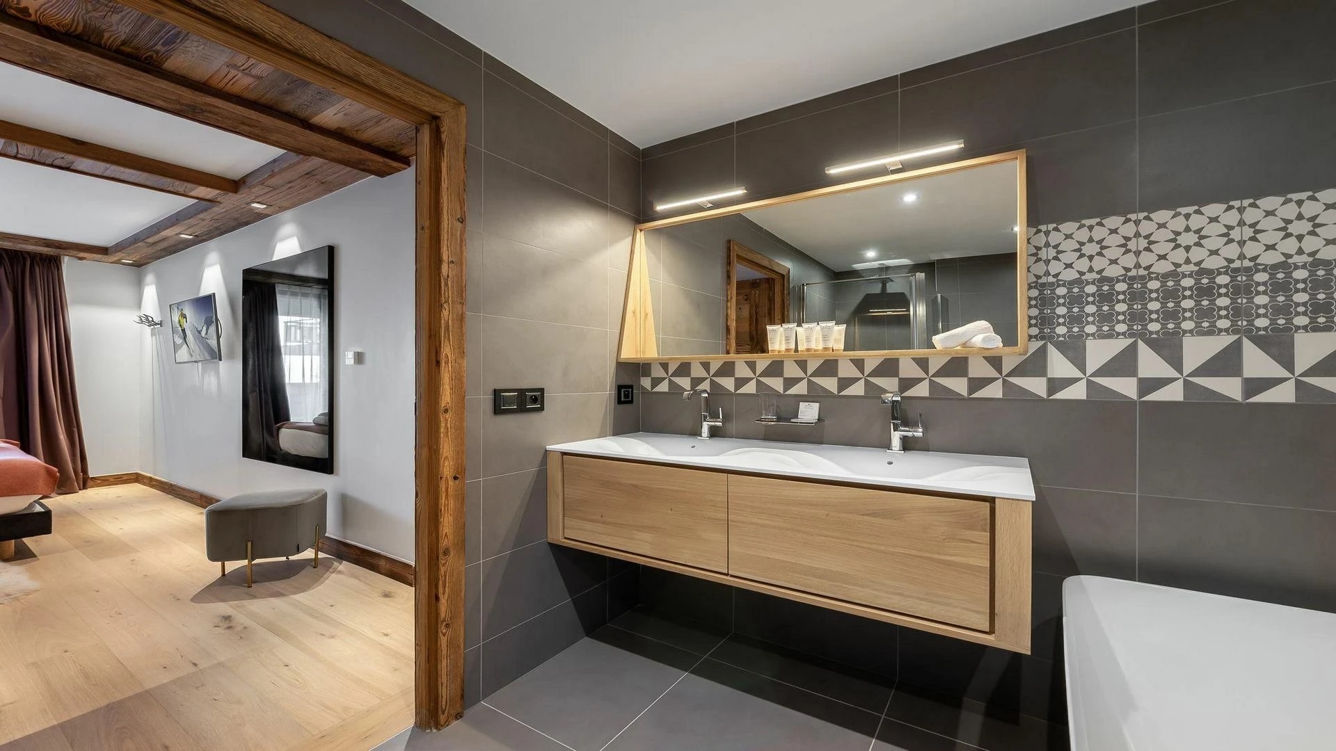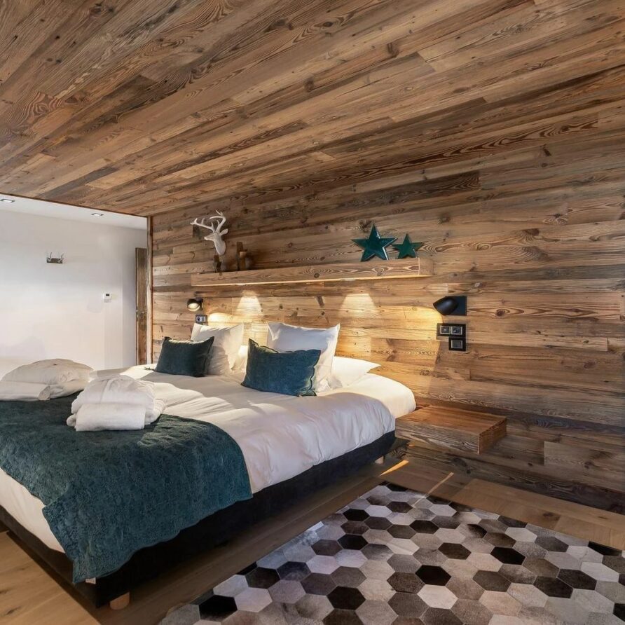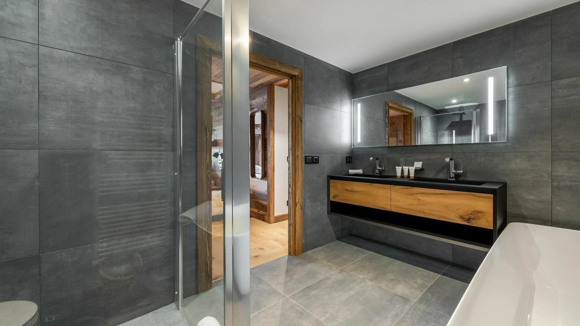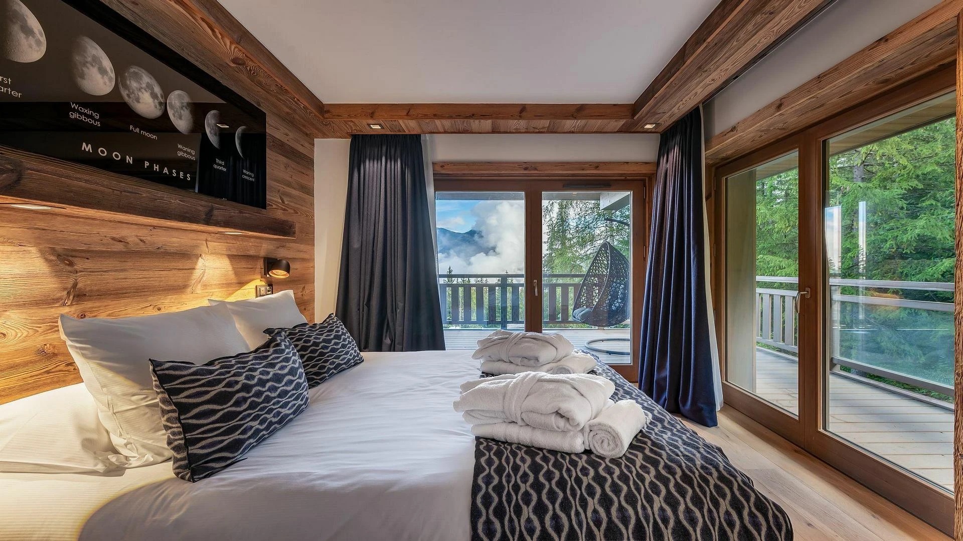 The chalet offers six beautifully appointed double bedrooms, accommodating up to 12 guests in supreme comfort. Each bedroom is adorned with sleek wooden interiors, exuding a sophisticated alpine charm, and features plush bedding, en-suite bathrooms with bathtubs and luxurious walk-in showers. Several rooms also benefit from private balcony or terrace access, allowing you to wake up to spectacular views.