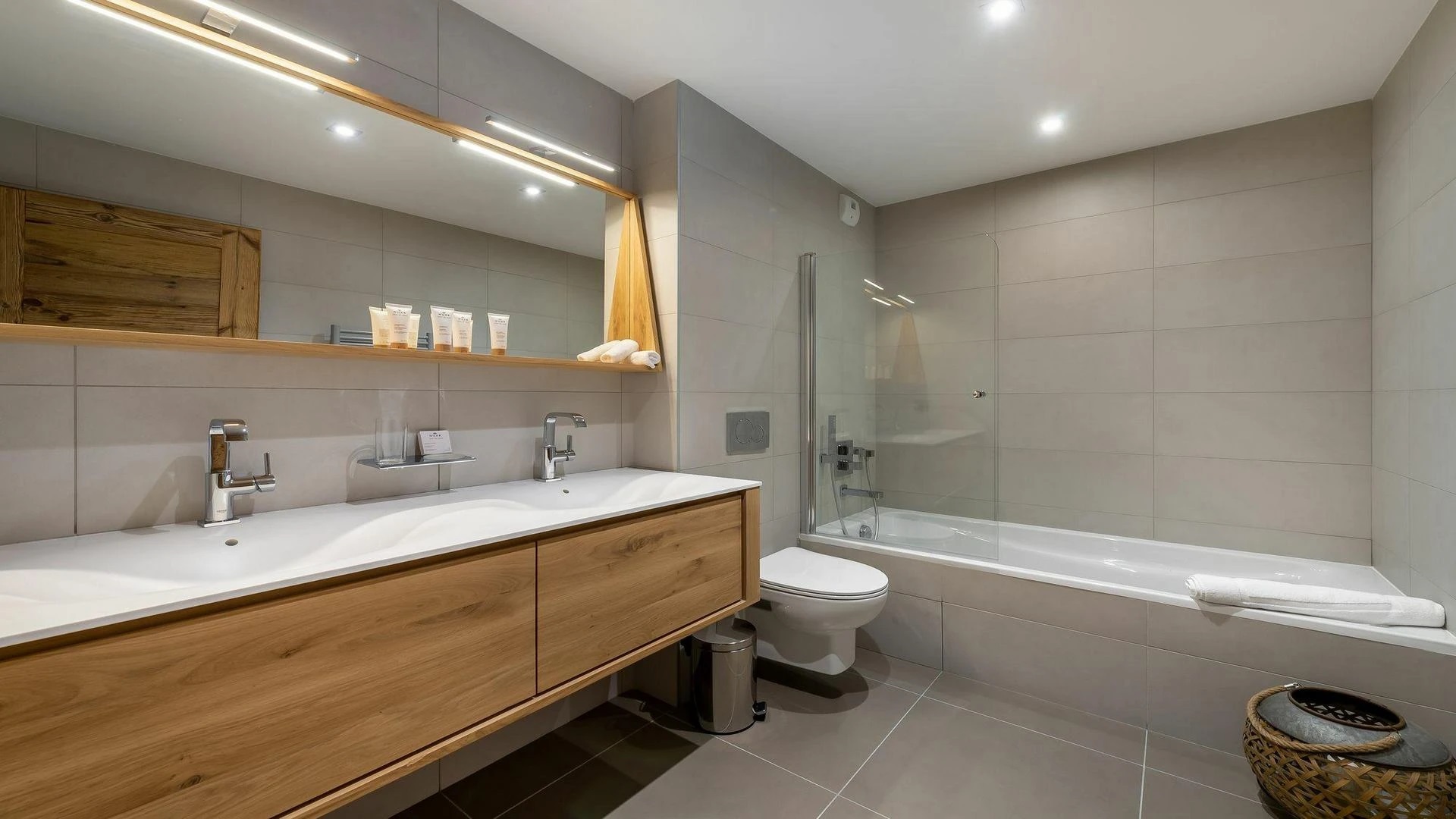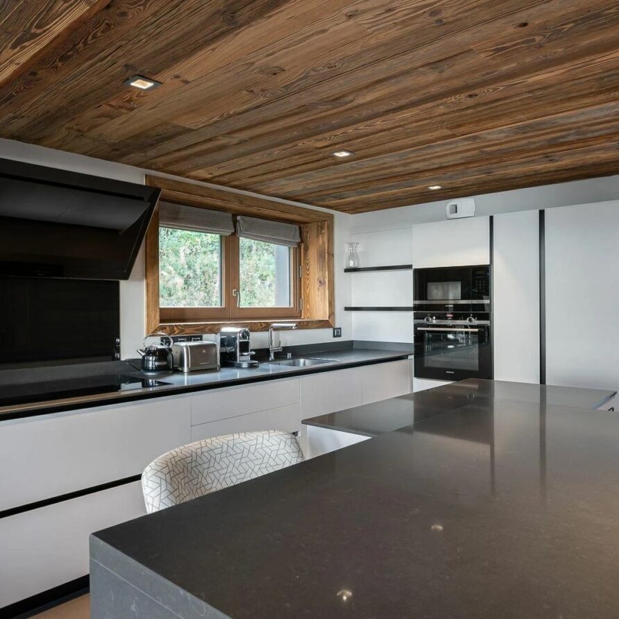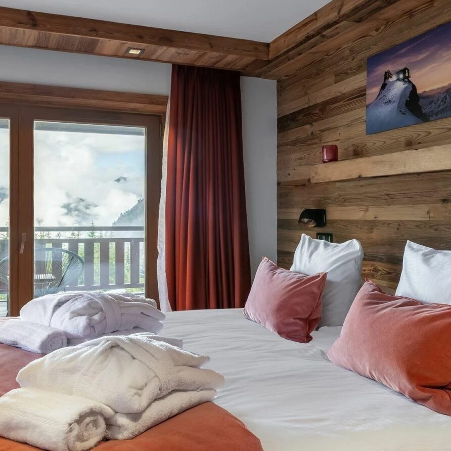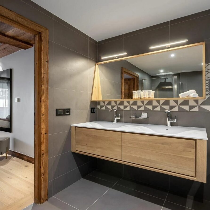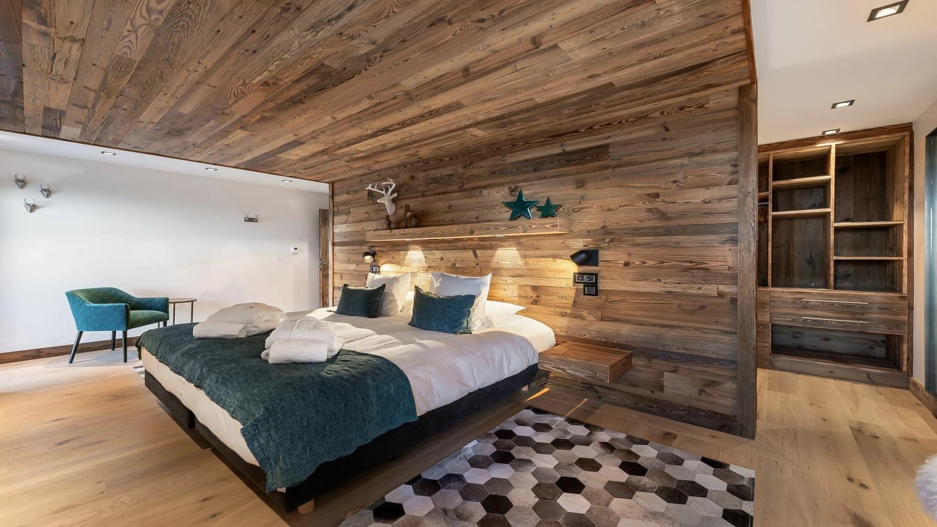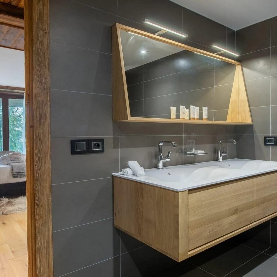 The chalet offers six beautifully appointed double bedrooms, accommodating up to 12 guests in supreme comfort. Each bedroom is adorned with sleek wooden interiors, exuding a sophisticated alpine charm, and features plush bedding, en-suite bathrooms with bathtubs and luxurious walk-in showers. Several rooms also benefit from private balcony or terrace access, allowing you to wake up to spectacular views.