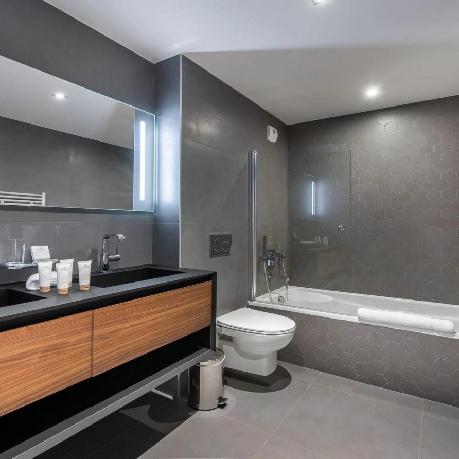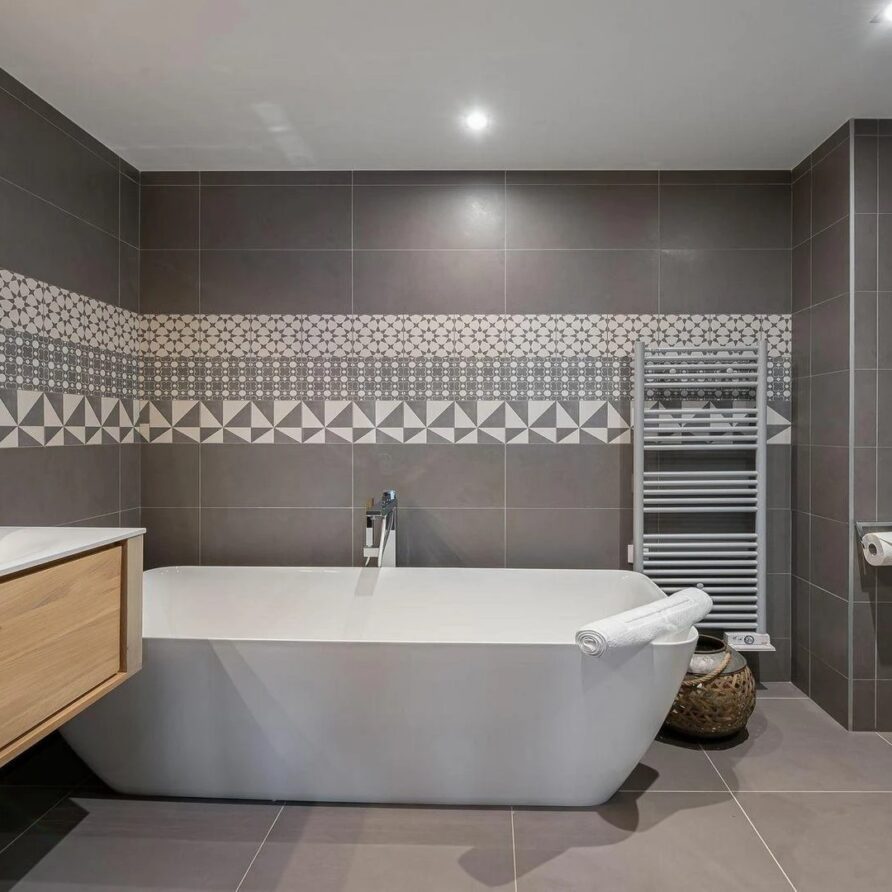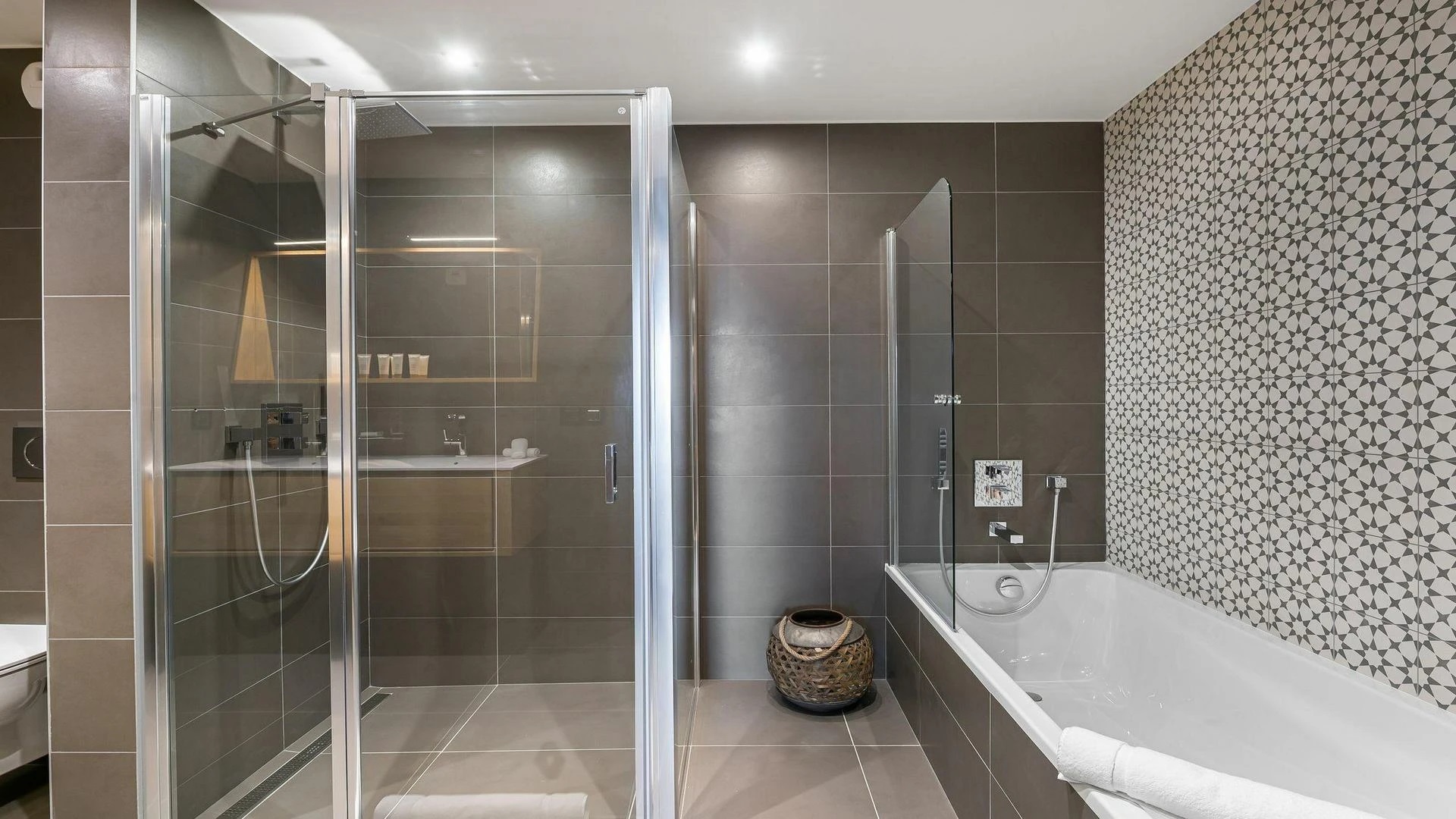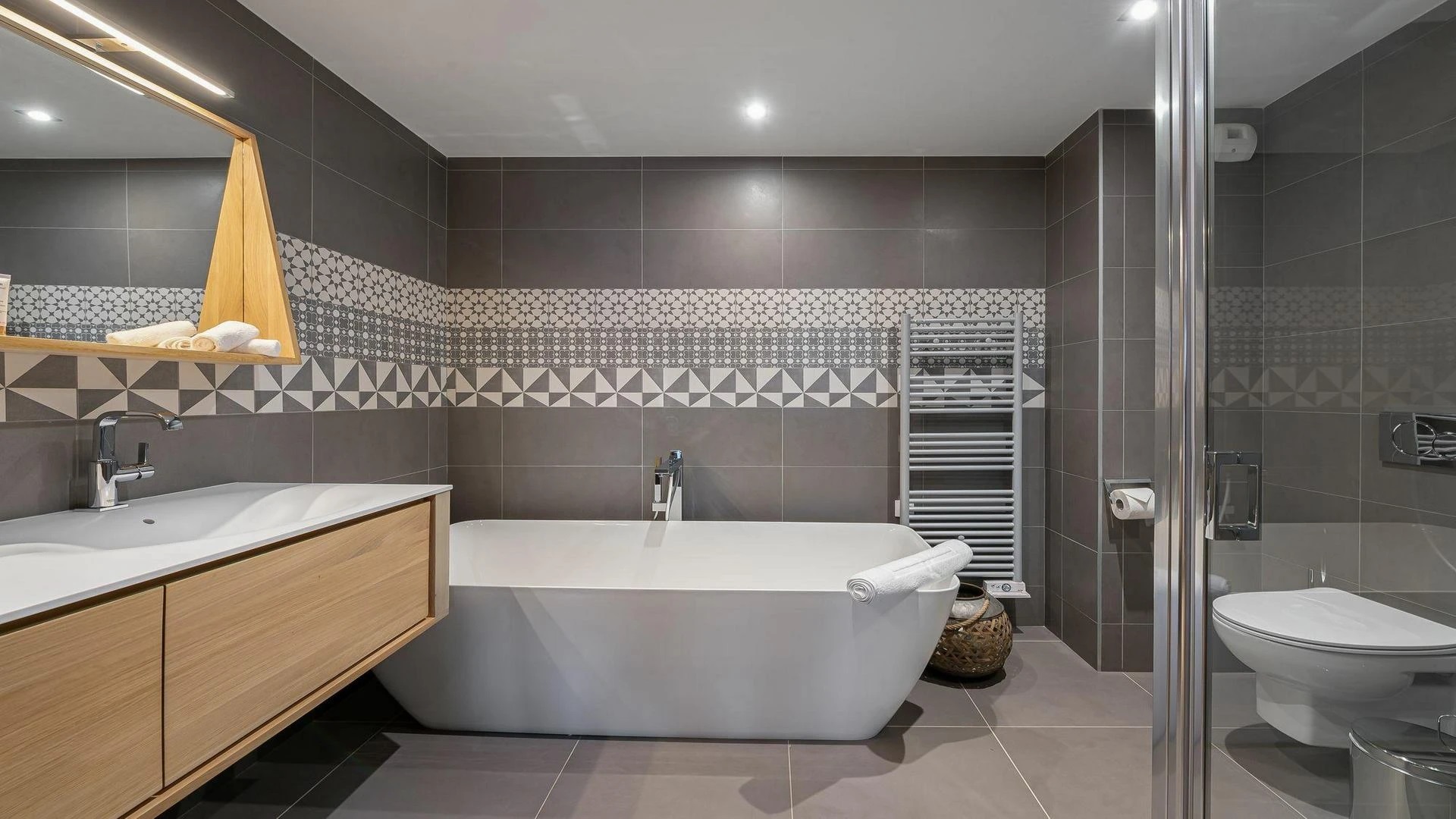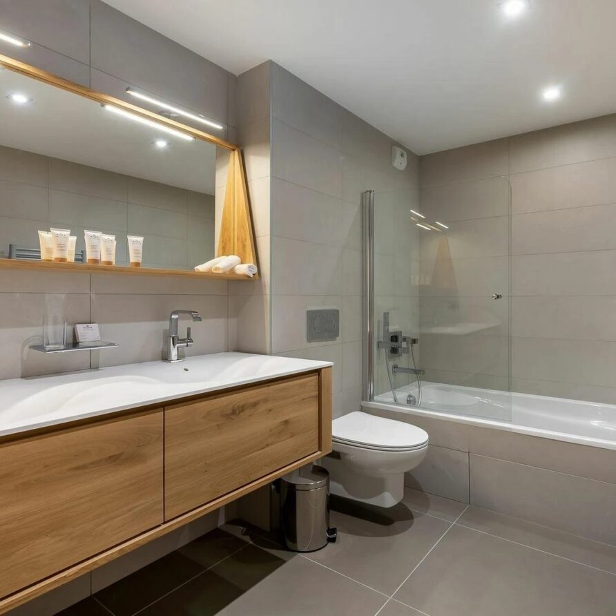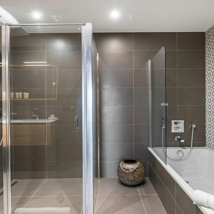 The chalet offers six beautifully appointed double bedrooms, accommodating up to 12 guests in supreme comfort. Each bedroom is adorned with sleek wooden interiors, exuding a sophisticated alpine charm, and features plush bedding, en-suite bathrooms with bathtubs and luxurious walk-in showers. Several rooms also benefit from private balcony or terrace access, allowing you to wake up to spectacular views.