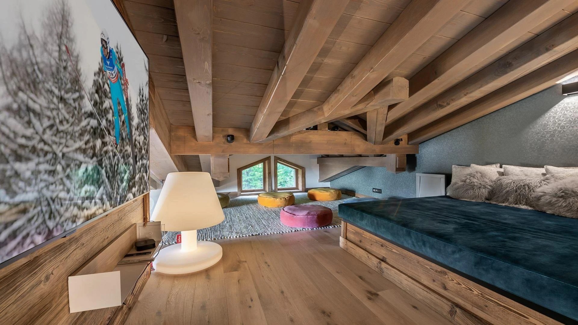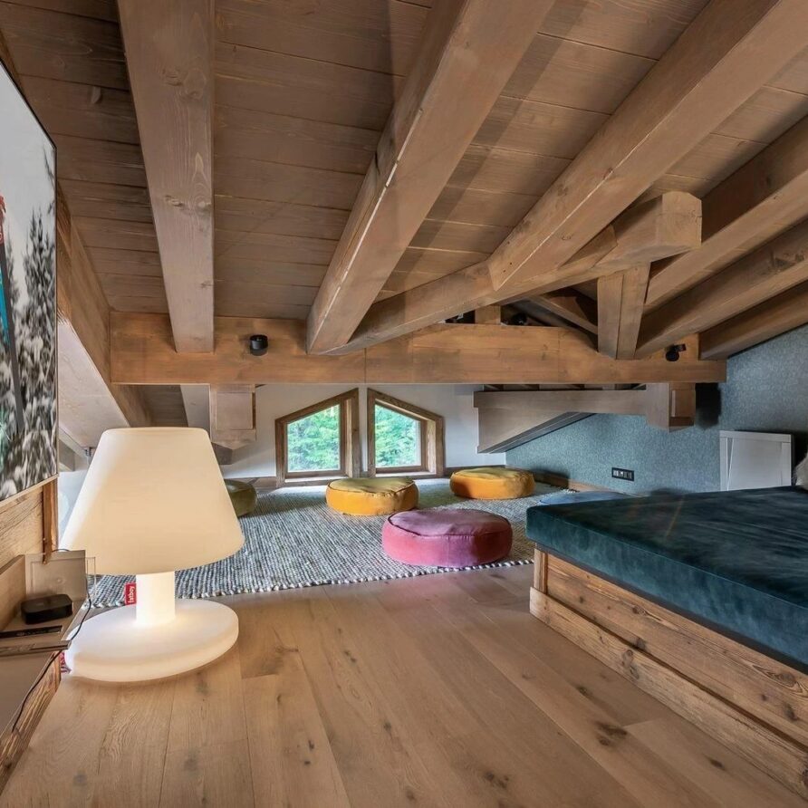For leisurely evenings, the mezzanine floor is home to a cozy TV snug and games room with playful multi-colored velvet pouffes to rest on – perfect for watching a film or gathering for a lively board game session. A dedicated office space is also available for those needing to attend to any work during their ski holiday stay, ensuring both productivity and pleasure can be easily combined.