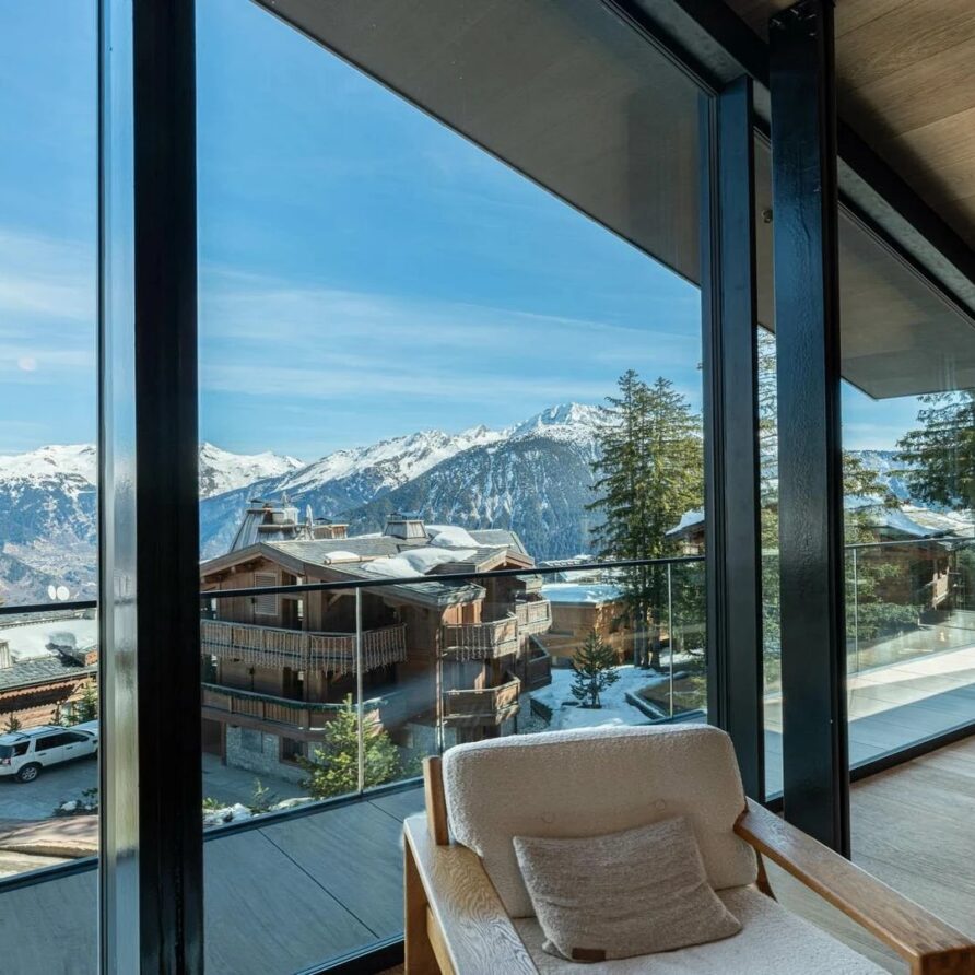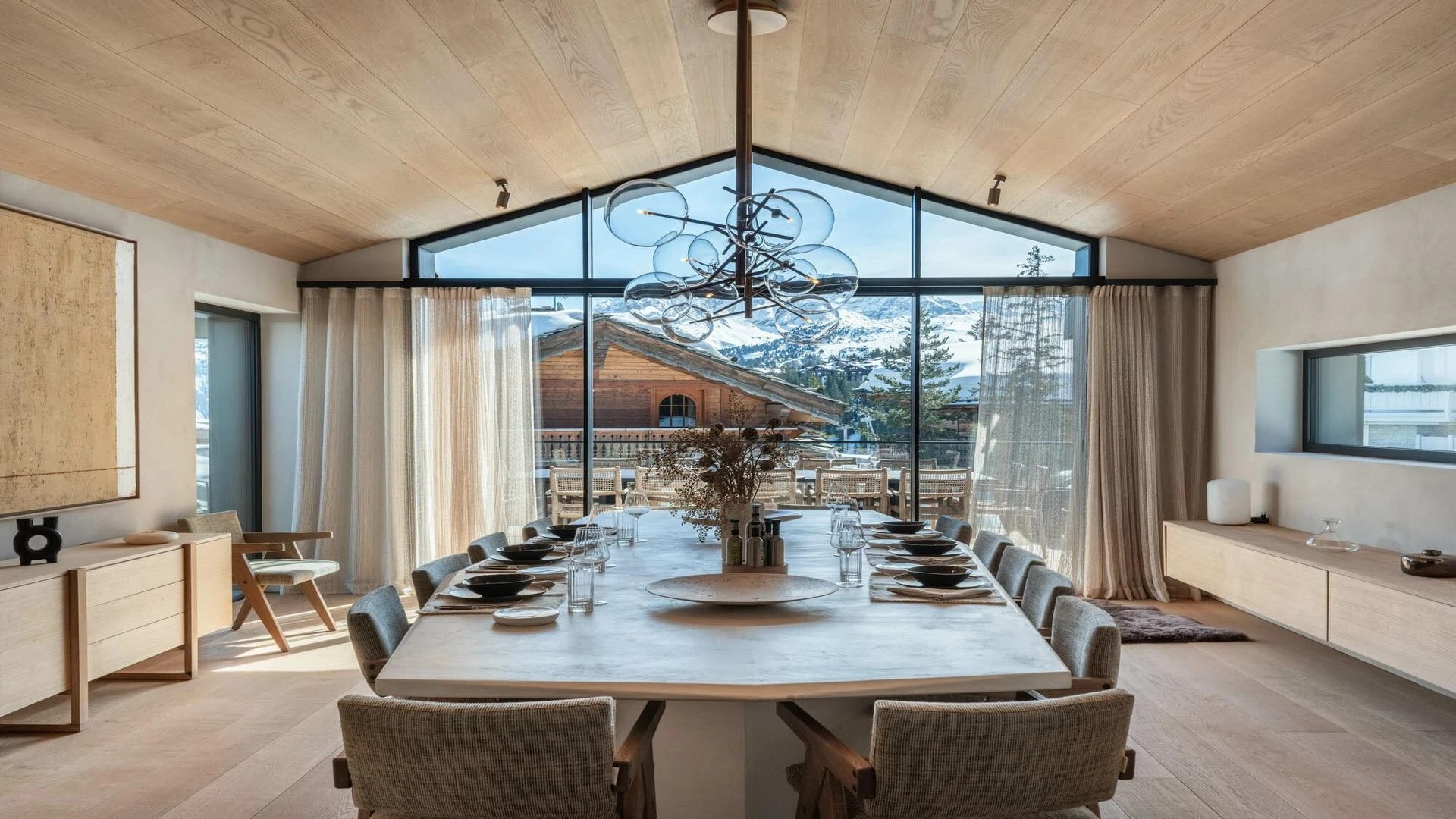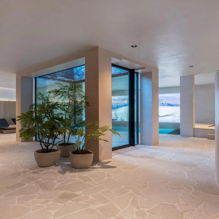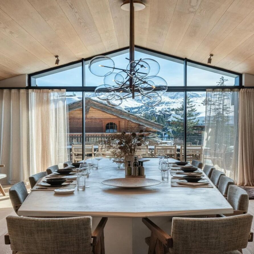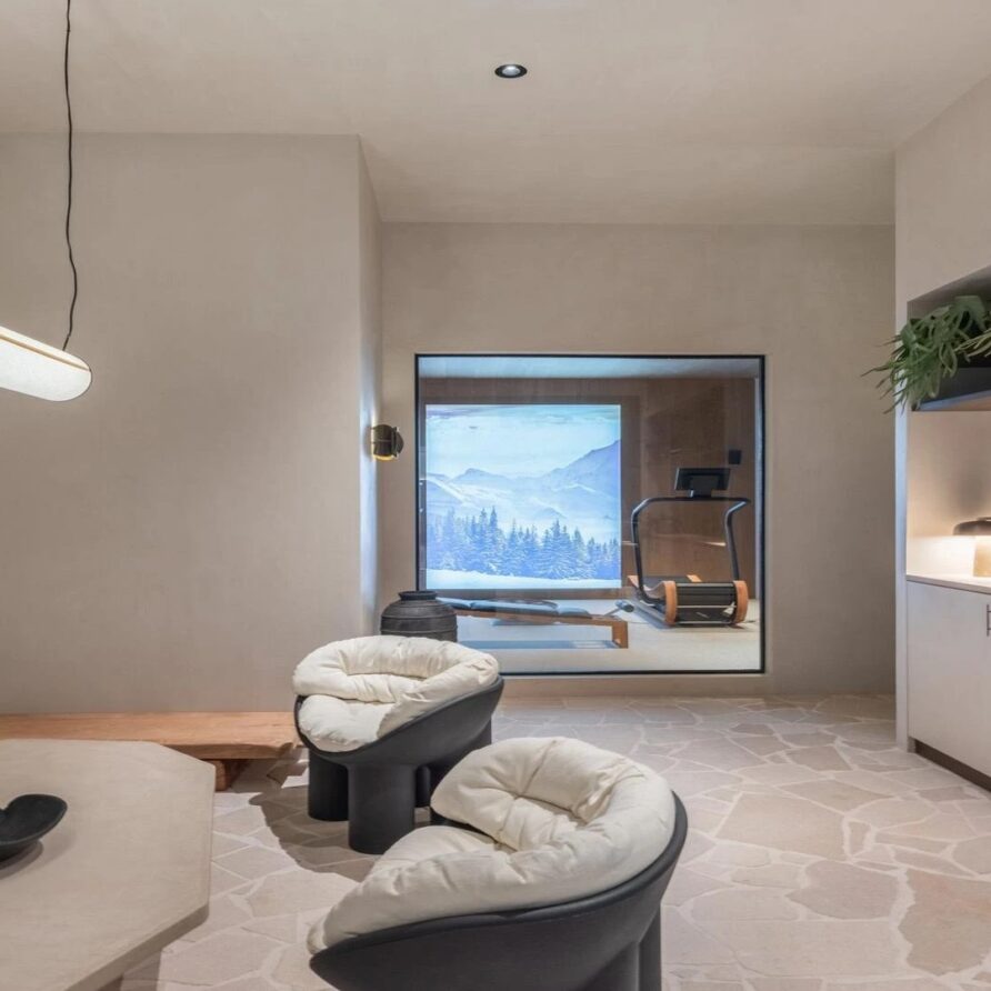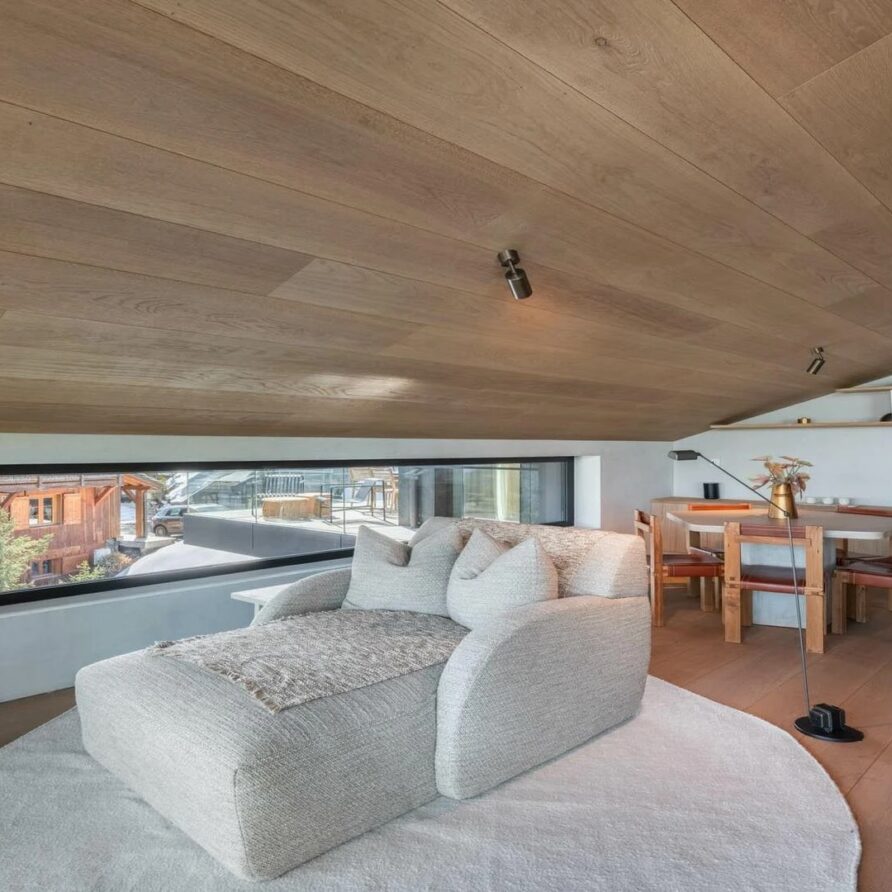 Socializing and entertainment are seamlessly integrated into the chalet’s design. A stylish bar provides a chic space for guests to enjoy handcrafted cocktails and unwind after a day of skiing in Courchevel. The lounge area offers a cozy retreat, ideal for intimate conversations or simply enjoying the warmth of the fireplace.