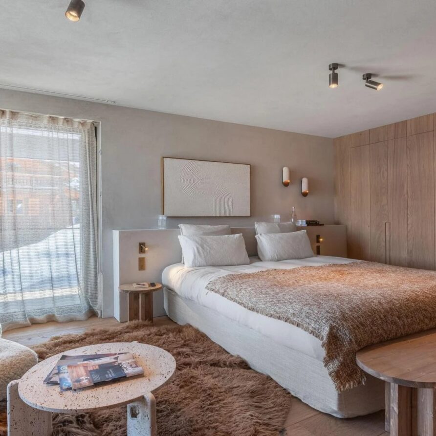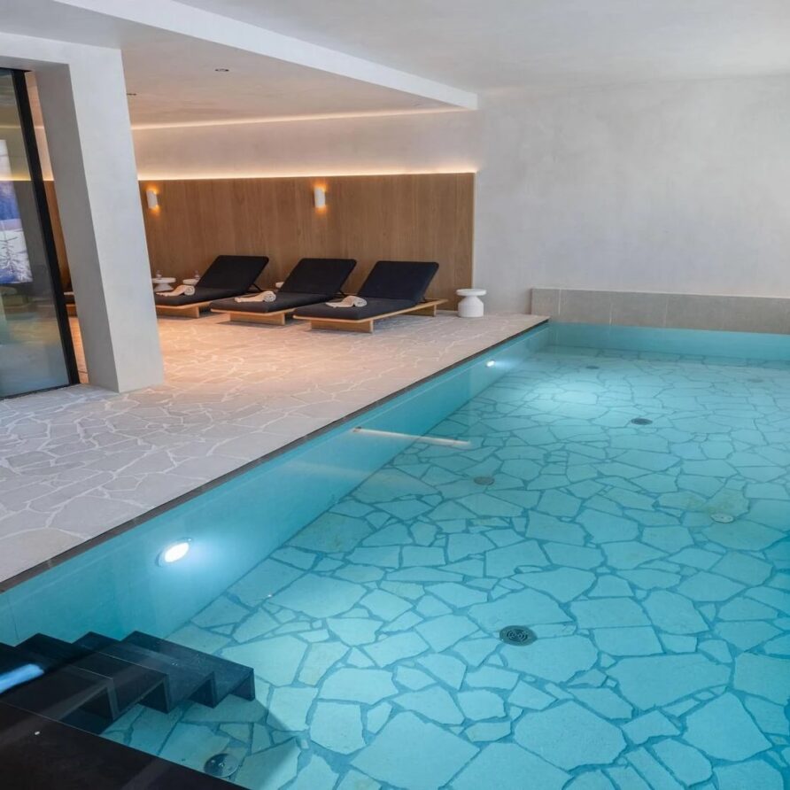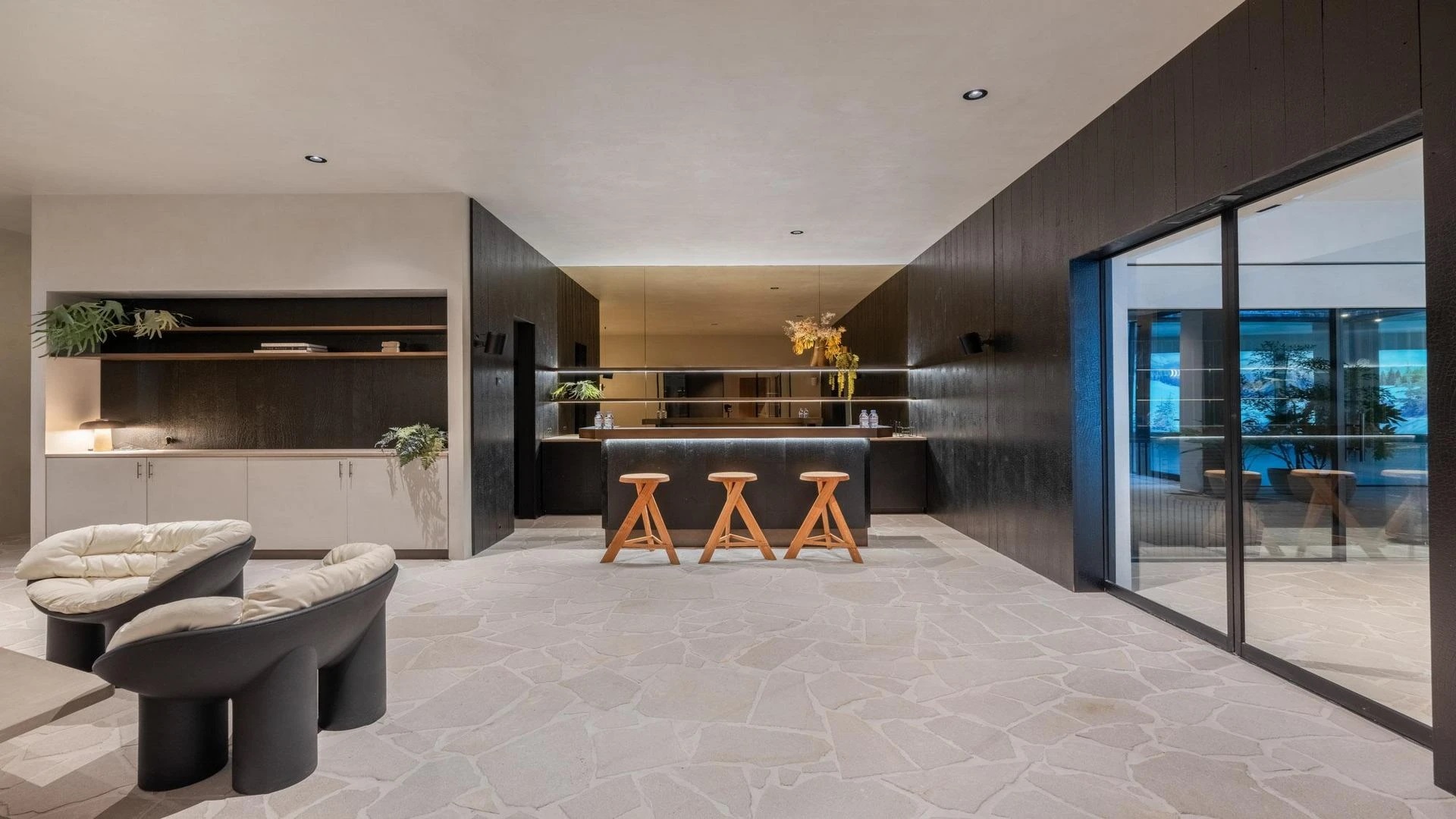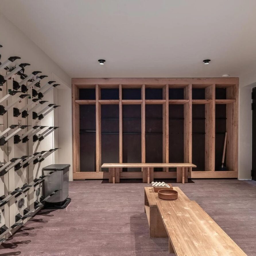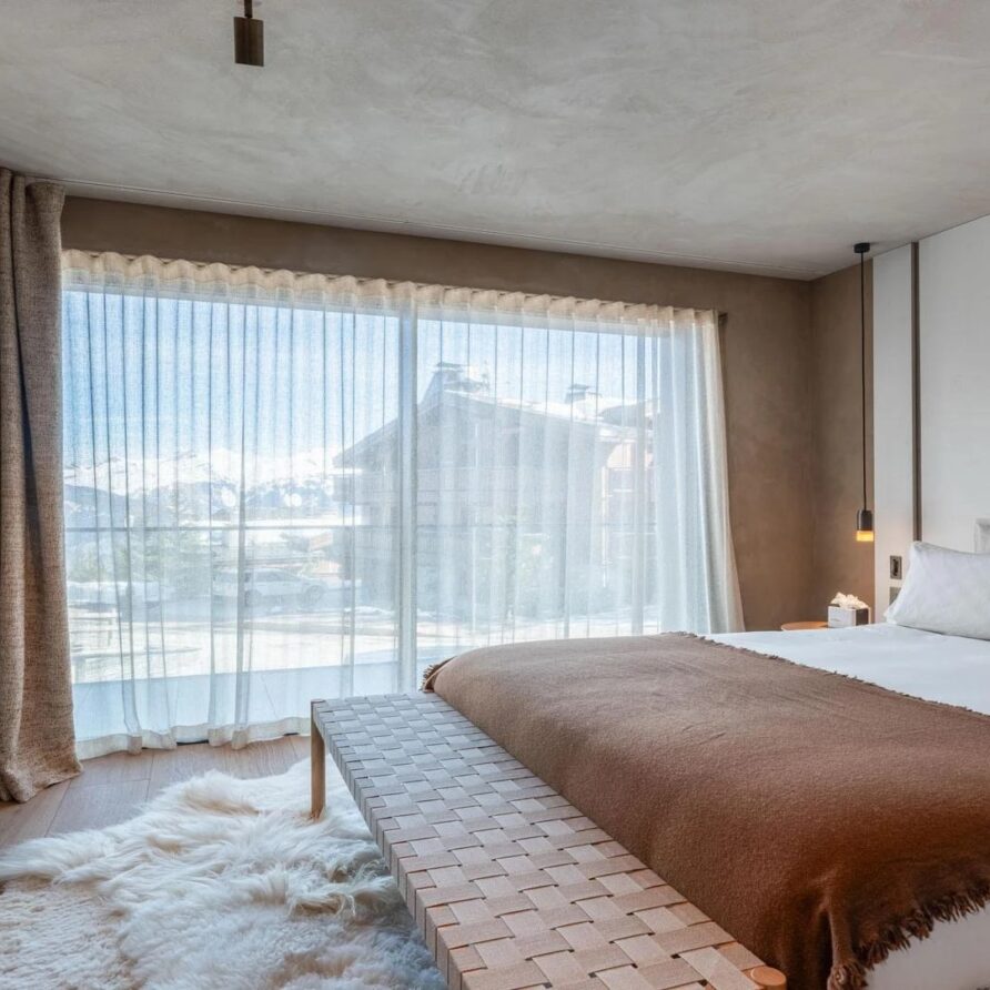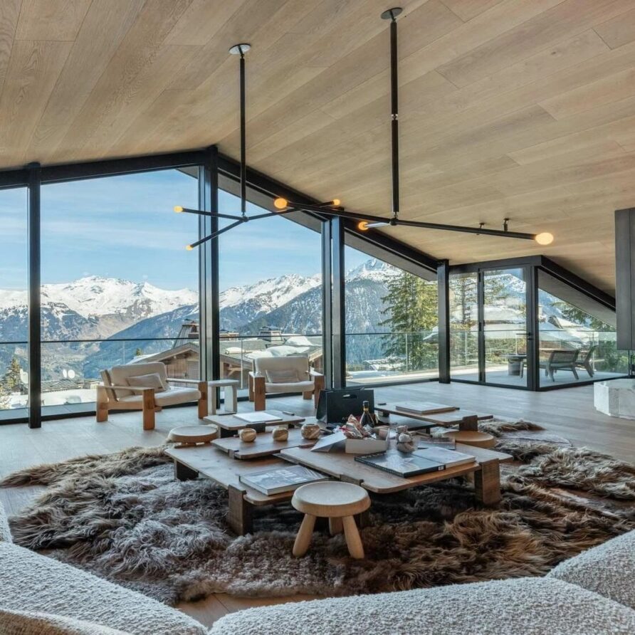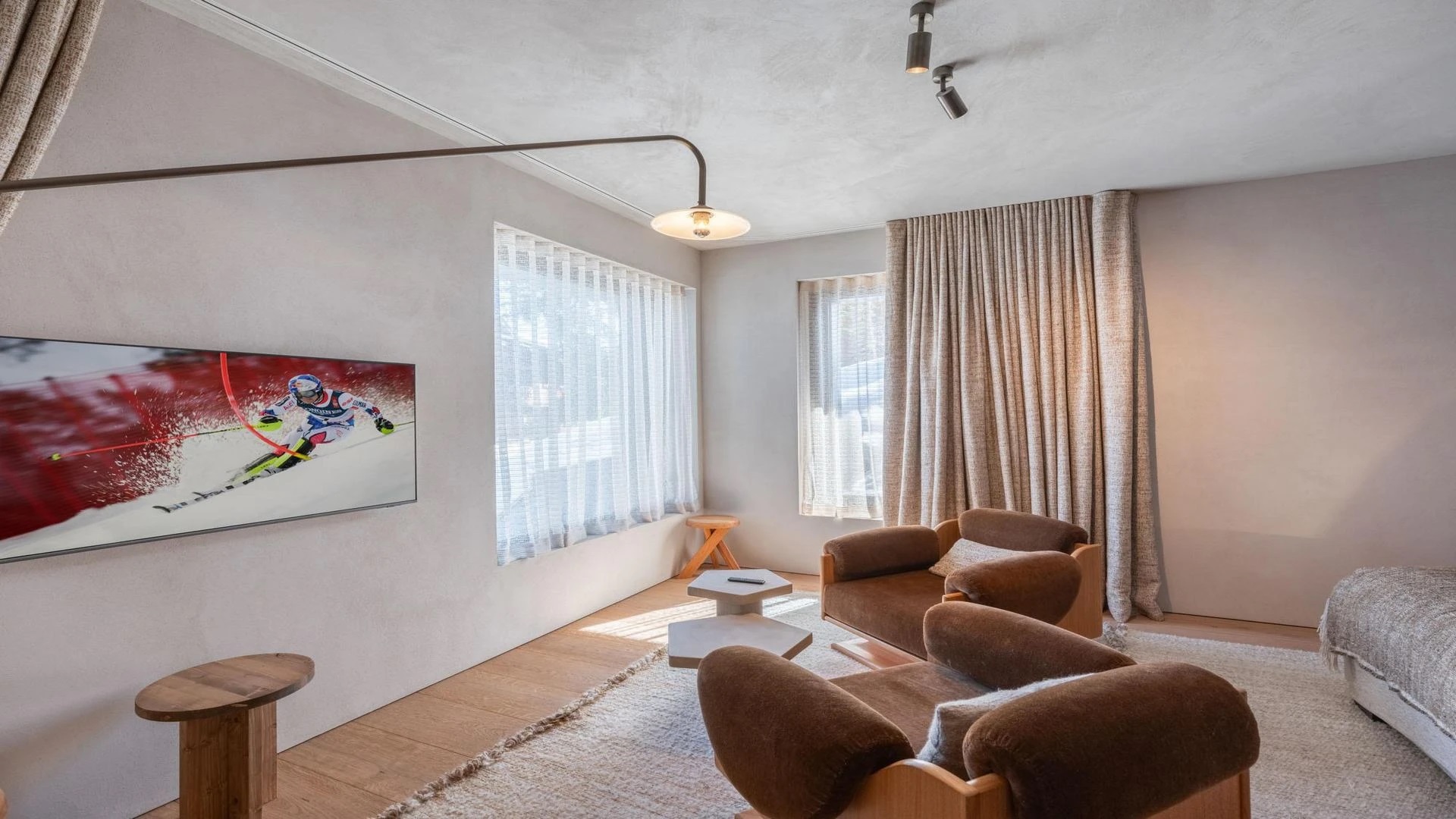Socializing and entertainment are seamlessly integrated into the chalet’s design. A stylish bar provides a chic space for guests to enjoy handcrafted cocktails and unwind after a day of skiing in Courchevel. The lounge area offers a cozy retreat, ideal for intimate conversations or simply enjoying the warmth of the fireplace.