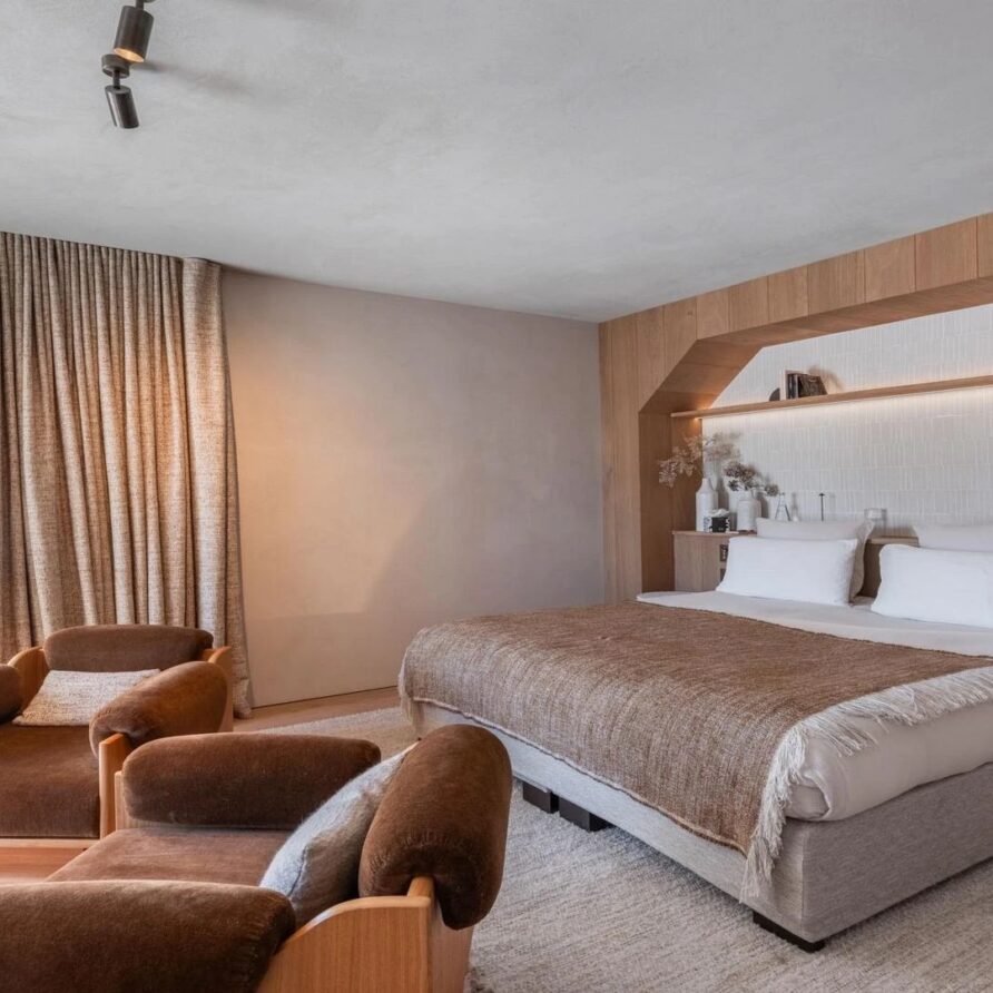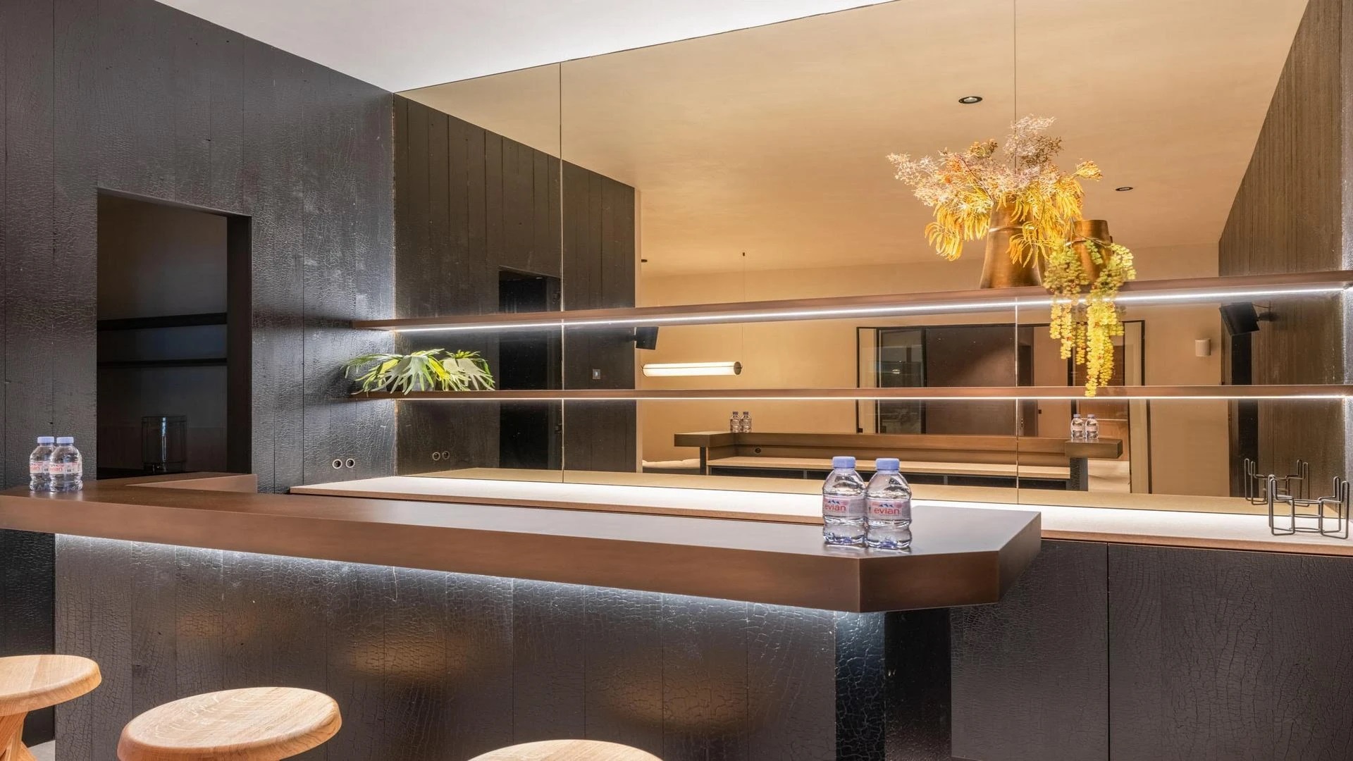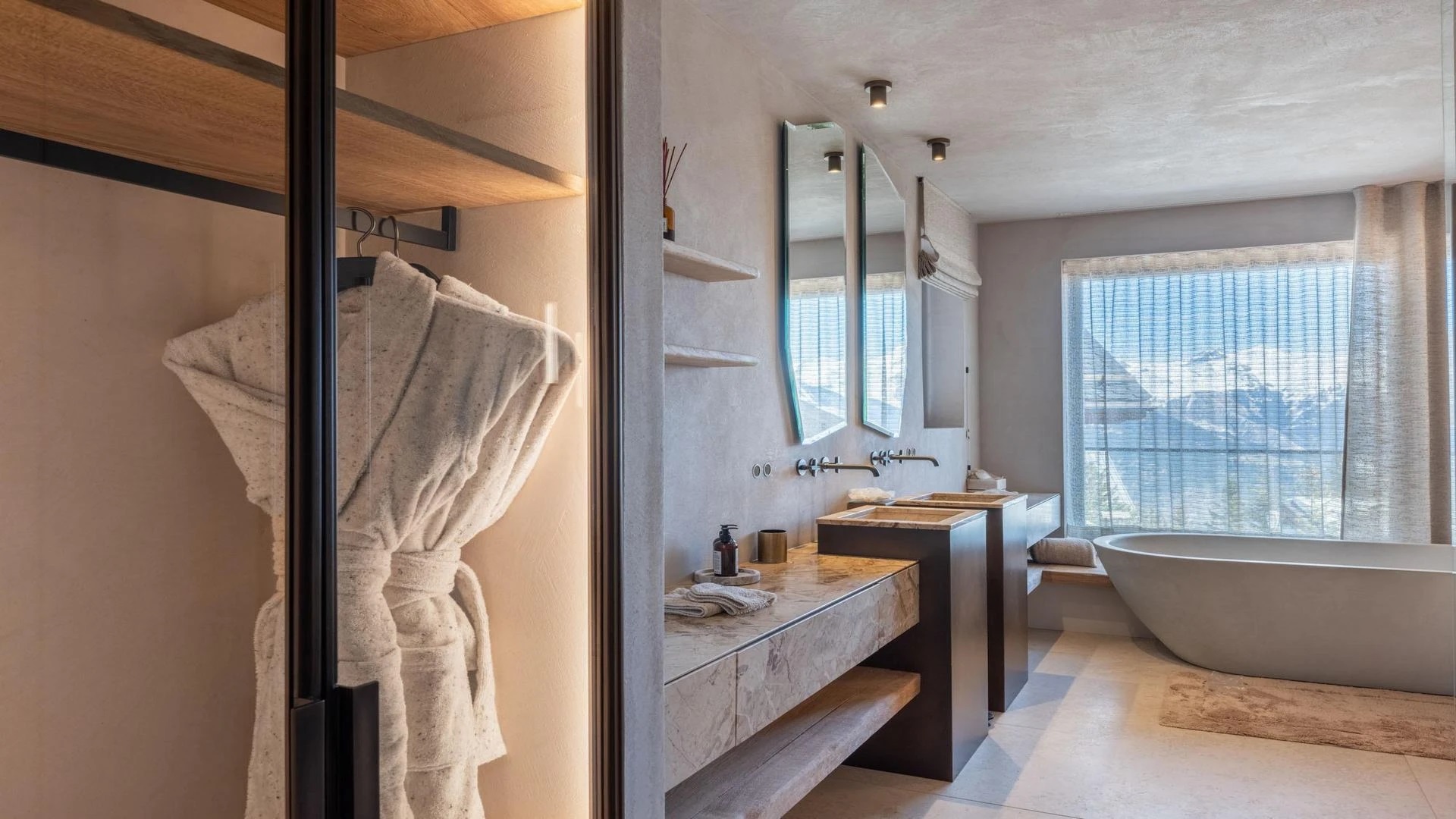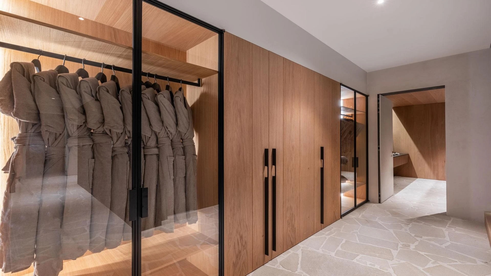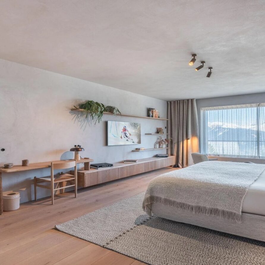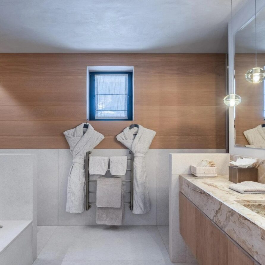 Socializing and entertainment are seamlessly integrated into the chalet’s design. A stylish bar provides a chic space for guests to enjoy handcrafted cocktails and unwind after a day of skiing in Courchevel. The lounge area offers a cozy retreat, ideal for intimate conversations or simply enjoying the warmth of the fireplace.