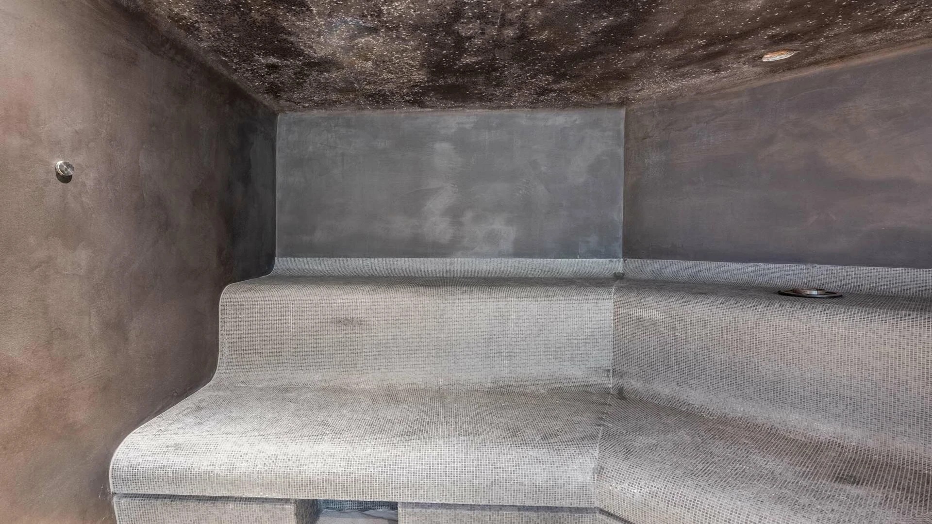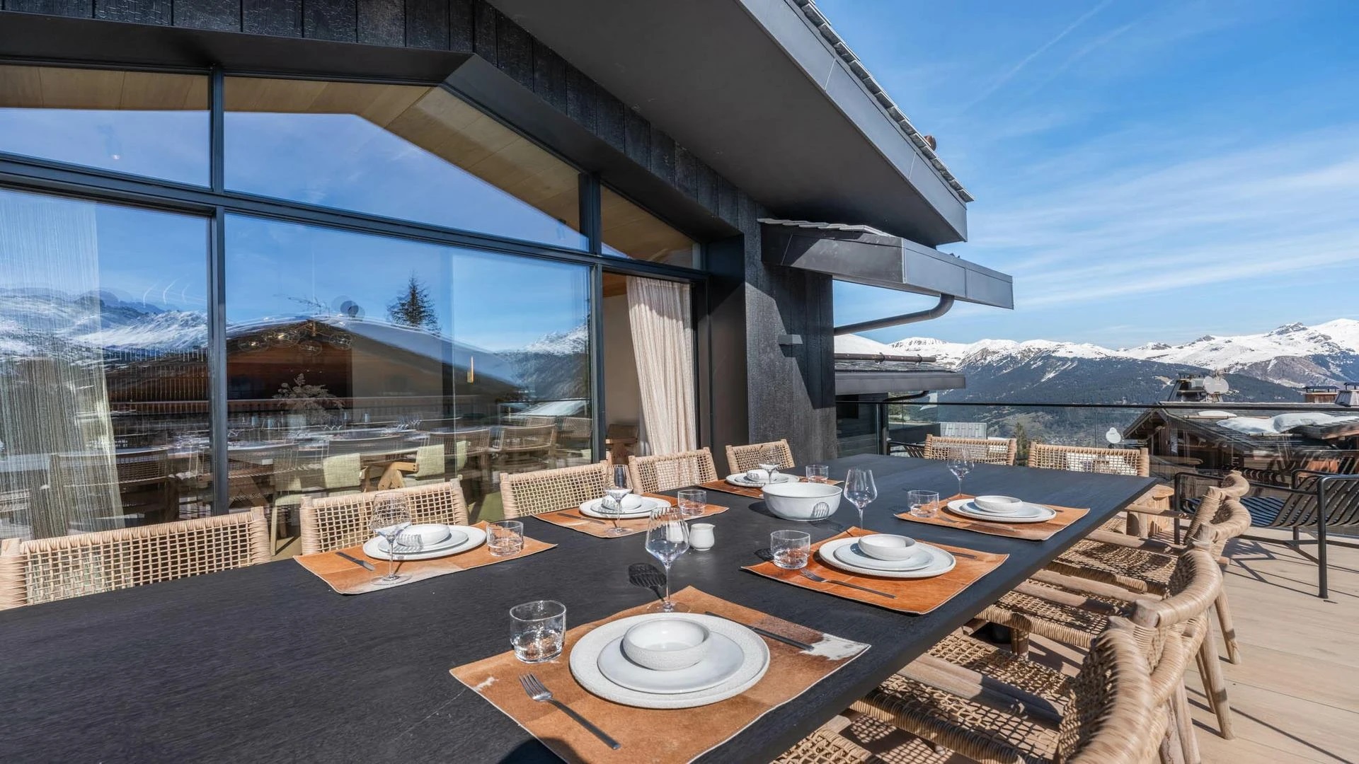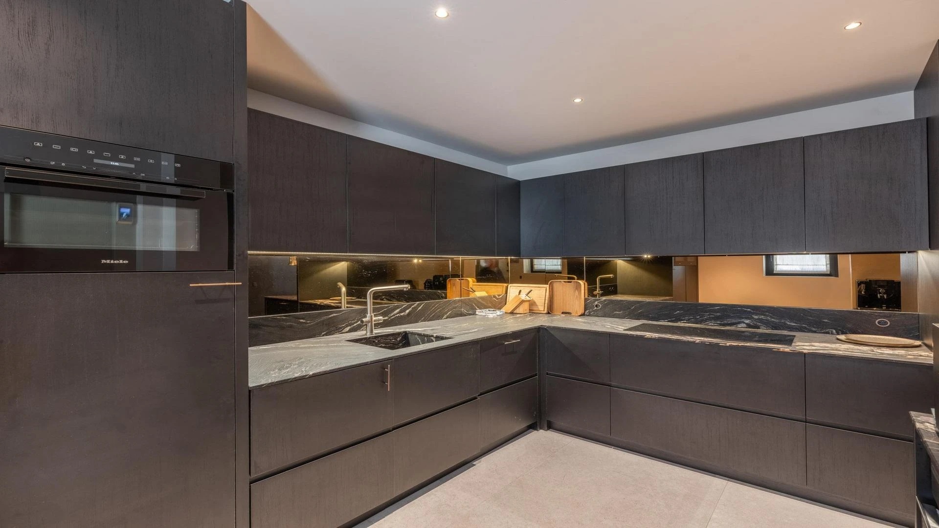The chic, bright and elegant living area is on the top floor. The large central glass fireplace and huge windows will impress any guest, and there is a bar where you can have a cocktail or a glass of champagne before dinner and chat with family or friends about your day on the slopes. A reading area and dining area with a large table for all guests complete the spacious living area. From everywhere you have a stunning view of the mountains and the surrounding landscape. A large furnished terrace can be accessed from the living room and is ideal for having a meal outside on warmer days or just relaxing and enjoying the sun. The kitchen is equipped with high quality appliances and can be closed off from the living area, plus there is a second professionally equipped kitchen.