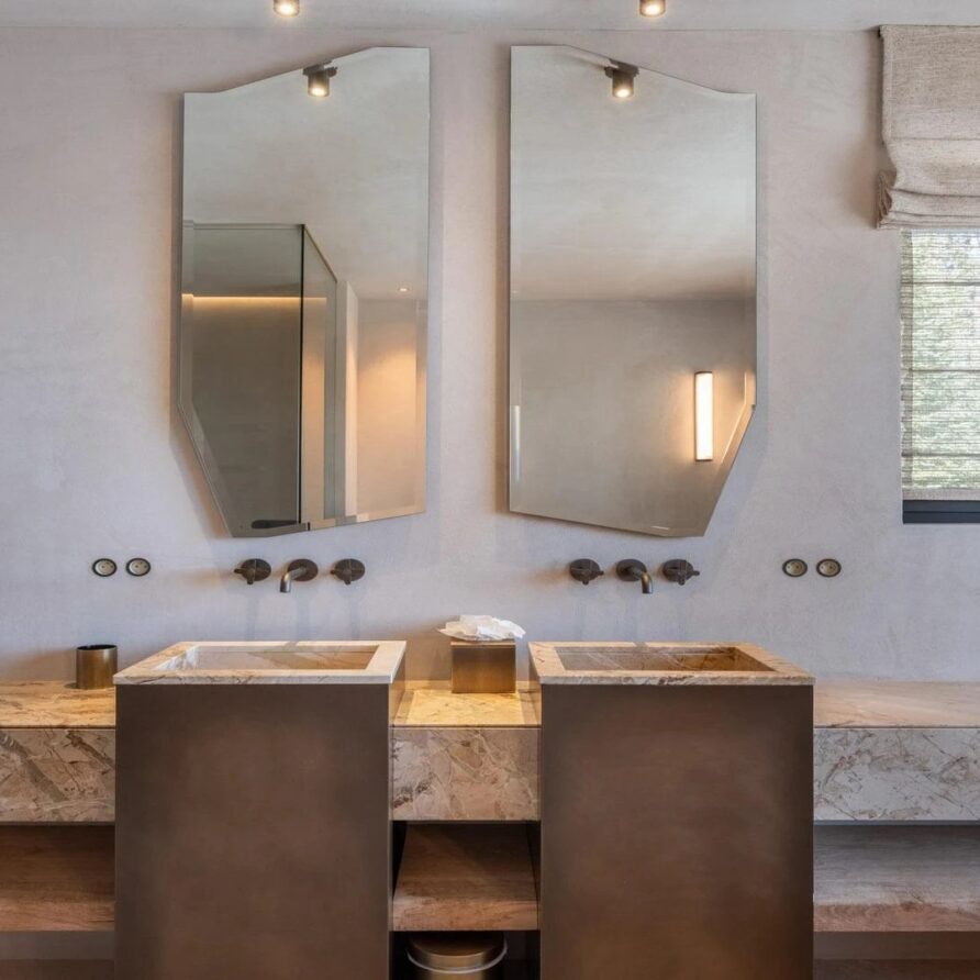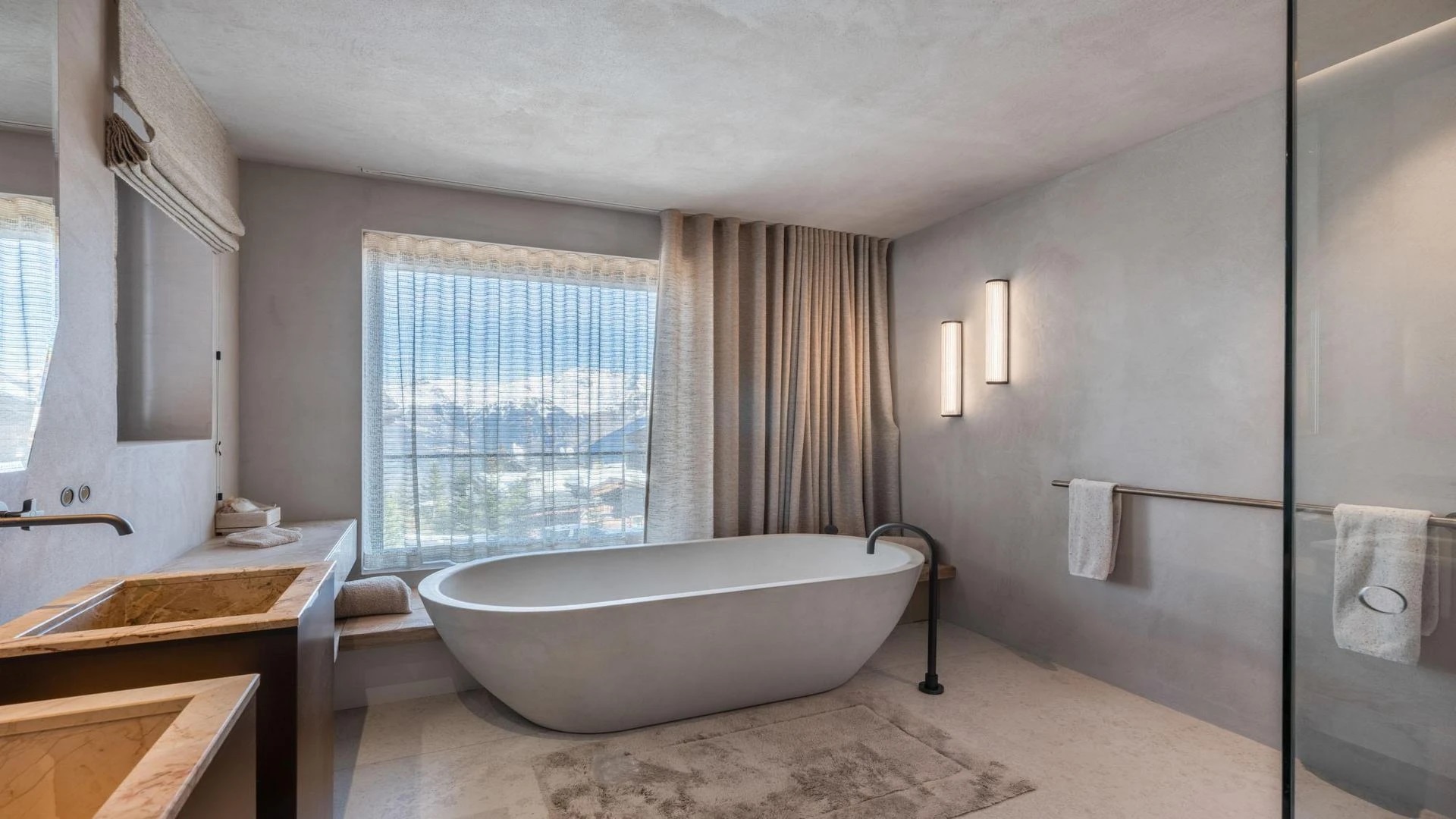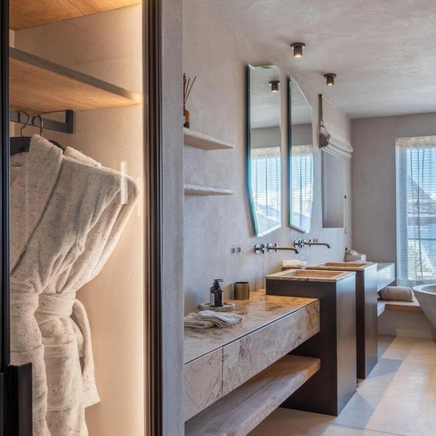The chalet is a south-facing new luxury ski chalet in Courchevel 1850. The chalet is flooded with light, modern and furnished with the finest materials. The chalet is on 5 floors with a lift connecting the levels. The chalet offers ample space for 14 people, as there are 7 en-suite bedrooms, 5 of which have access to a terrace or balcony.