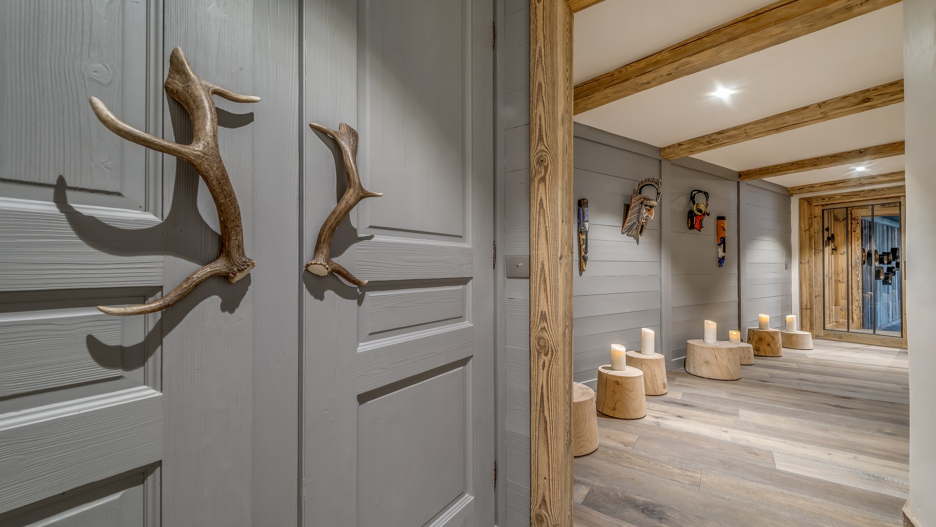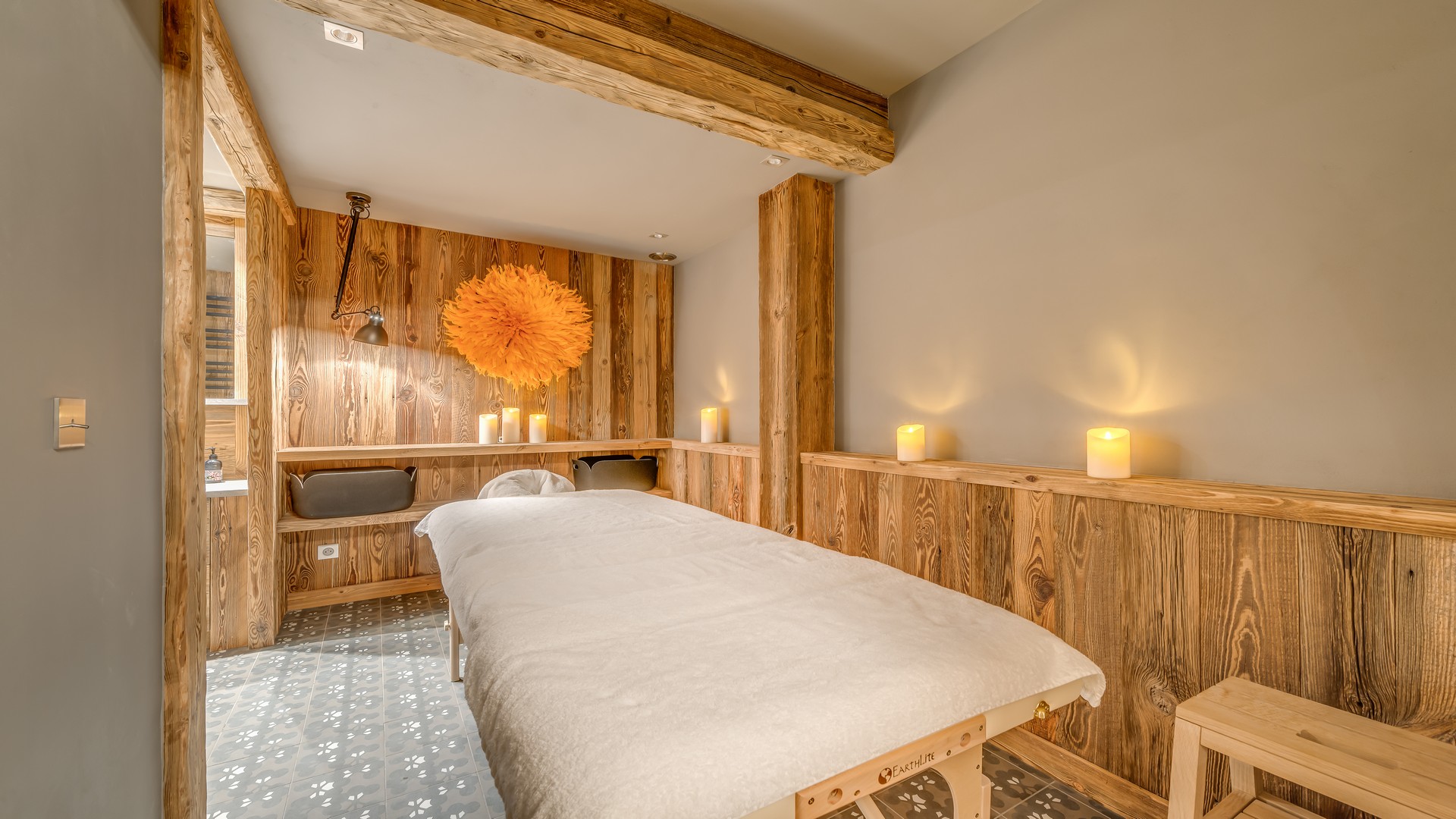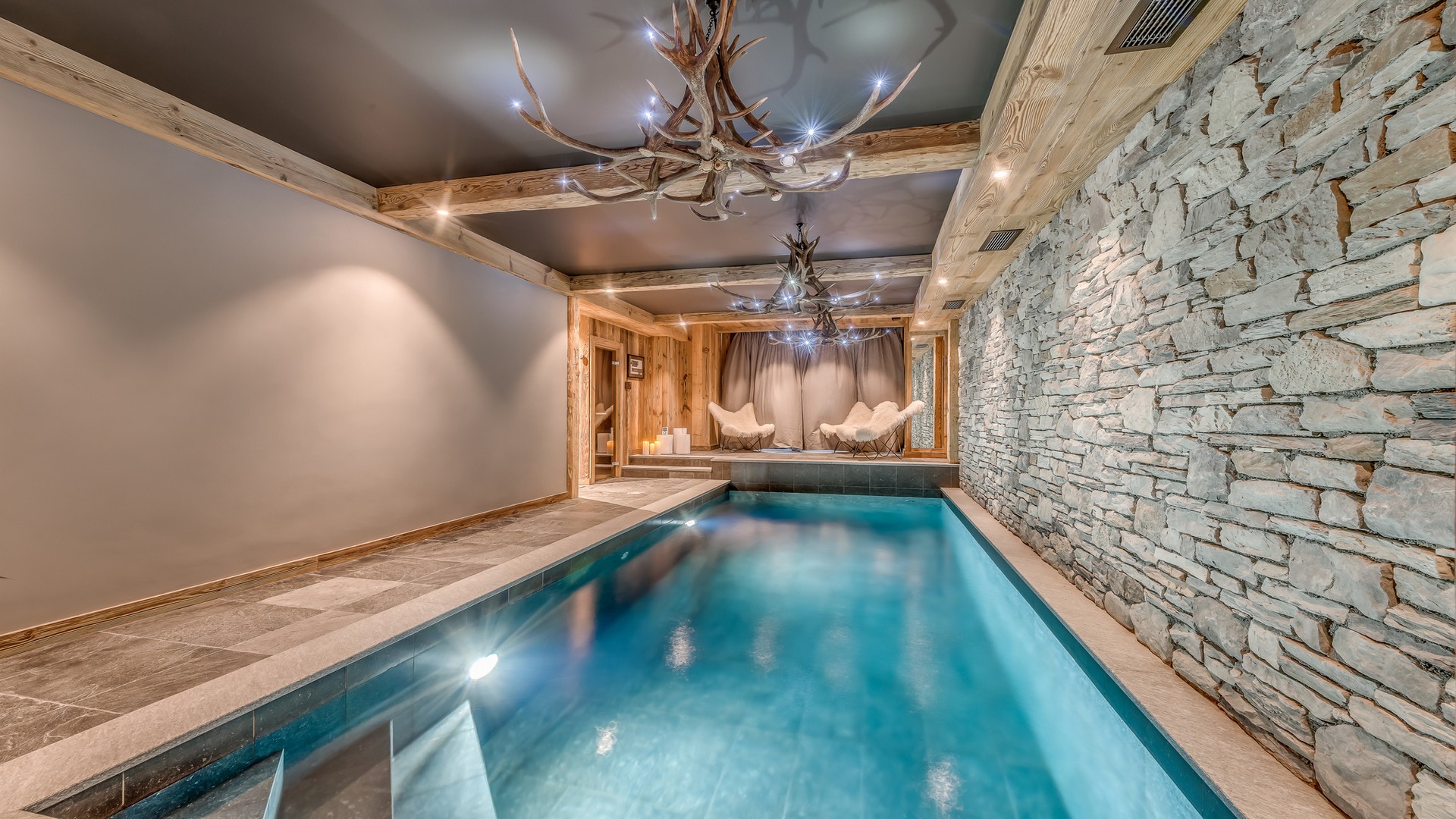 The lowest floor of the chalet holds a further 150sqm of floor space consisting of a sauna, a massage room and a stunning pool and relaxation area. The main garage is also on this level where you will find the ski room and boot warmers.