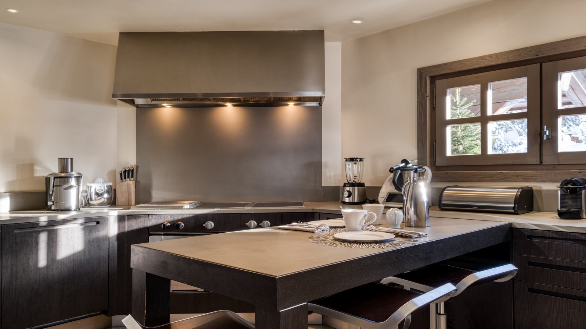 An impressive chalet houses grand interiors inside the chalet, where a magnificent, light-filled living area can be found on the first floor. A refined, contemporary finish shines under the light pouring through the chalet’s large windows. Leading out of these sliding double doors, guests will find a balcony, furnished with outdoor seating and a table, perfect for soaking up the sun, alfresco dinners or gaining a closer look at your surrounding views. Back inside, the chalet living spaces are split into three distinct sections. On one side, a homely sofa lounge corner can be found, adjacent to a fireplace. Towards the other side of this room is a large dining table, positioned under hanging lights and antlers, the perfect setting for your evening meals. The chalet’s fully-equipped kitchen, next to the dining table, will provide plenty of space for your nominated cook to prepare your evening meals, before enjoying your meals as a whole group.