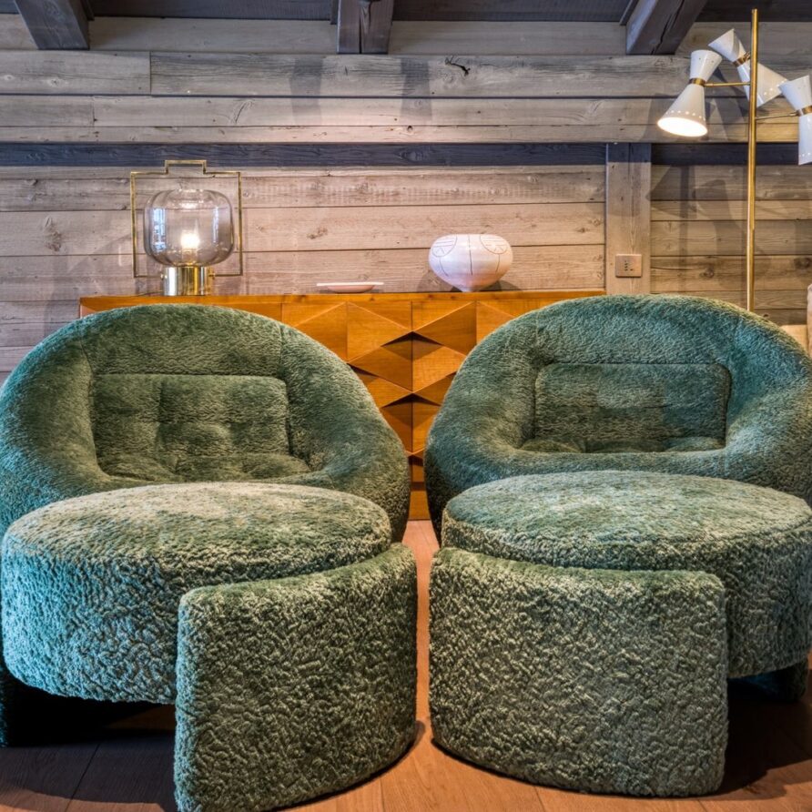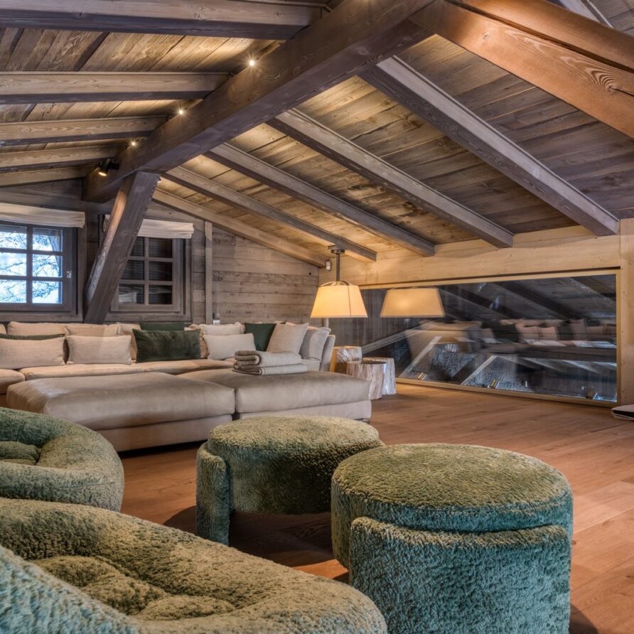 The chalet mezzanine floor is home to a cosy reading/TV snug. Found in the eaves of the property, above the main living area, here lies a comfortable space to relax to the TV, seated on sumptuous sofas or welcoming armchairs. In view of the swimming pool, it’s the perfect spot for adults to enjoy a good book whilst keeping a watchful eye on younger members in the wellness area down below. There is also an additional TV snug area, with a football table, offering an ideal hideaway for teenagers or for those who wish to catch up on their latest series in more privacy.