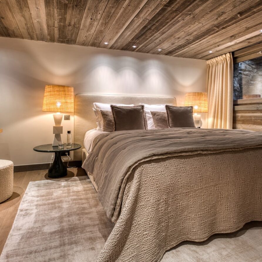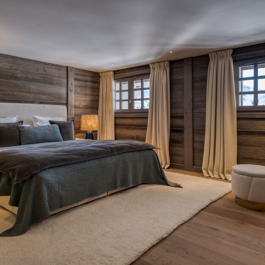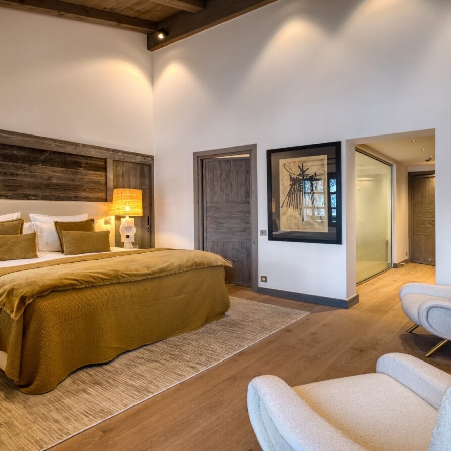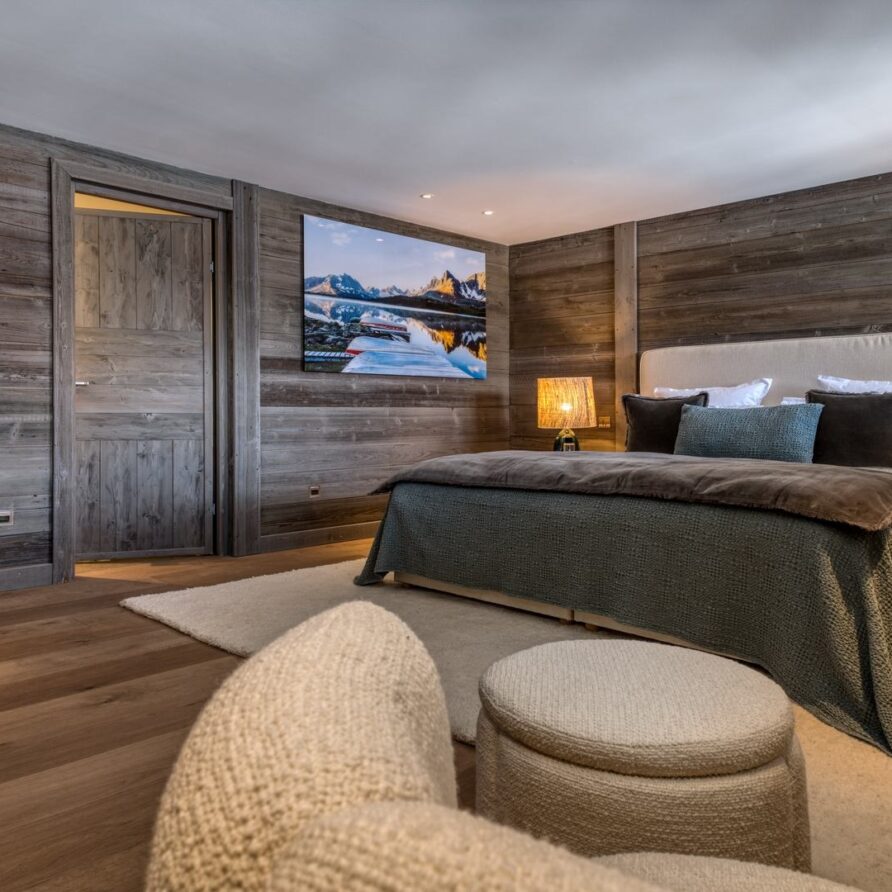The chalet accommodates groups of 12 guests amongst its 6 delightful bedrooms. The main bedroom floor is the chalet’s garden level, where all except the master bedroom are found. Lovingly finished with natural materials, such as wood, leather and sheepskins, these private settings present a real luxury cocoon to unwind in at the end of the day, with beautifully complemented en-suite bathrooms, rivaling those found in luxury boutique hotels. The chalet first floor is home to the master double bedroom. Featuring plenty of space, this bedroom also has the additional luxury of direct access to the wellness area, leading on through the bedroom’s en-suite facilities.