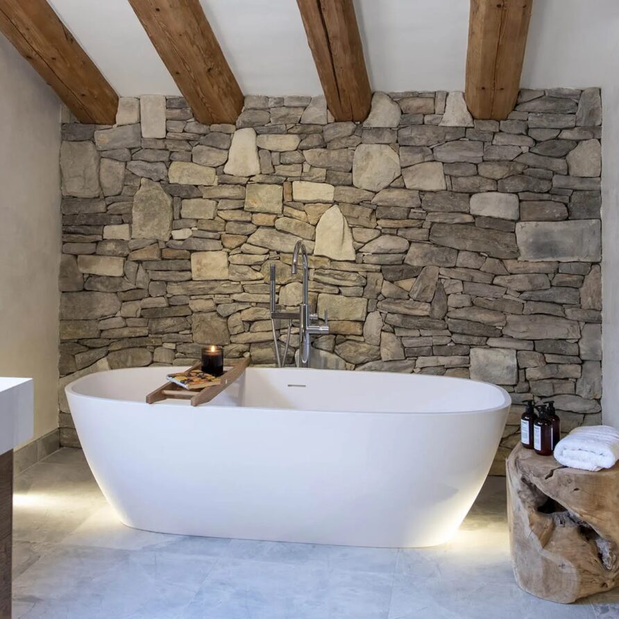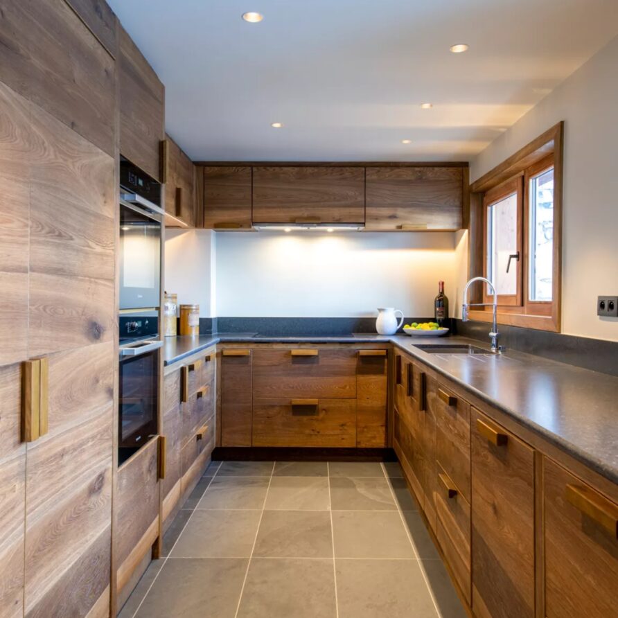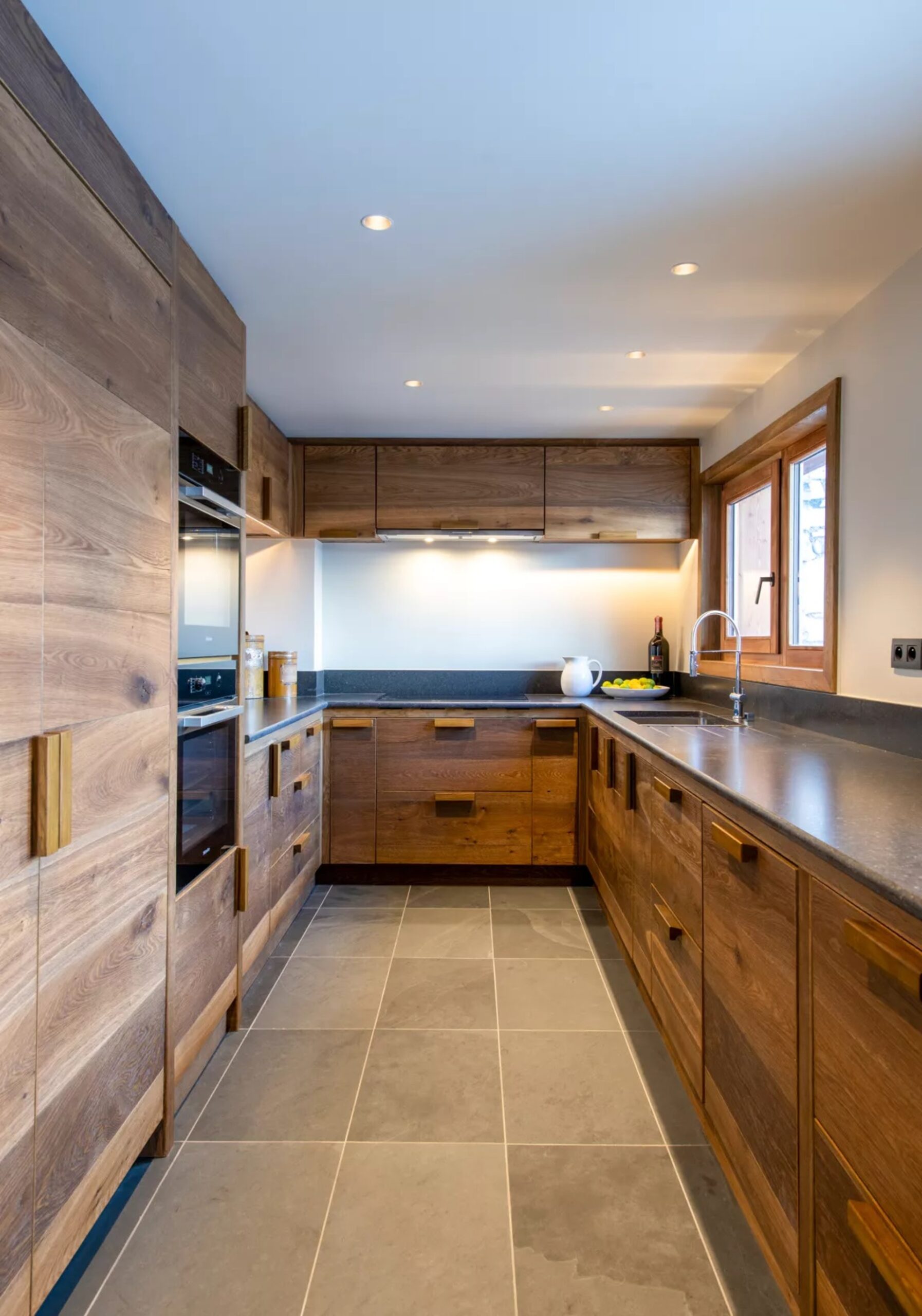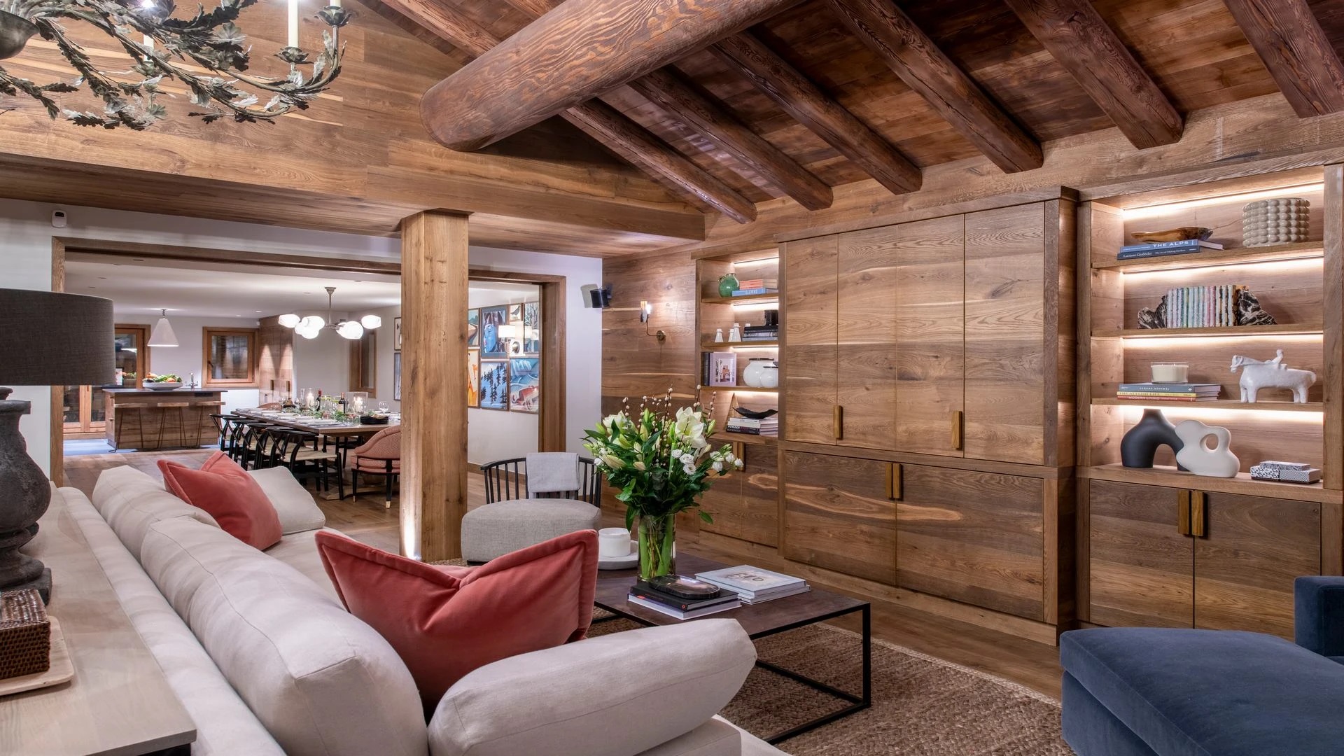 The first floor is dedicated to entertaining. The stunning living area, with double height ceiling, exposed beams, grand fireplace and striking chandelier giving real wow factor. Two sumptuous sofas sit back-to-back; one side allowing you to hunker down in front of the roaring fire and the other giving you the option to play board games with the family. The room is flooded with light from the double height windows, framing the impressive views of the mountains beyond.