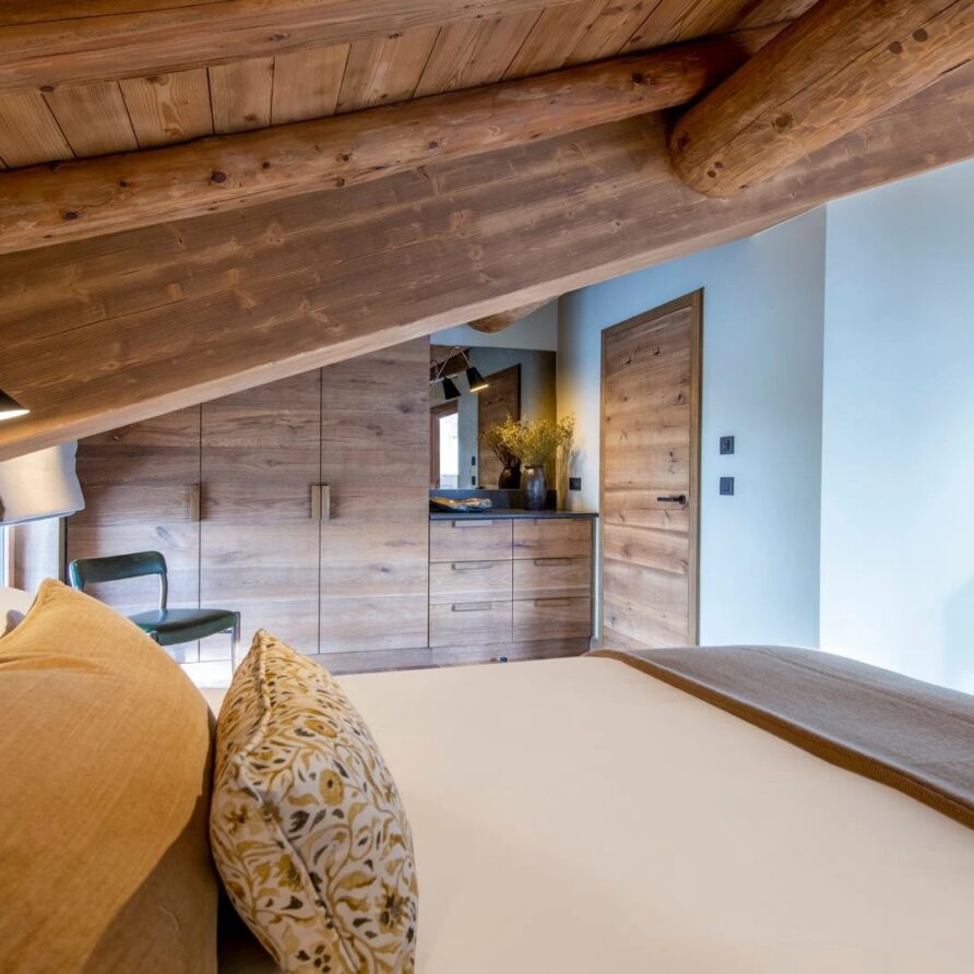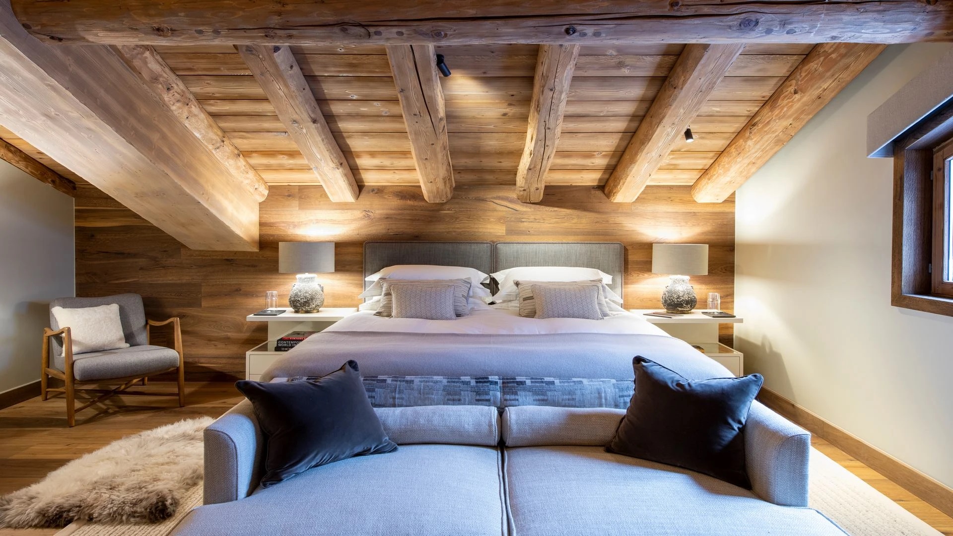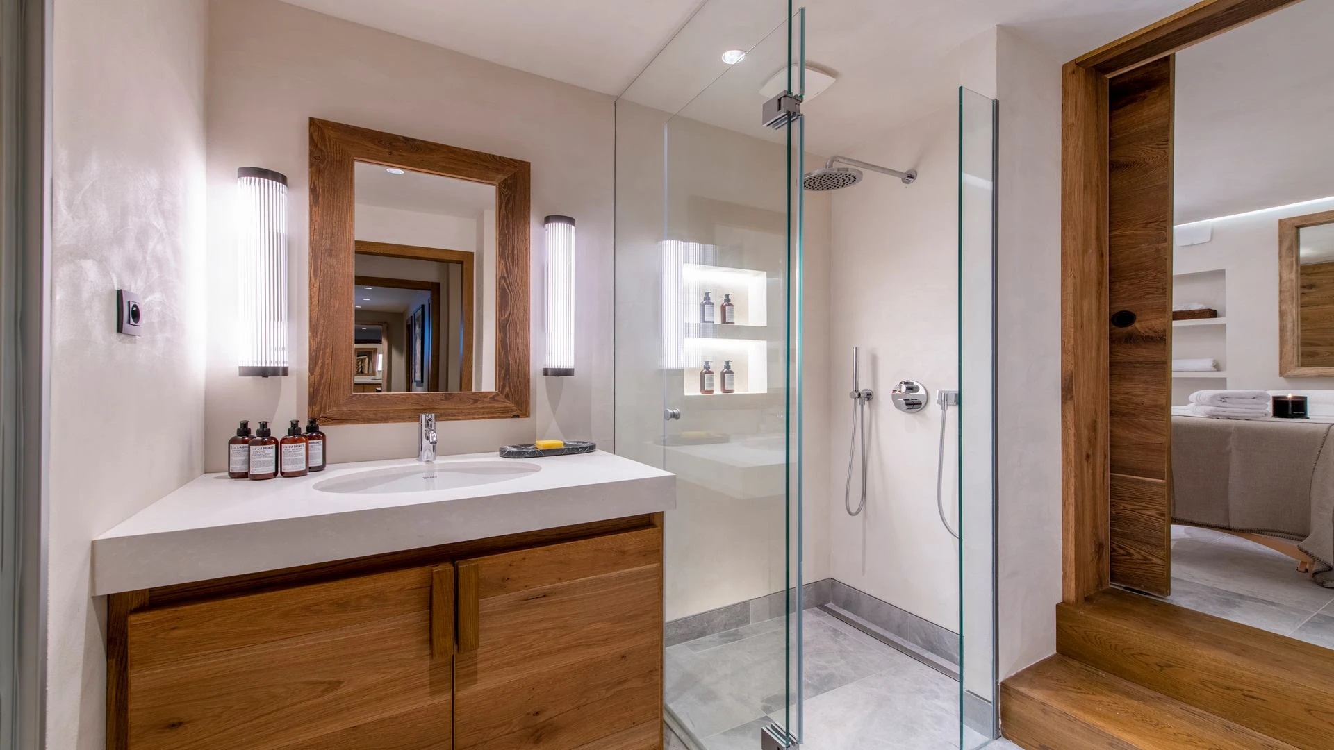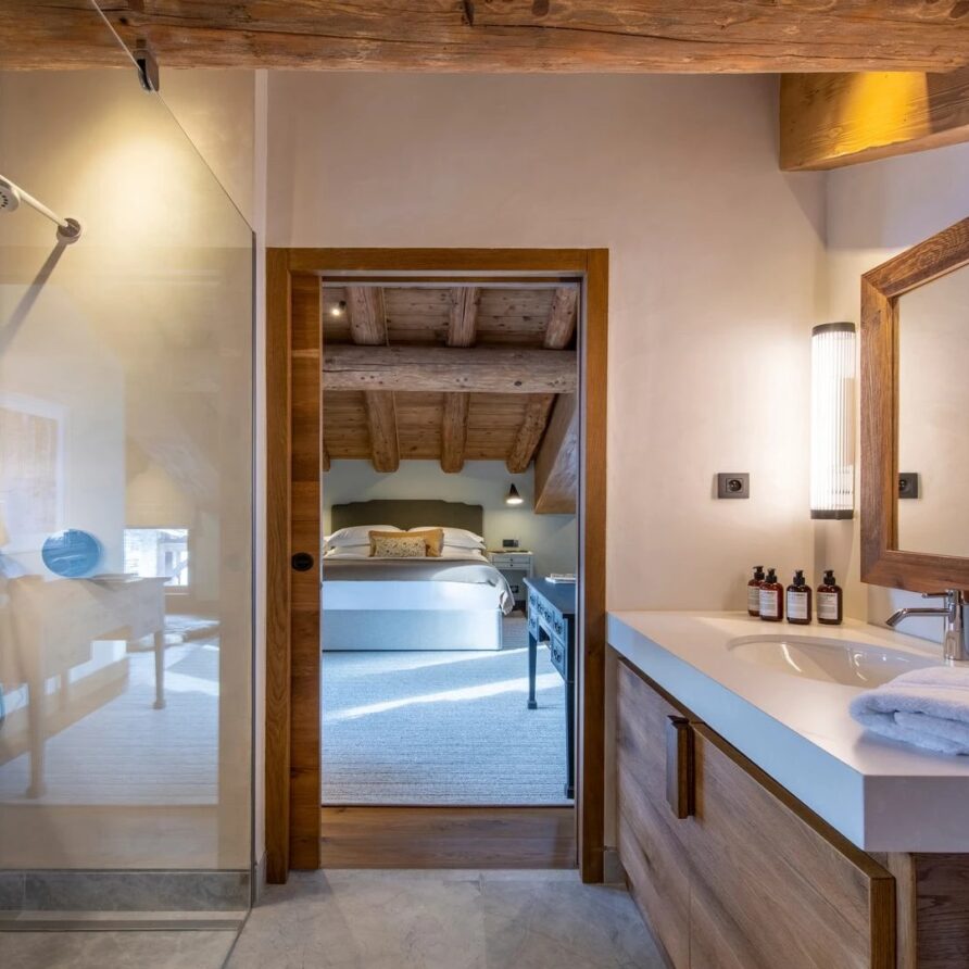 The staircase leads up to the top floor where you will find the two-impressive master double bedroom suites. The first master bedroom with en-suite bathroom and separate shower, has a private balcony. The second master suite comes with en-suite bathroom and separate shower. Both bedrooms have a tranquil and calm atmosphere and will leave you feeling rested and ready for a day on the slopes.