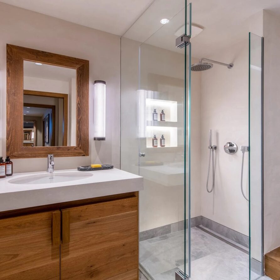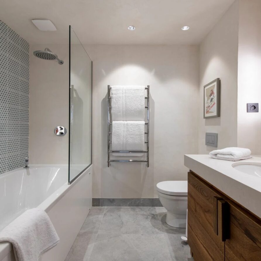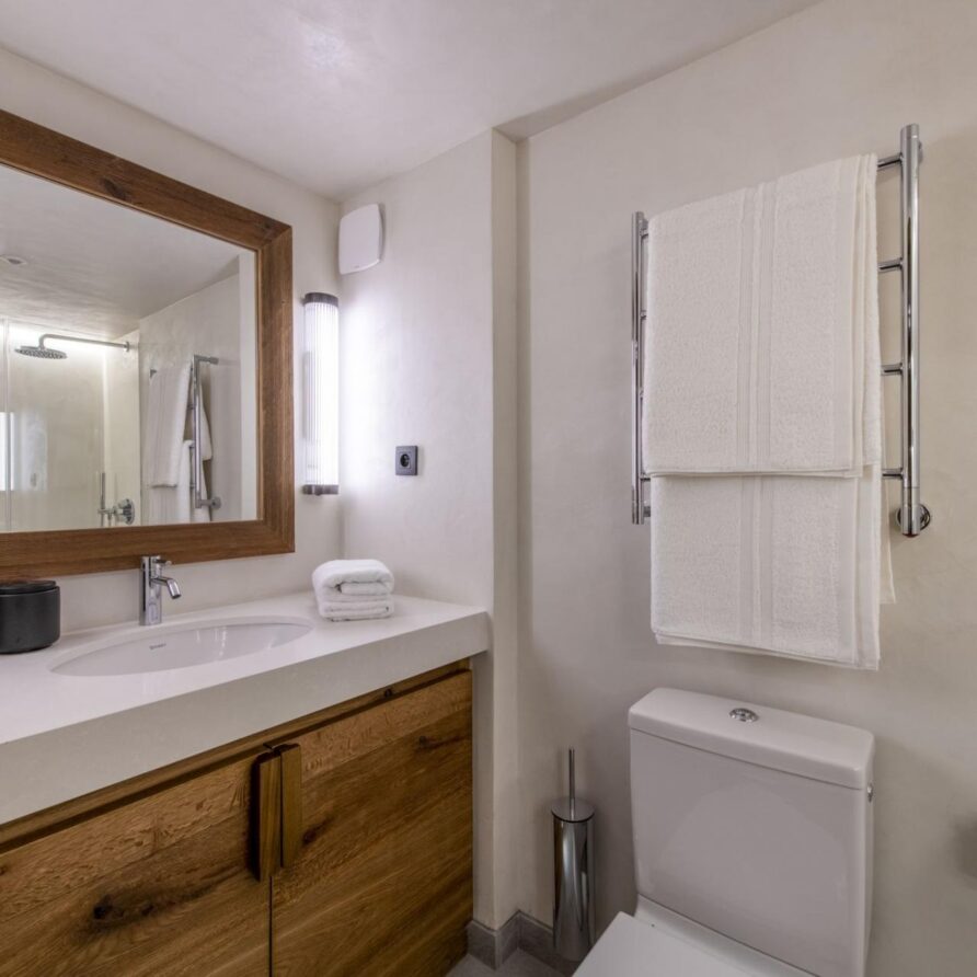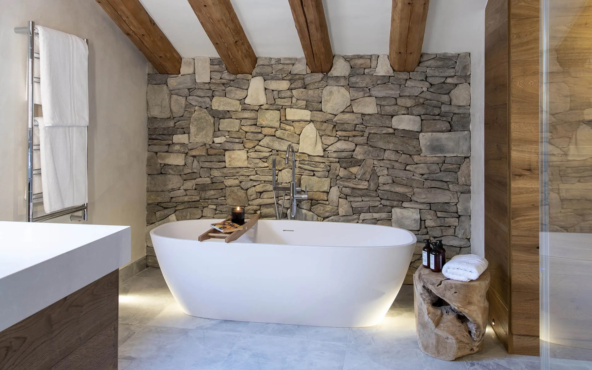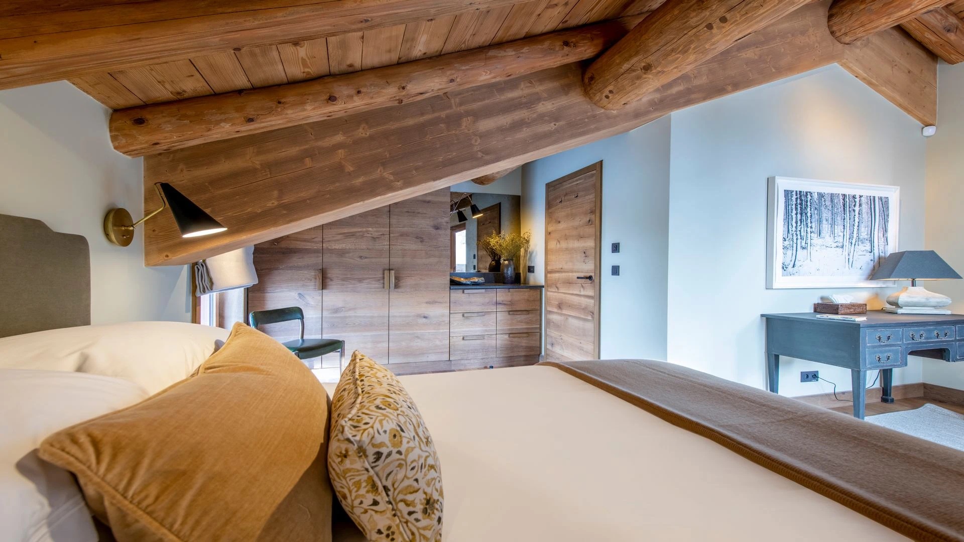 The staircase leads up to the top floor where you will find the two-impressive master double bedroom suites. The first master bedroom with en-suite bathroom and separate shower, has a private balcony. The second master suite comes with en-suite bathroom and separate shower. Both bedrooms have a tranquil and calm atmosphere and will leave you feeling rested and ready for a day on the slopes.