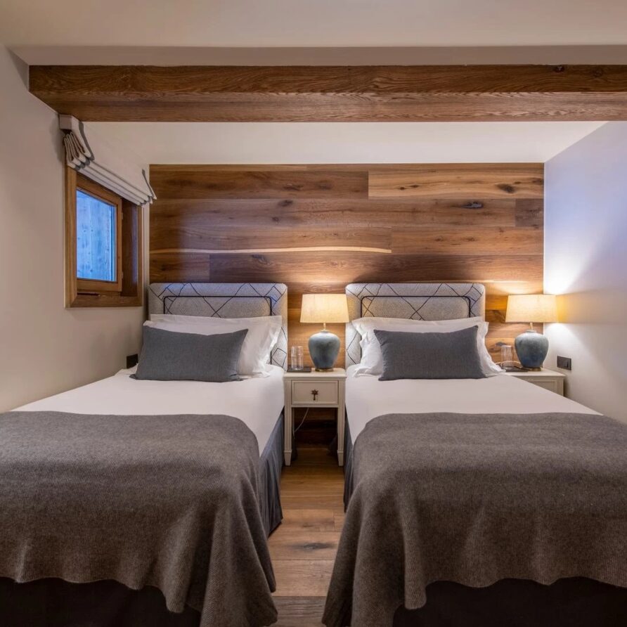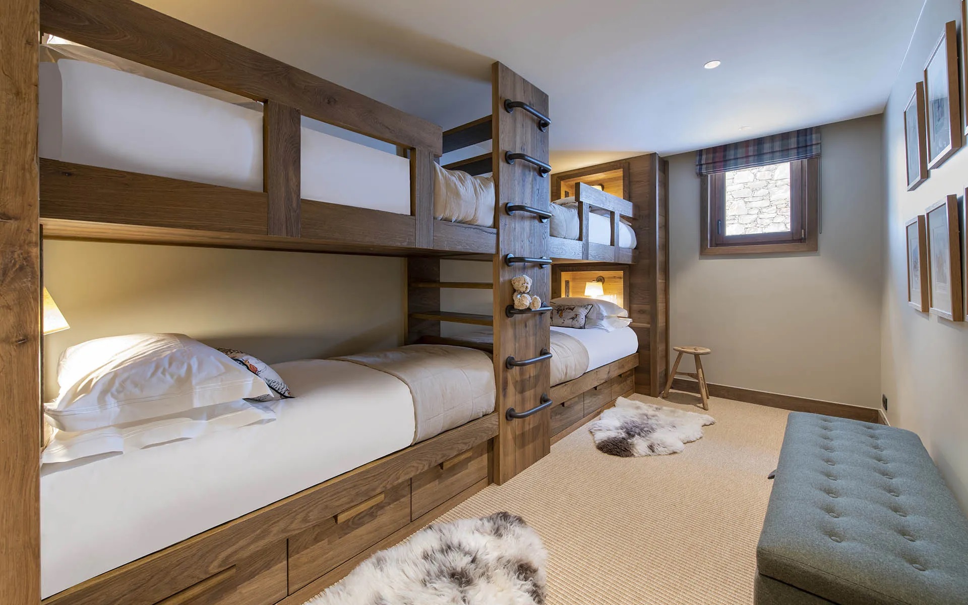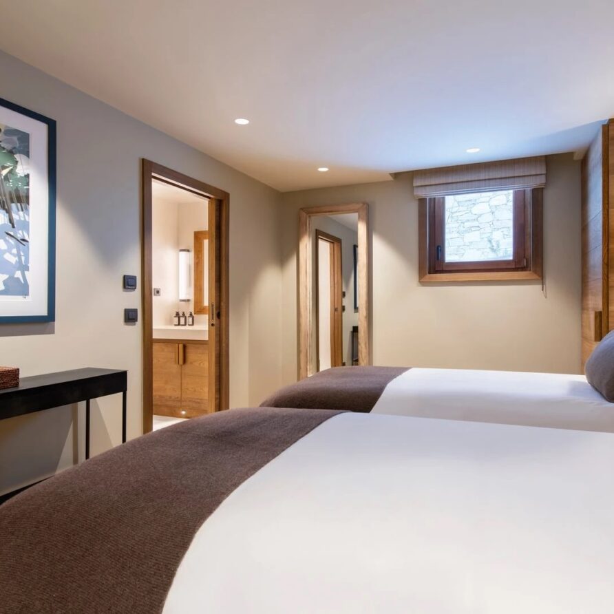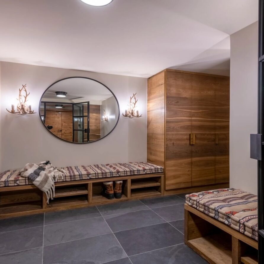 The entrance to the chalet is on the ground floor where you will find the ski and boot room, complete with heated boot warmers to ensure your ski boots are toasty and warm for a day on the slopes. On this floor, you will find three of the five bedrooms. There are two twin/double bedrooms with en-suite shower rooms. The third bedroom is a spacious quad bunk bedroom with en-suite bathroom. Also found on this floor is the chalet’s Hamman, rain shower and massage room, where you can relax and unwind after a long day on the slopes. The laundry room is on this floor too.