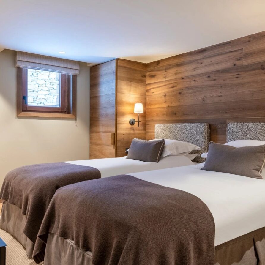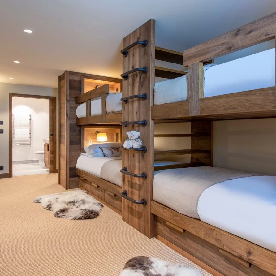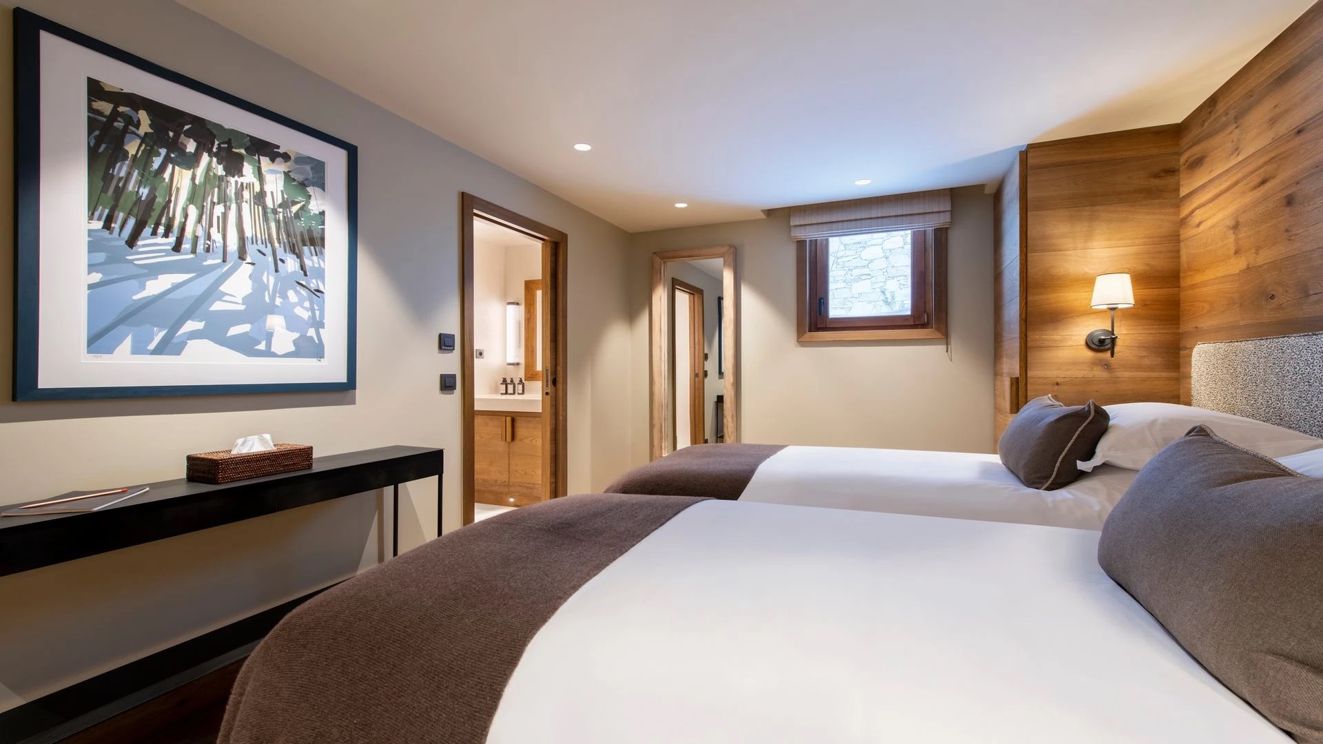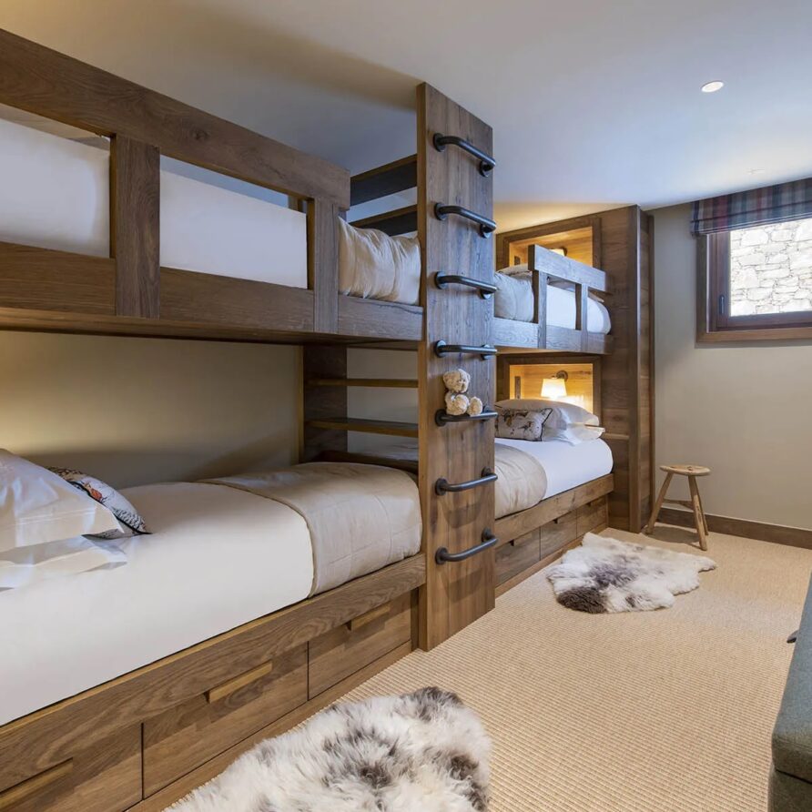 The entrance to the chalet is on the ground floor where you will find the ski and boot room, complete with heated boot warmers to ensure your ski boots are toasty and warm for a day on the slopes. On this floor, you will find three of the five bedrooms. There are two twin/double bedrooms with en-suite shower rooms. The third bedroom is a spacious quad bunk bedroom with en-suite bathroom. Also found on this floor is the chalet’s Hamman, rain shower and massage room, where you can relax and unwind after a long day on the slopes. The laundry room is on this floor too.