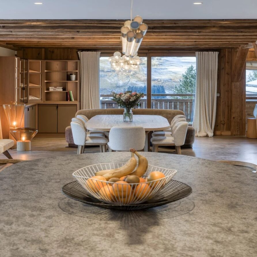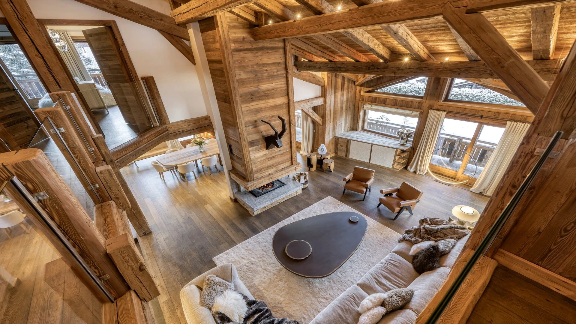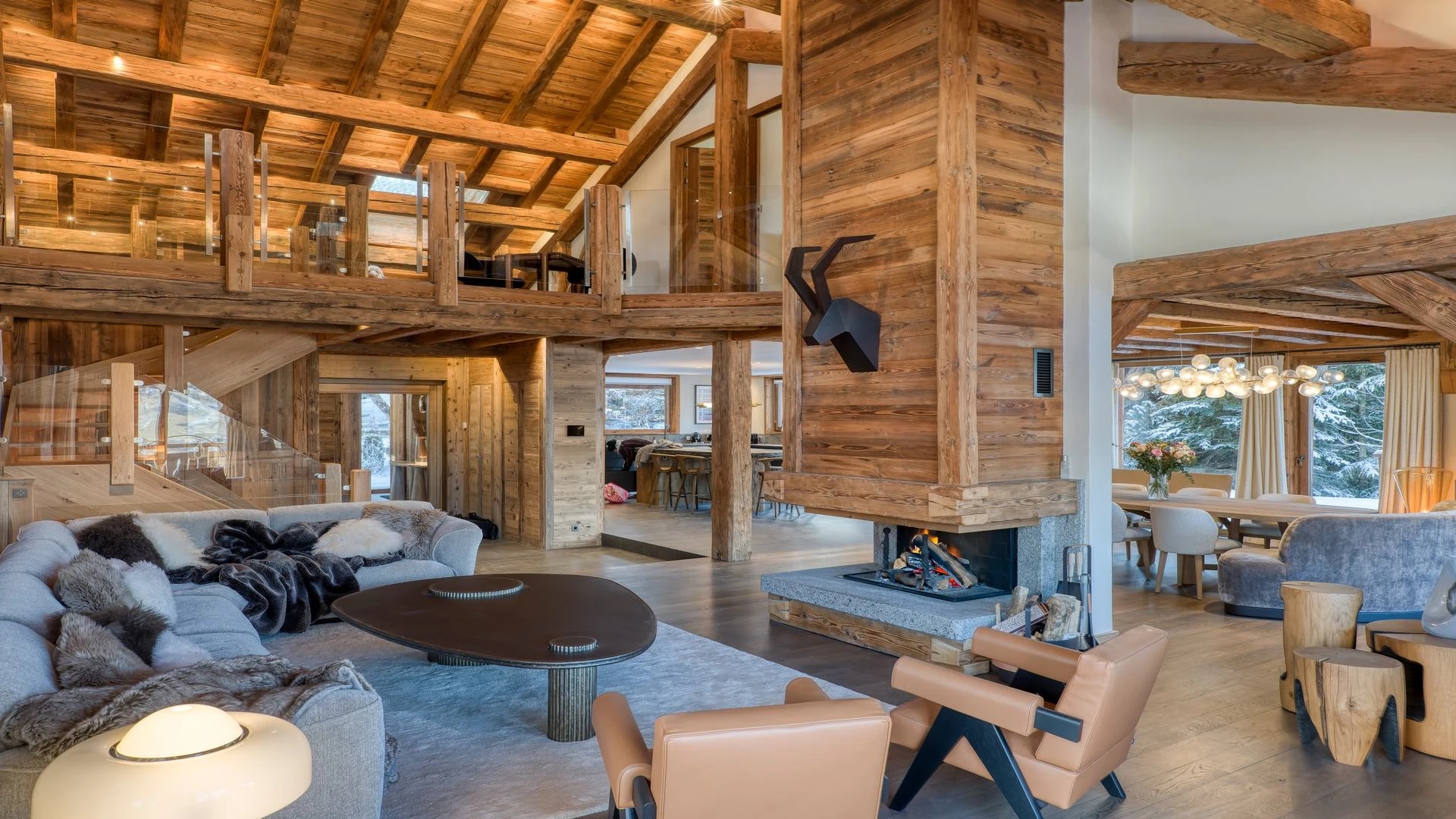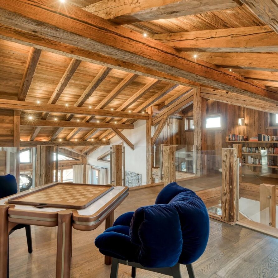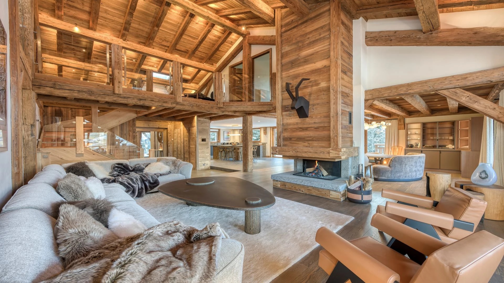The chalet, which extends over three floors, has a traditional outside construction, typical for this area, with its use of stone and wood, and a surprisingly contemporary design inside. With five en-suites bedrooms and a large dormitory for little ones, holiday chalet can host up to 13 people. The main hub is the open-plan living room on the ground floor with cathedral high ceilings giving a feel of grandeur and spaciousness. Underlining this are a slightly separated intimate sofa corner in soft natural tones with wooden, rustic side table, leather armchairs scattered around, a large L-shaped couch and a massive wooden staircase leading to a mezzanine. Its centerpiece is the wood-burning fireplace, which reaches up to the exposed wooden beams and divides the generous space. Like the entire ski lodge, with the exception of the kitchen and bathrooms, the room has wooden flooring.