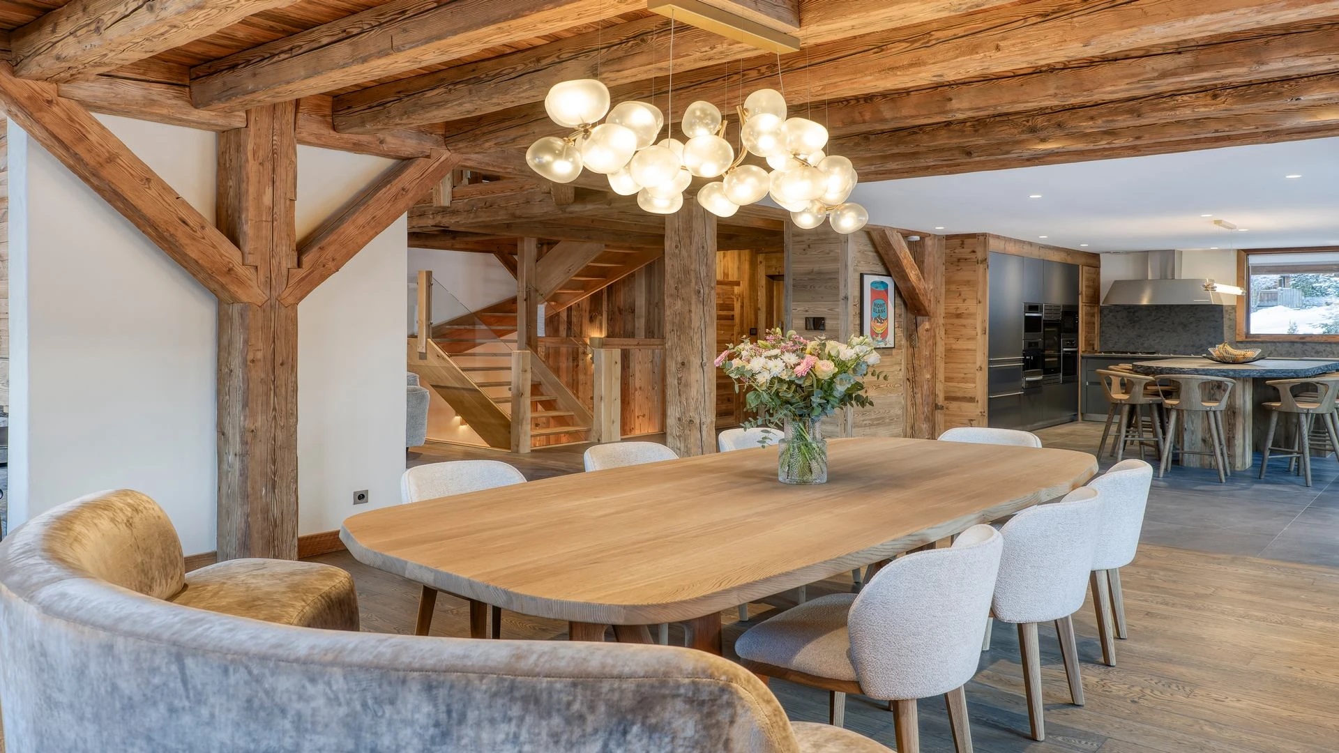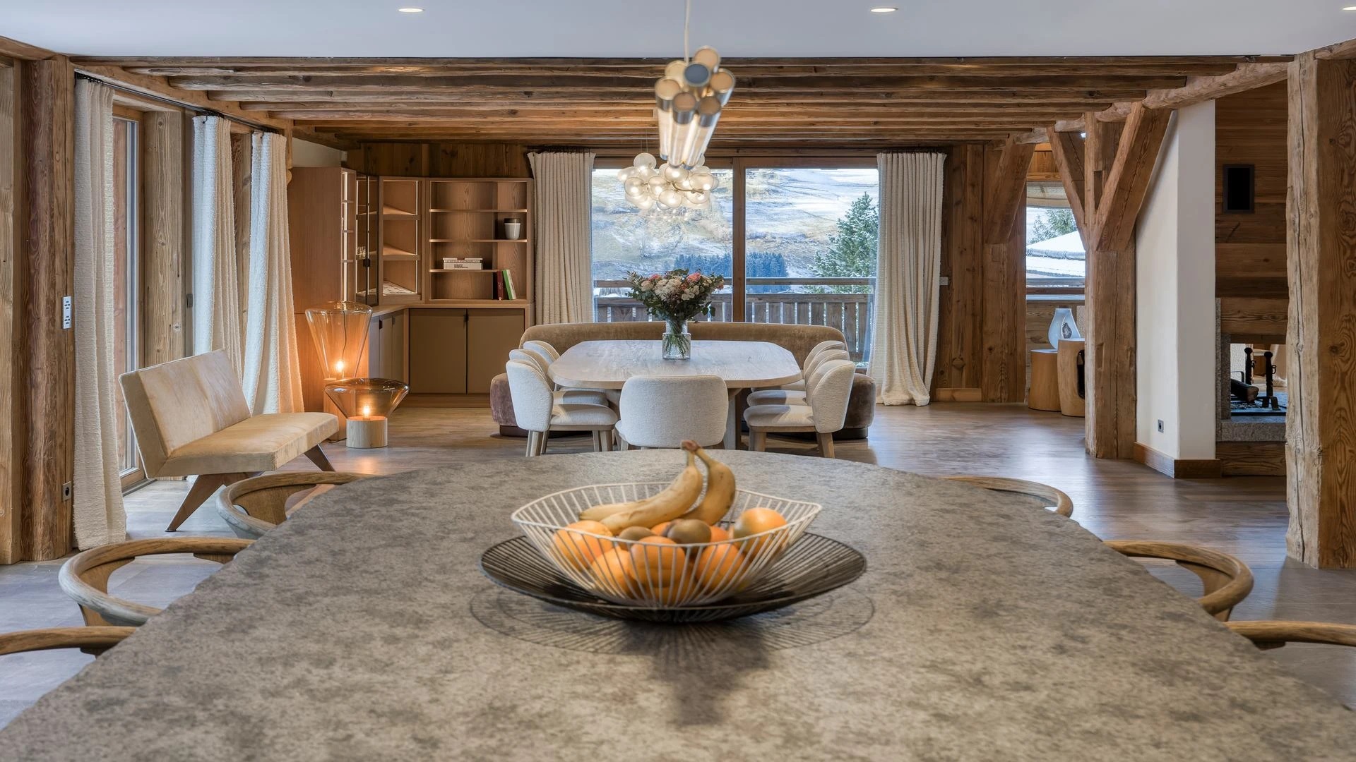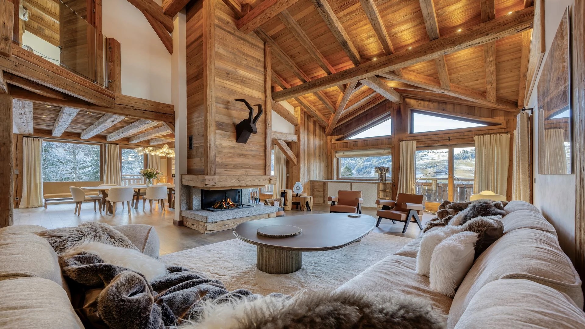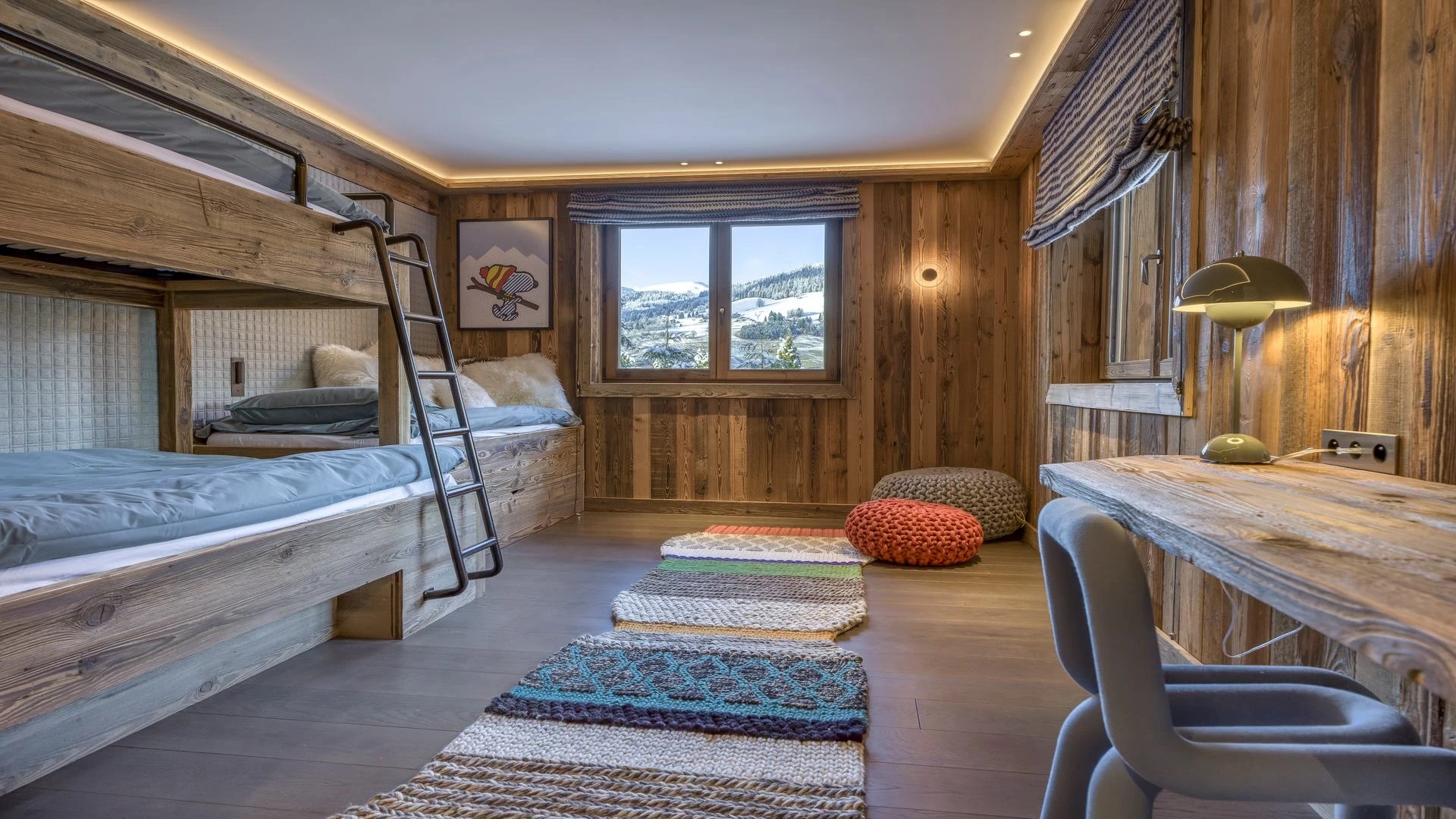 The chalet, which extends over three floors, has a traditional outside construction, typical for this area, with its use of stone and wood, and a surprisingly contemporary design inside. With five en-suites bedrooms and a large dormitory for little ones, holiday chalet can host up to 13 people. The main hub is the open-plan living room on the ground floor with cathedral high ceilings giving a feel of grandeur and spaciousness. Underlining this are a slightly separated intimate sofa corner in soft natural tones with wooden, rustic side table, leather armchairs scattered around, a large L-shaped couch and a massive wooden staircase leading to a mezzanine. Its centerpiece is the wood-burning fireplace, which reaches up to the exposed wooden beams and divides the generous space. Like the entire ski lodge, with the exception of the kitchen and bathrooms, the room has wooden flooring.
