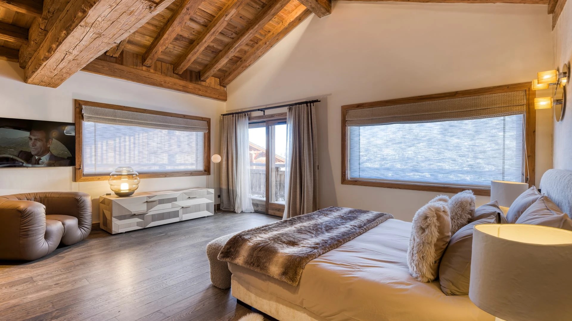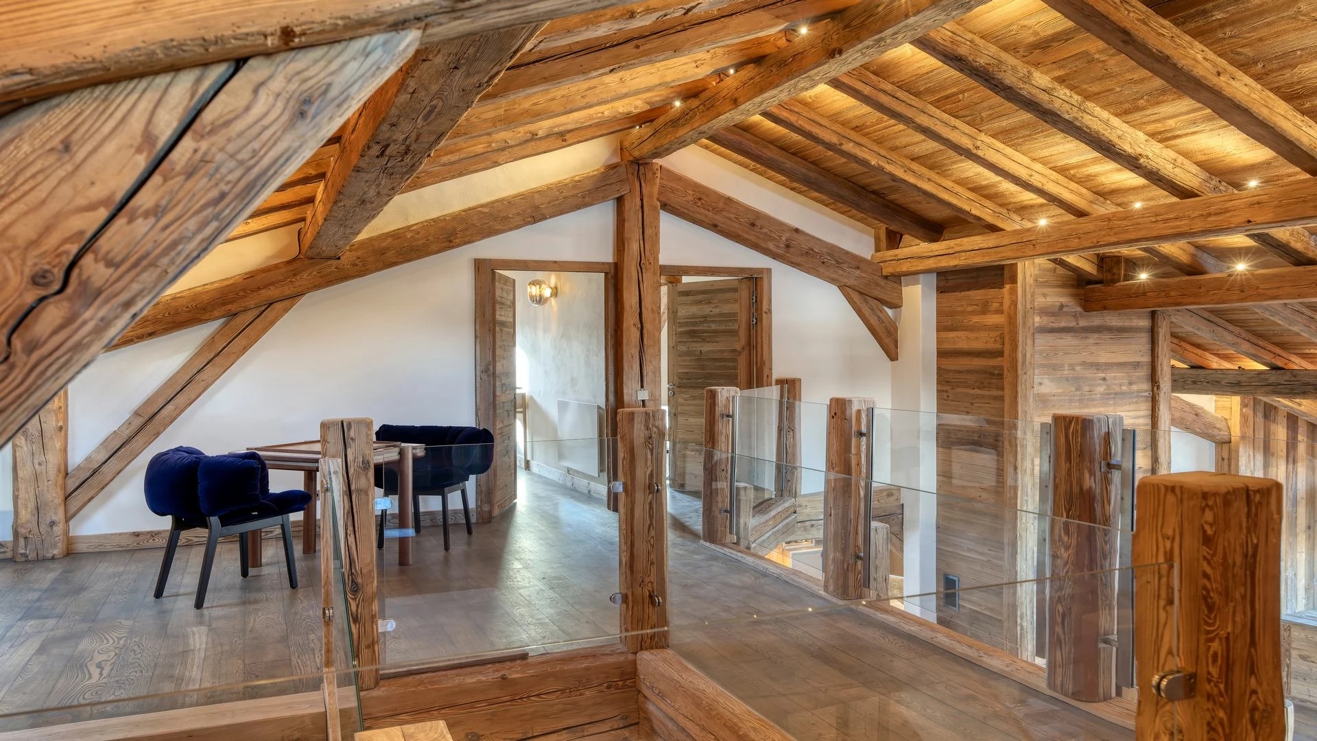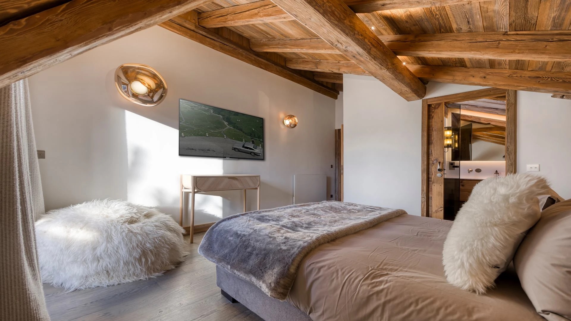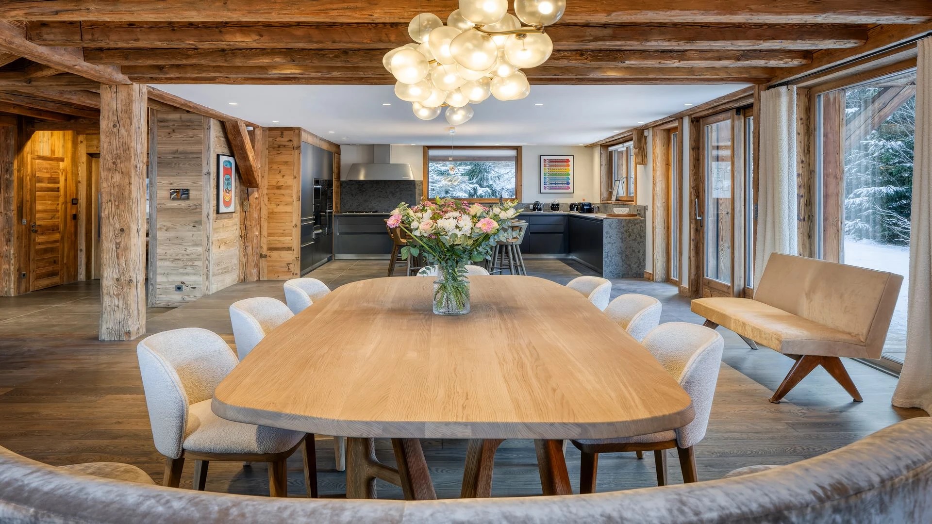 The chalet, which extends over three floors, has a traditional outside construction, typical for this area, with its use of stone and wood, and a surprisingly contemporary design inside. With five en-suites bedrooms and a large dormitory for little ones, holiday chalet can host up to 13 people. The main hub is the open-plan living room on the ground floor with cathedral high ceilings giving a feel of grandeur and spaciousness. Underlining this are a slightly separated intimate sofa corner in soft natural tones with wooden, rustic side table, leather armchairs scattered around, a large L-shaped couch and a massive wooden staircase leading to a mezzanine. Its centerpiece is the wood-burning fireplace, which reaches up to the exposed wooden beams and divides the generous space. Like the entire ski lodge, with the exception of the kitchen and bathrooms, the room has wooden flooring.