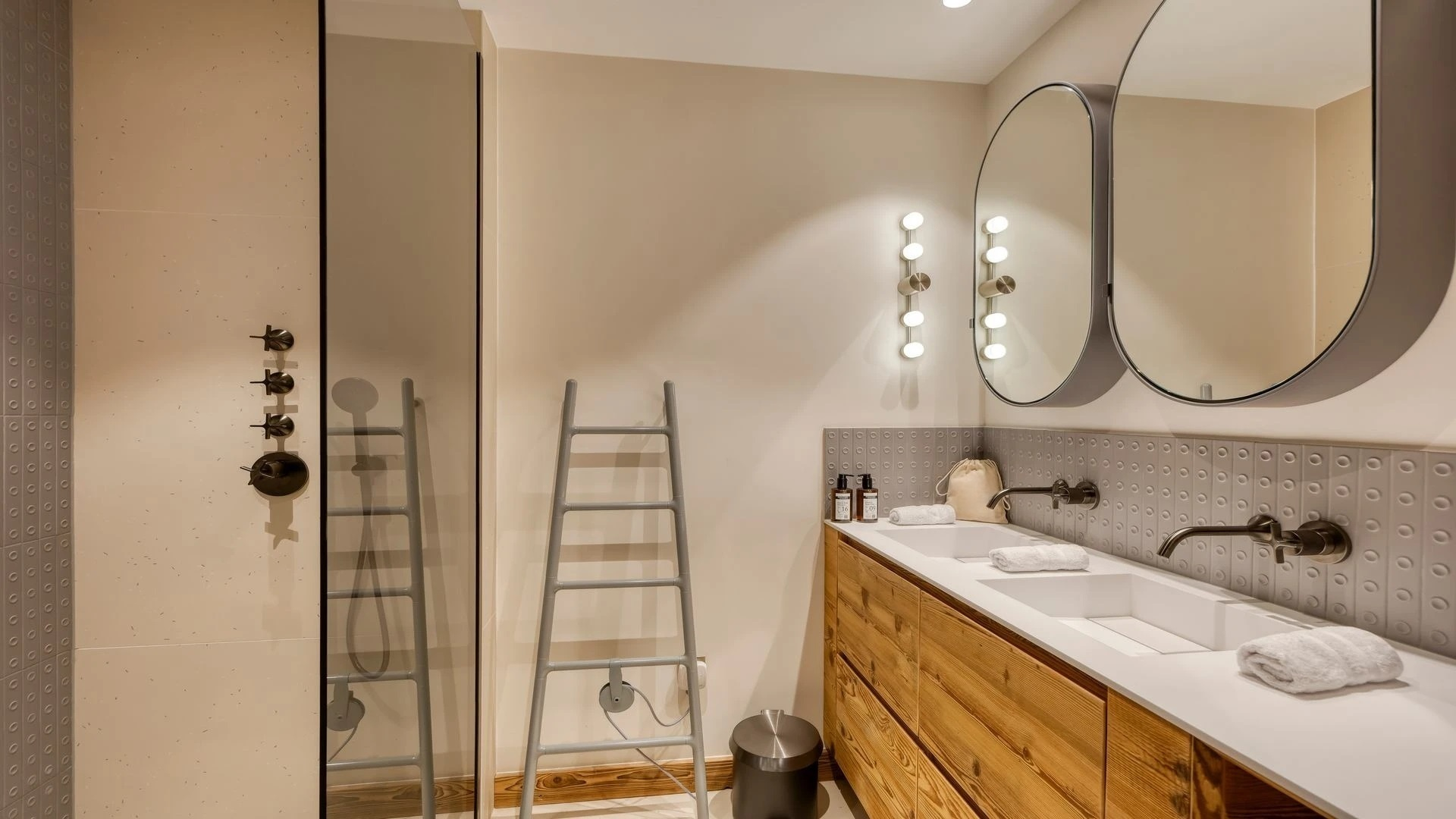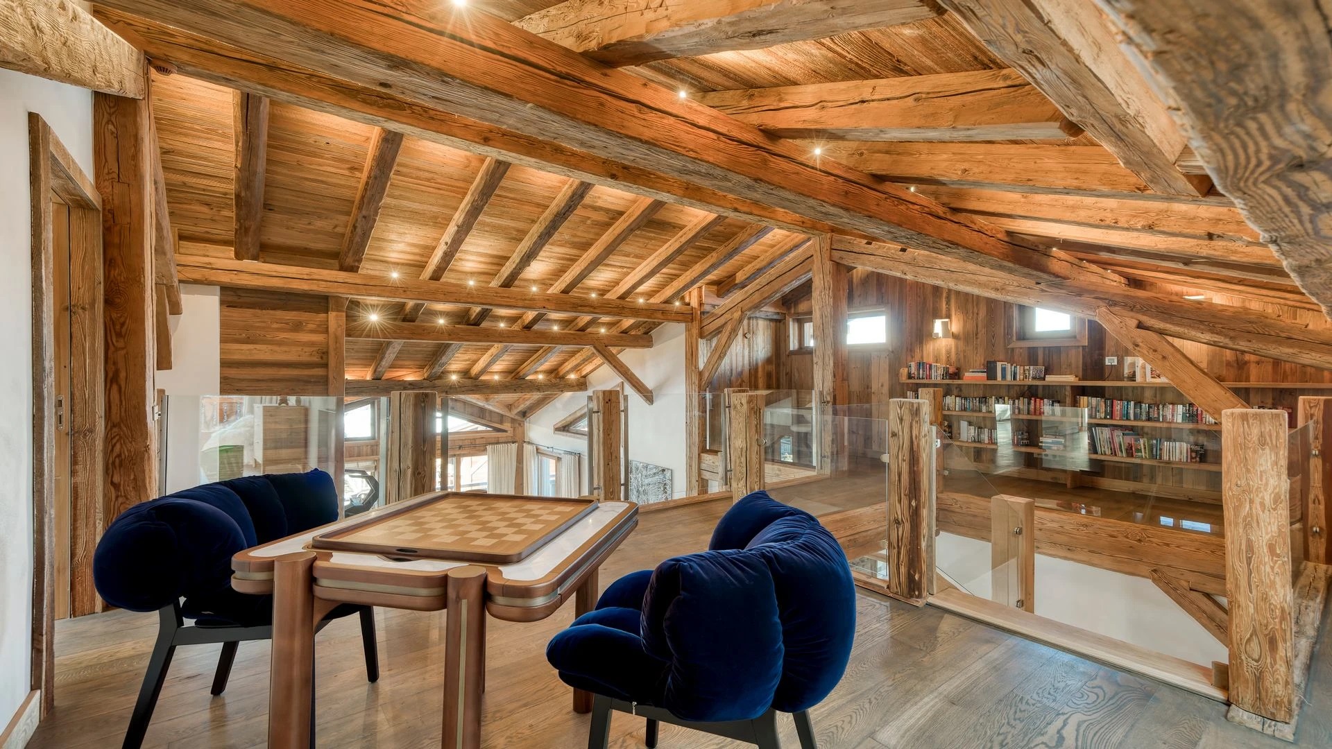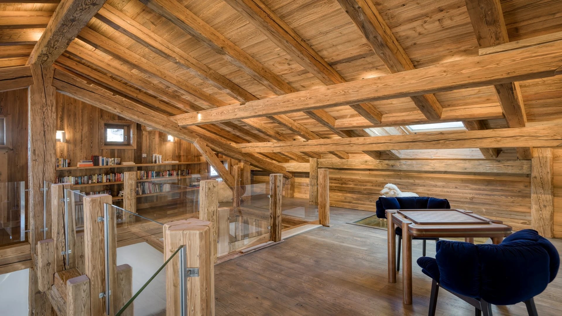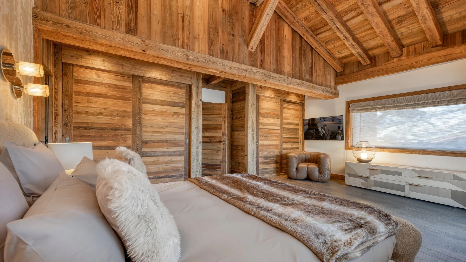 The chalet, which extends over three floors, has a traditional outside construction, typical for this area, with its use of stone and wood, and a surprisingly contemporary design inside. With five en-suites bedrooms and a large dormitory for little ones, holiday chalet can host up to 13 people. The main hub is the open-plan living room on the ground floor with cathedral high ceilings giving a feel of grandeur and spaciousness. Underlining this are a slightly separated intimate sofa corner in soft natural tones with wooden, rustic side table, leather armchairs scattered around, a large L-shaped couch and a massive wooden staircase leading to a mezzanine. Its centerpiece is the wood-burning fireplace, which reaches up to the exposed wooden beams and divides the generous space. Like the entire ski lodge, with the exception of the kitchen and bathrooms, the room has wooden flooring.