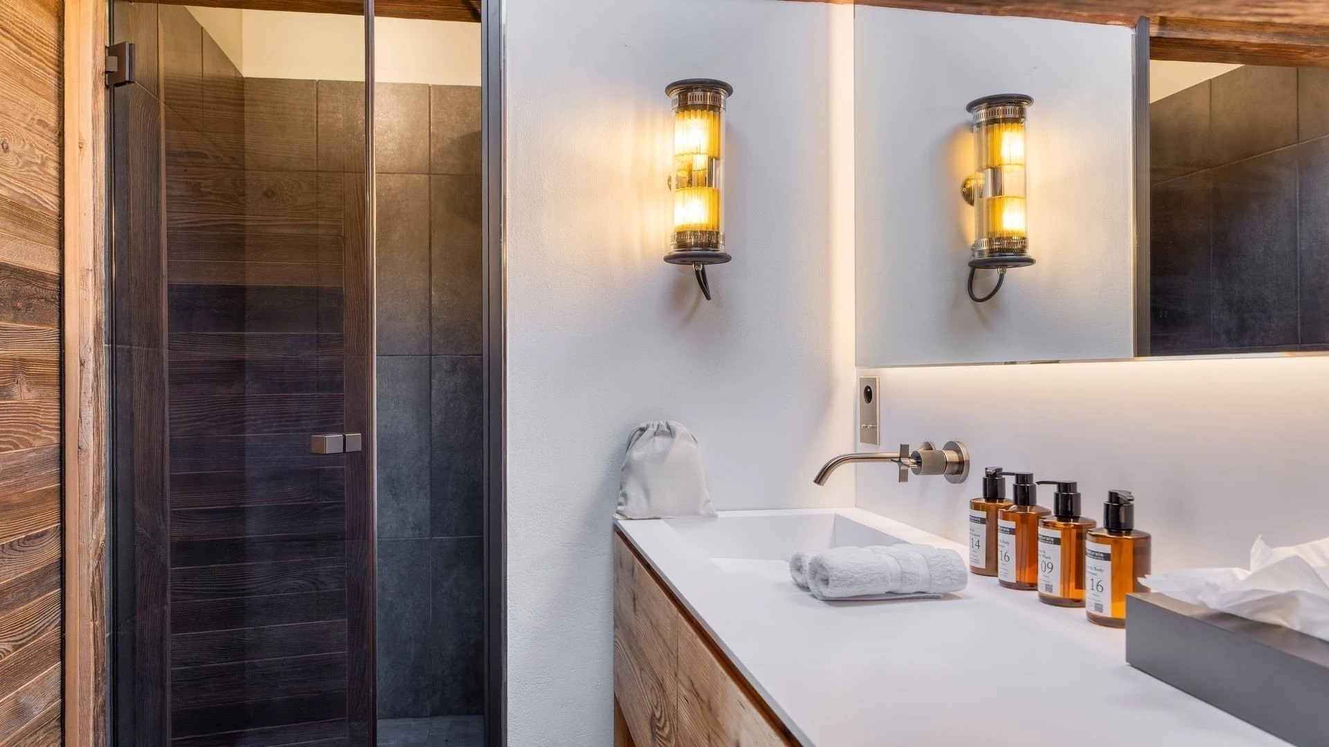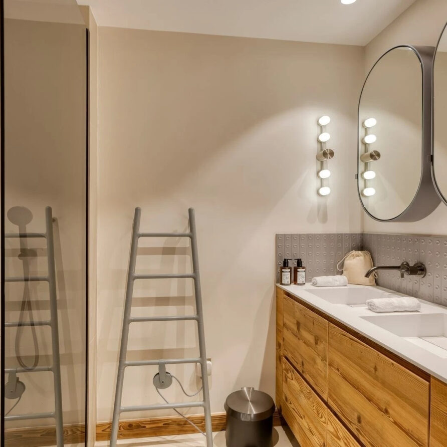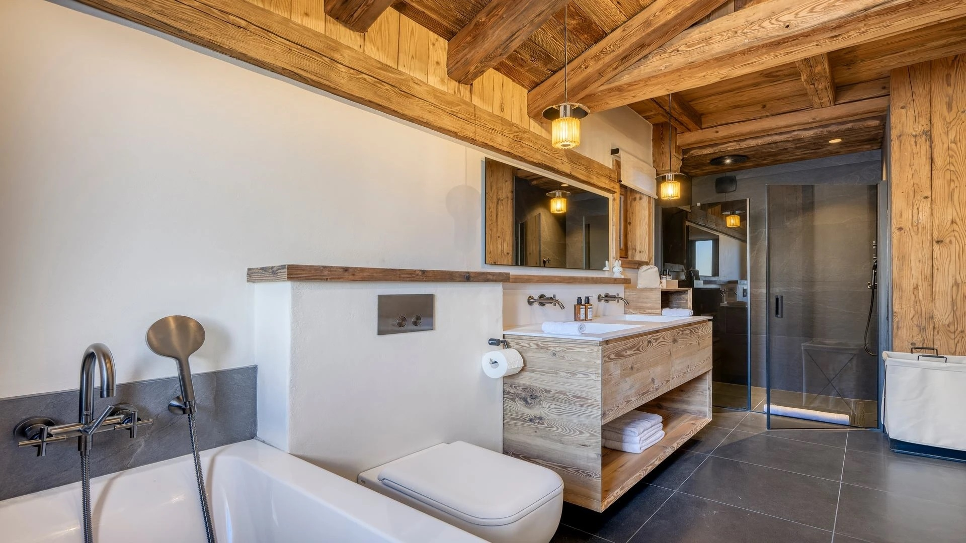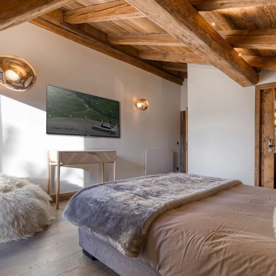 The bedrooms are distributed across all floors within Alpine holiday home, which is 500 square meters in size. The largest, the master suite, lies on the ground floor with private access to the terrace. Two double bedrooms, one with shower room, the other with bathroom and balcony, are on the first floor. Further downstairs, at garden level, there are two more bedrooms, one of which can be used as either a double or twin. Both have attached shower rooms. Finally, the garden level houses the sixth bedroom, the children’s dormitory with three bunk beds and private shower room. Common to most of the bedrooms is the generous use of wood, be it wall paneling or exposed wooden beams.