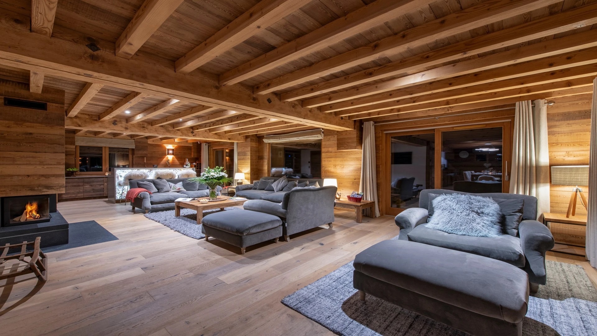Spanning 420 square meters, the luxury chalet greets guests with a refined and sophisticated ambiance in the open-plan living area on the first floor. Stylish decor and rich wood tones, complemented by luxurious furnishings, create an inviting space where guests can immerse themselves in the elegant alpine atmosphere. Large windows and a spacious south- and west-facing balcony bathe the area in natural light, offering stunning views of the surrounding mountains.