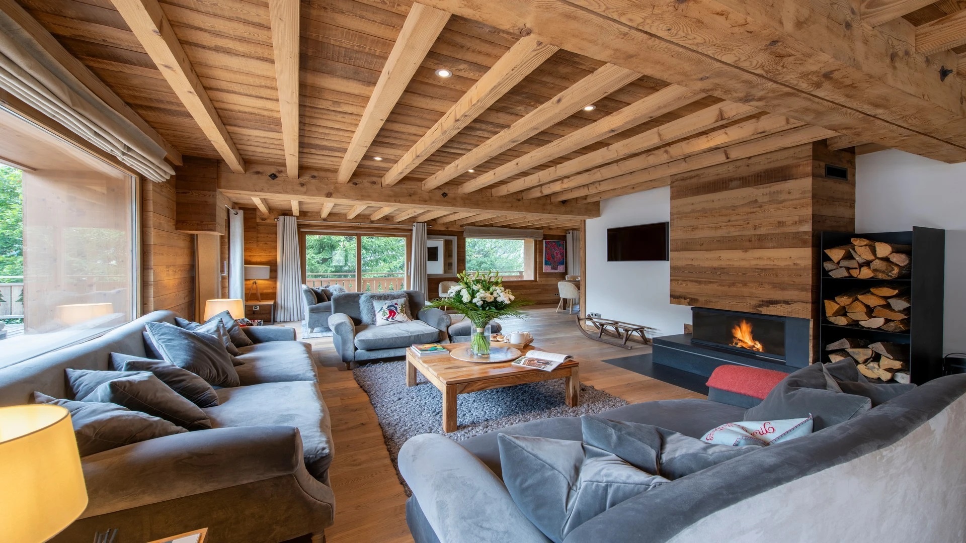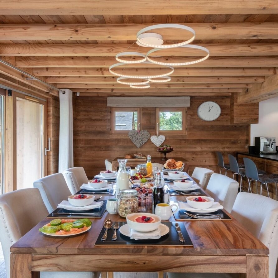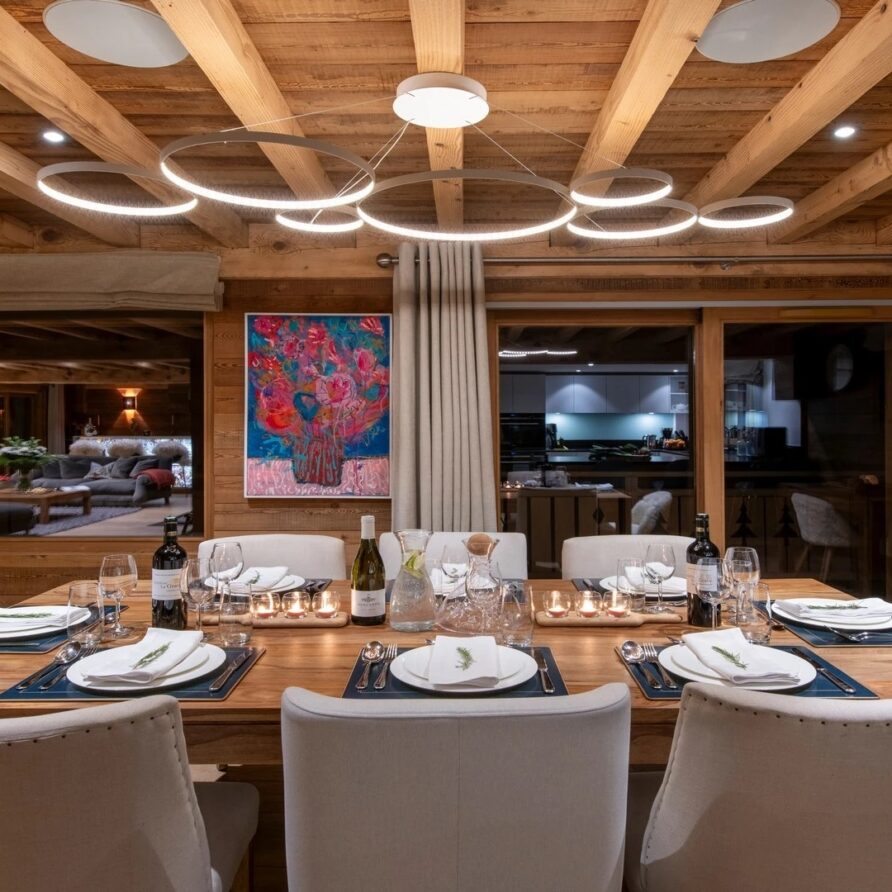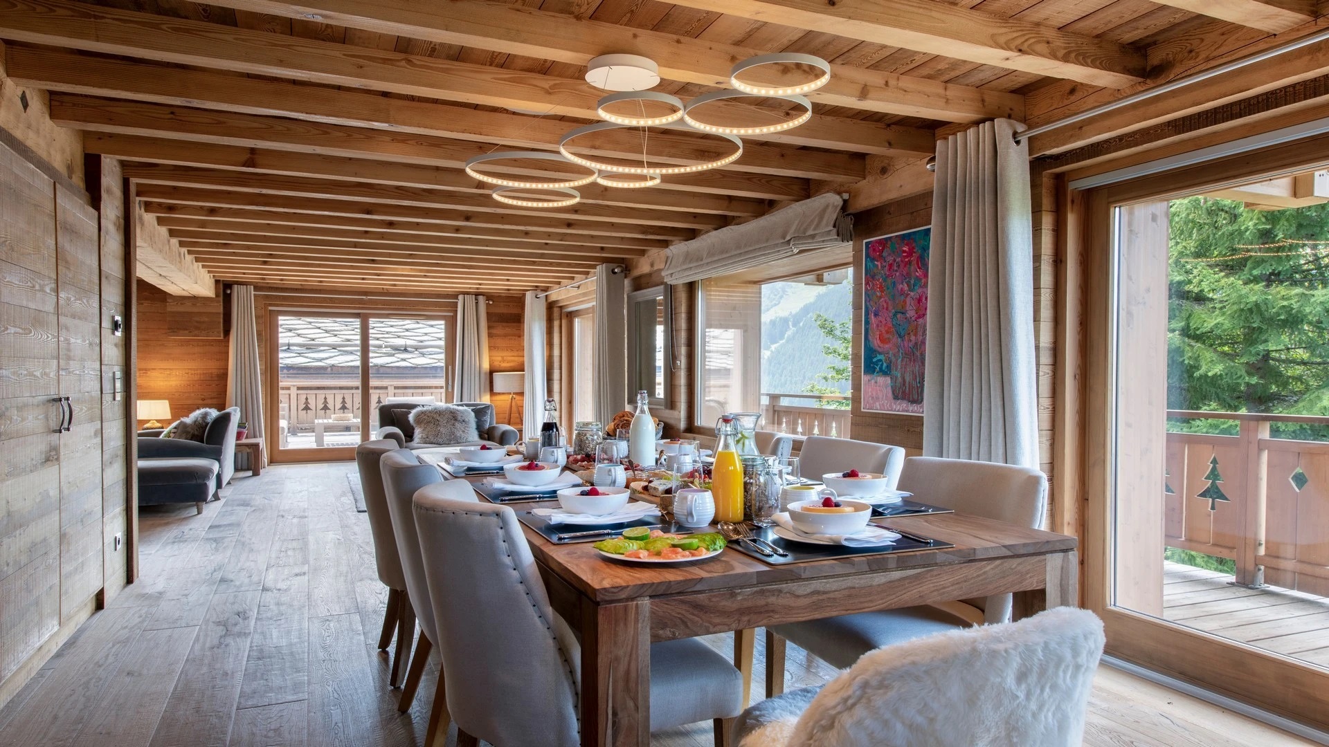 The fully equipped kitchen, complete with a bar, is perfect for enjoying a pre-dinner drink perched on the bar stools, as you watch the private chef expertly prepare your meals. The large dining table sets the scene for memorable gatherings, where delicious meals are shared and paired with fine wine. On warmer days, the adjoining balcony invites you to soak up the sun or enjoy a meal al fresco, surrounded by the beauty of the mountains.