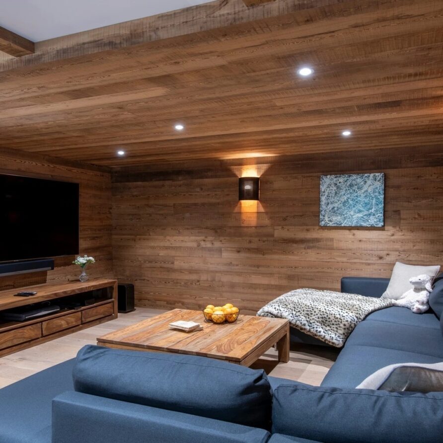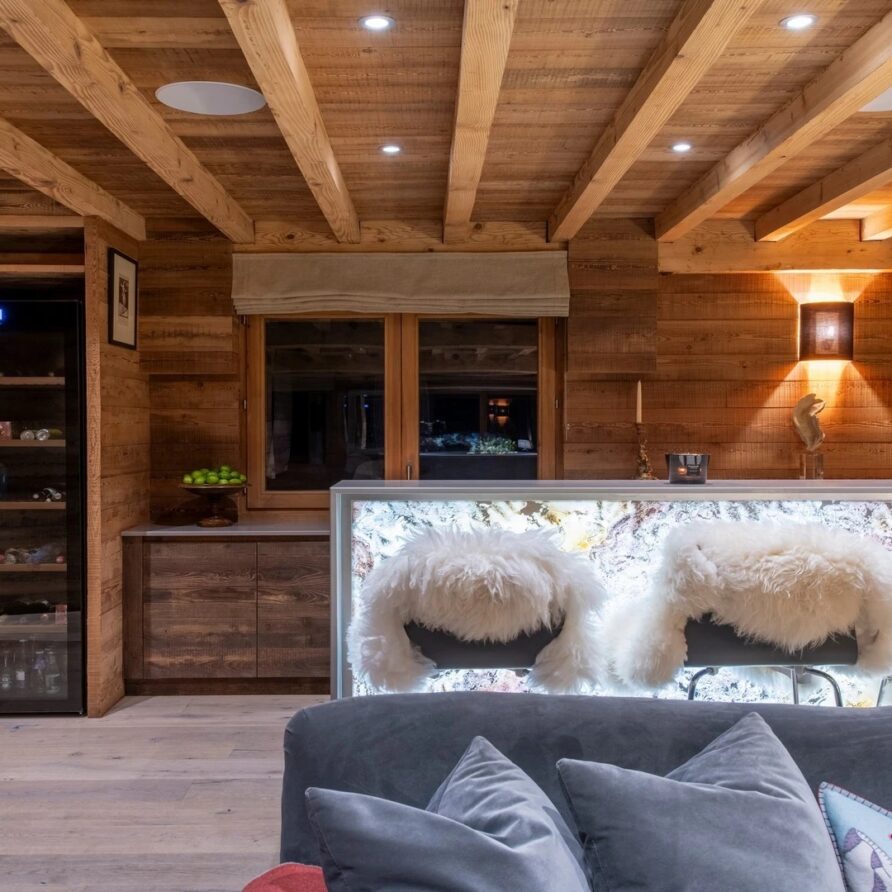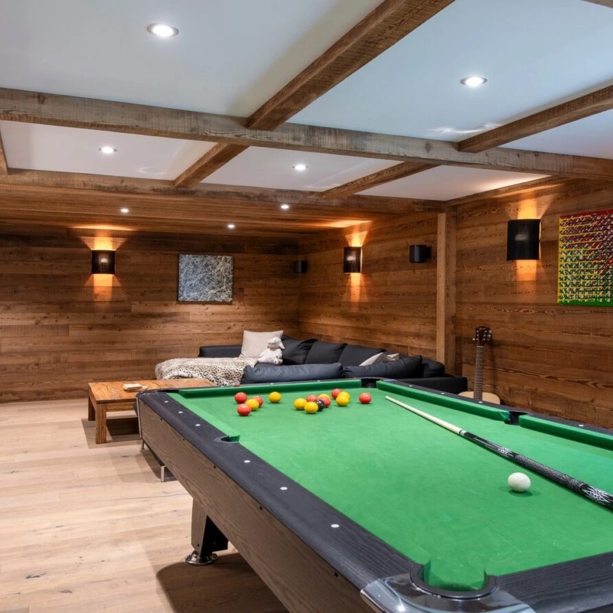 Generously arranged sofas, perfectly positioned around the fireplace, provide the ideal spot to enjoy an afternoon snack or a glass of champagne after a day on the slopes. The wooden ceiling further enhances the chalet’s alpine charm, while the well-appointed bar offers another cozy corner to relax with a drink. For those seeking a bit more excitement, the games room is sure to entertain. Equipped with a pool table, Foosball table, and a cozy TV area, it provides endless fun for all ages. Whether you’re challenging someone to a friendly match or simply relaxing with a film, the games room is a vibrant social hub within the chalet.