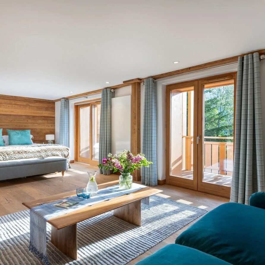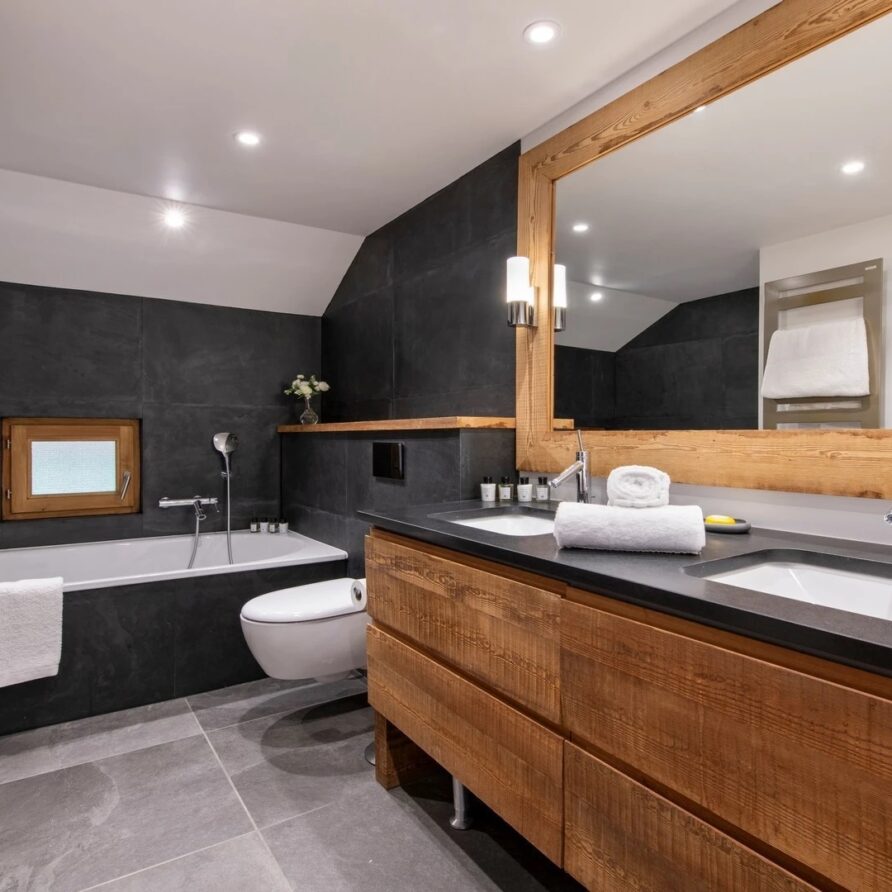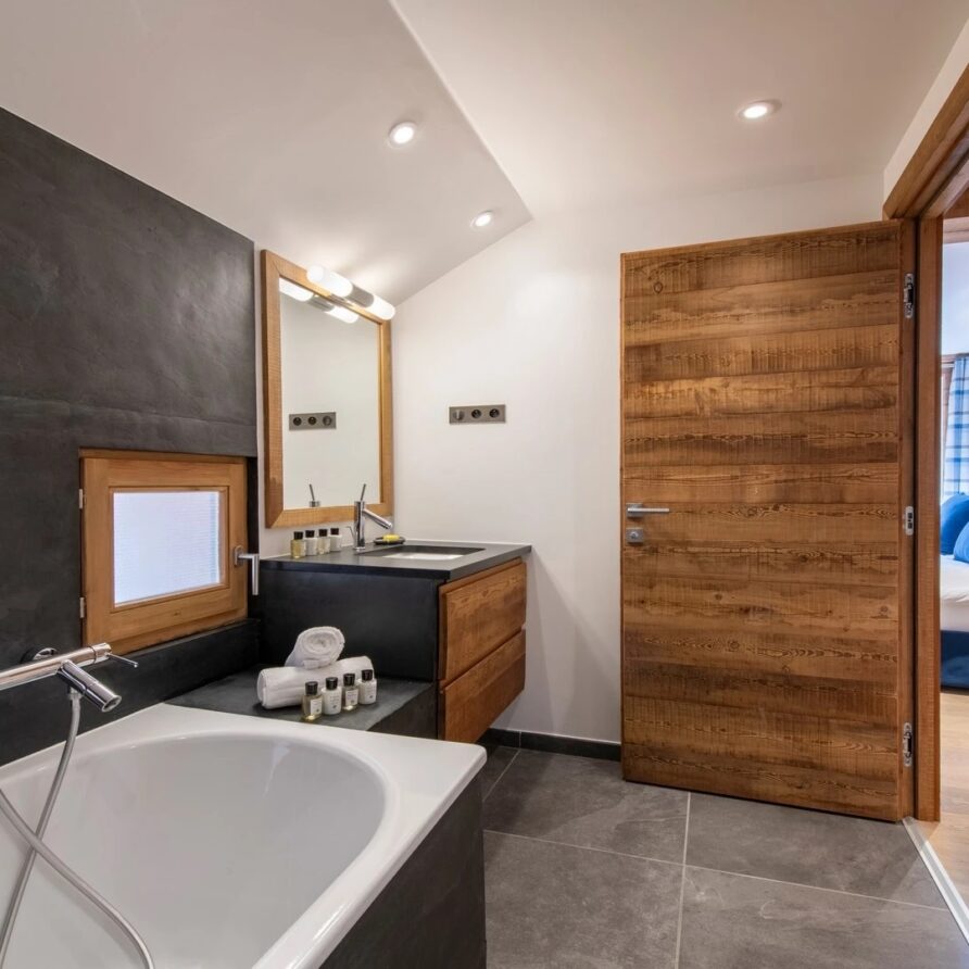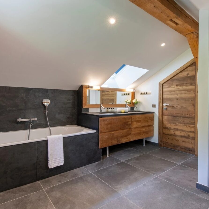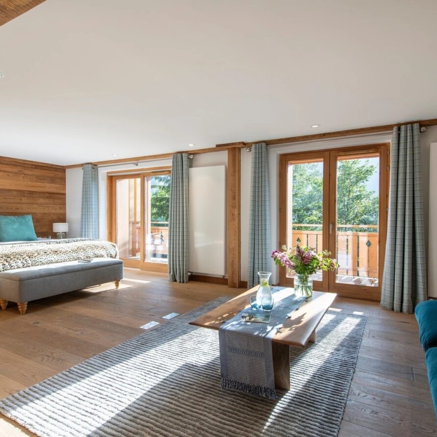 The bedrooms in the chalet are thoughtfully distributed across three floors, ensuring plenty of privacy and comfort for every guest. Each room is tastefully decorated with a stylish blend of modern elegance and alpine charm, offering all the amenities you need for a luxurious and relaxing holiday. On the top floor, you’ll find a lovely double/twin bedroom with its own private balcony. This room features a separate private bathroom with a shower and twin sinks, providing a peaceful retreat with beautiful views.