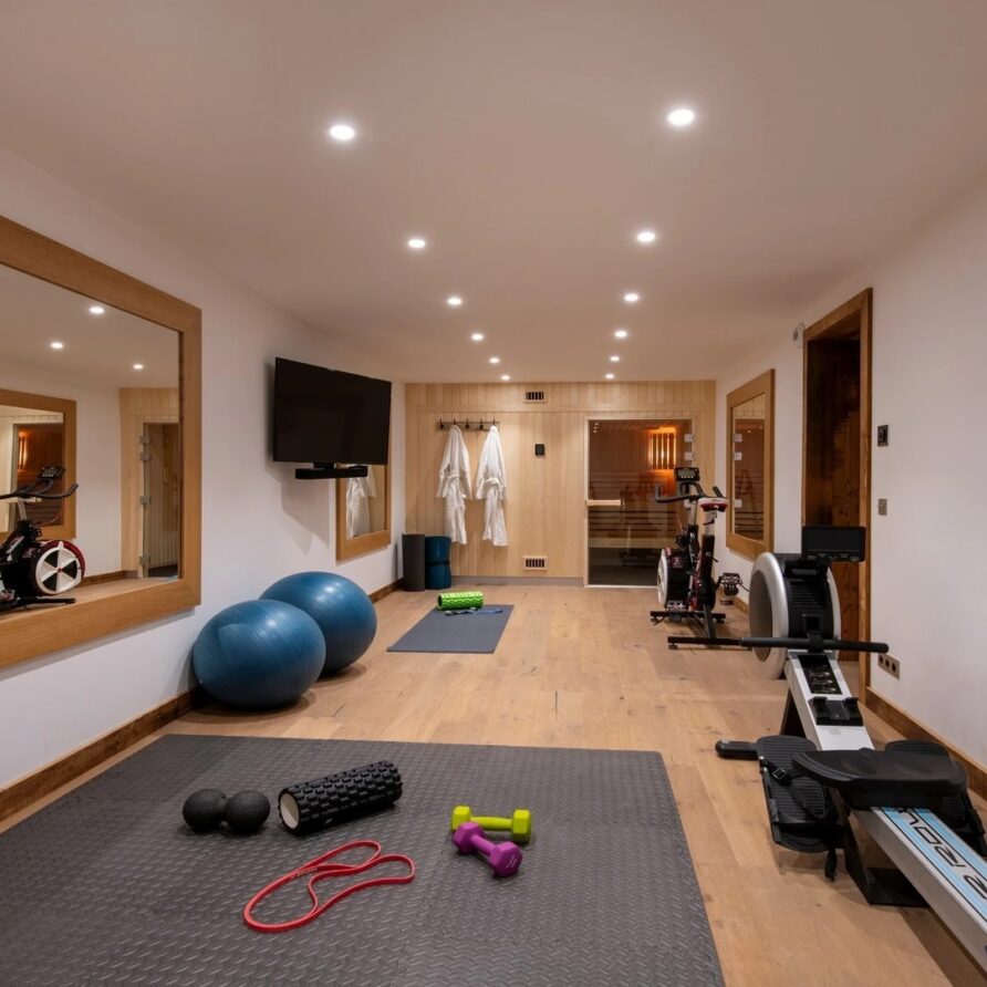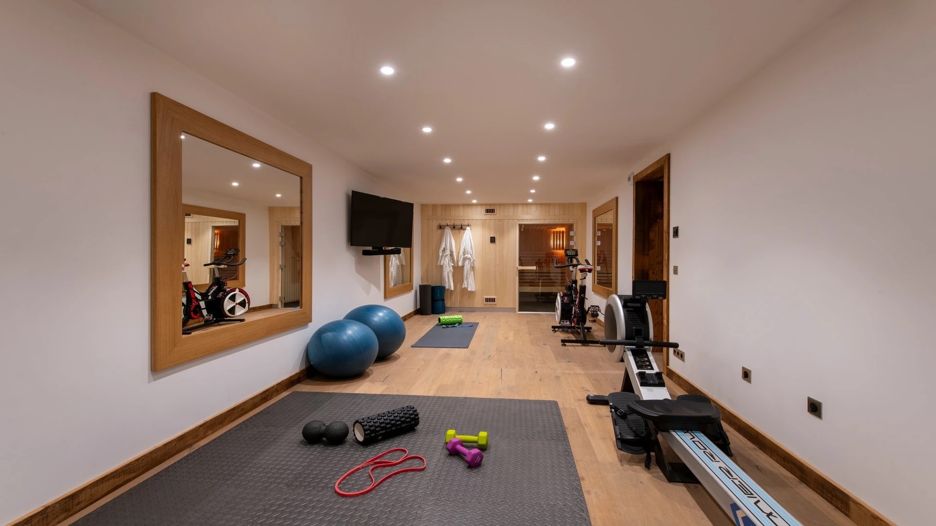 For ultimate relaxation, head to the ground floor, a haven dedicated to both leisure and entertainment. After a day on the slopes, can retreat to the private sauna to soothe tired muscles in the warmth of the steam. There is also a small gym for workouts. The spacious terrace offers a peaceful spot to take in the fresh mountain air, perfect for a quiet moment with a cup of coffee or an evening drink with friends.