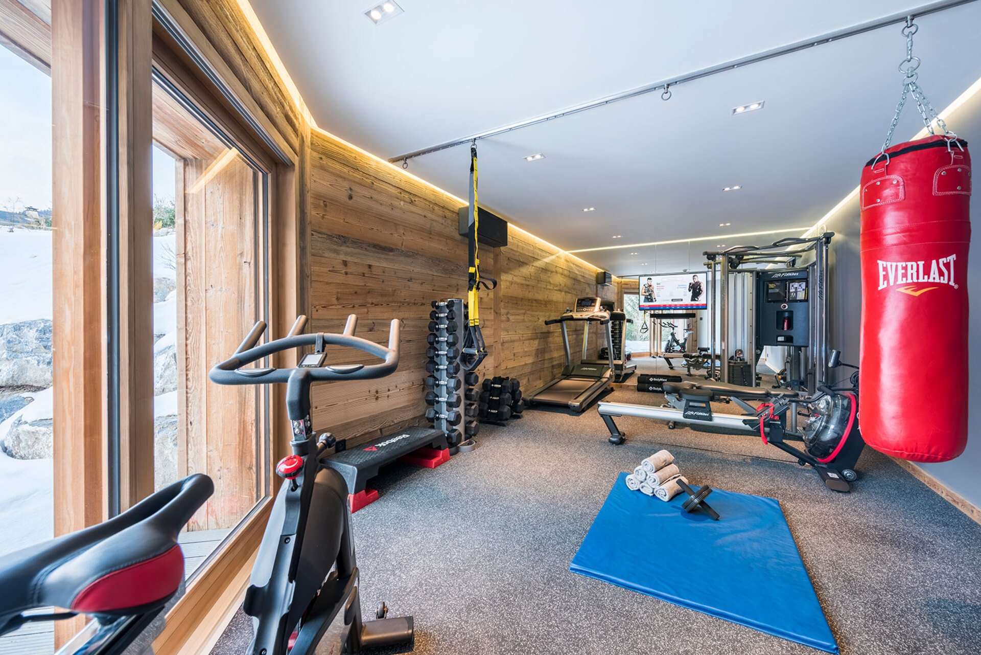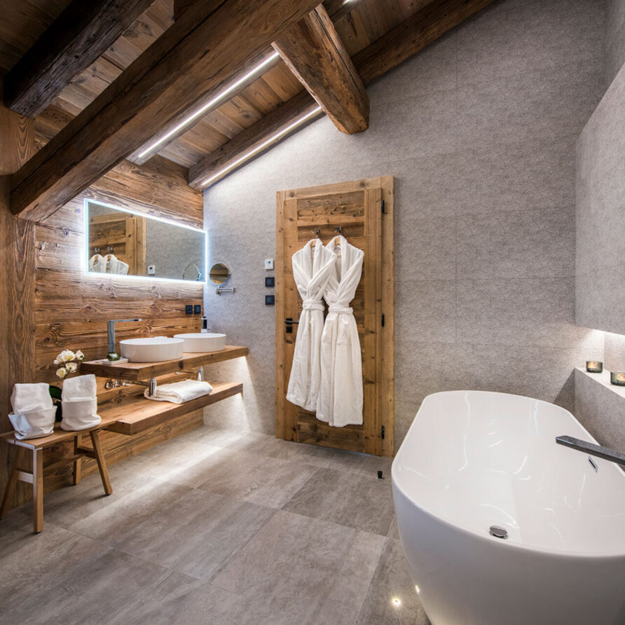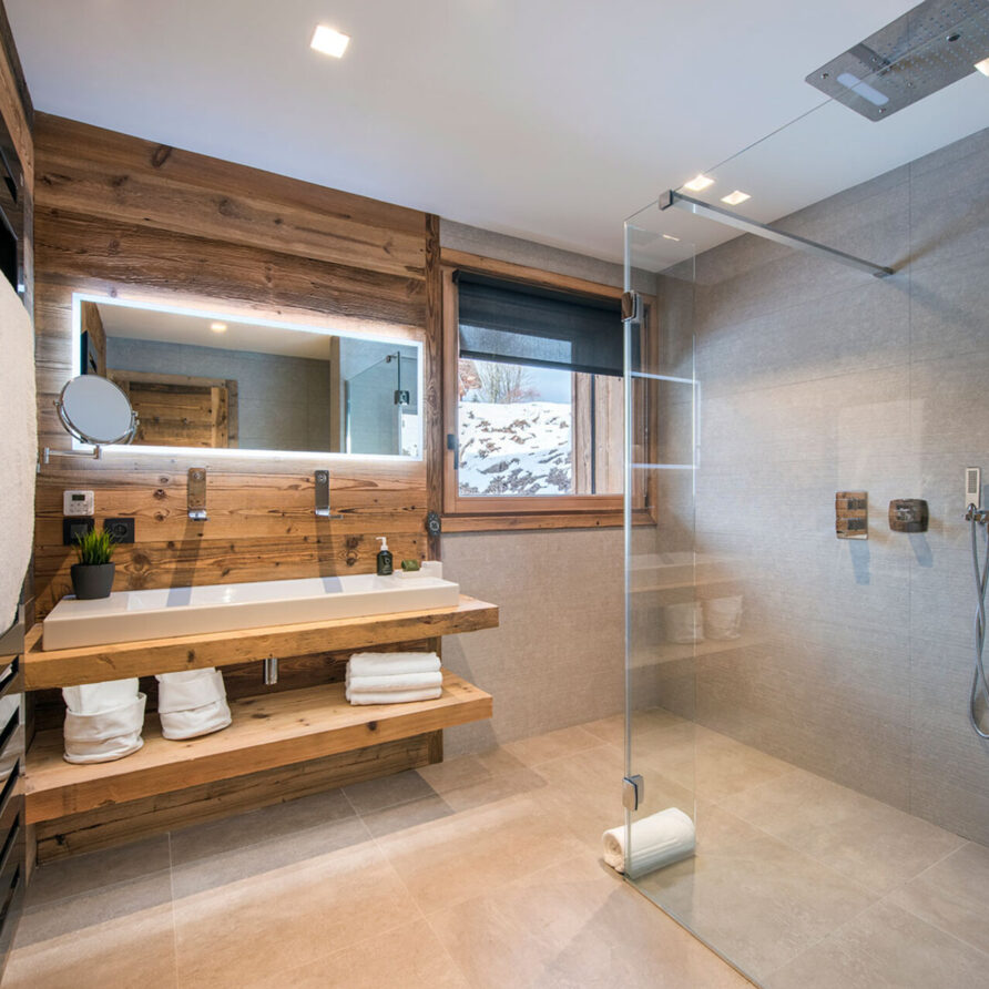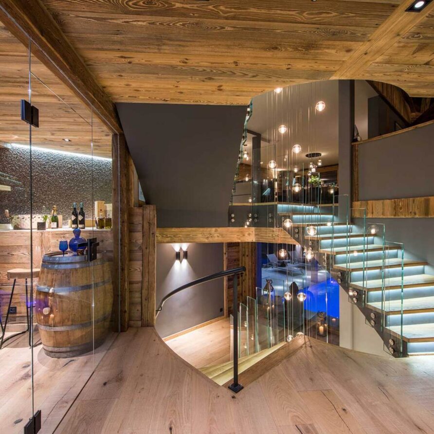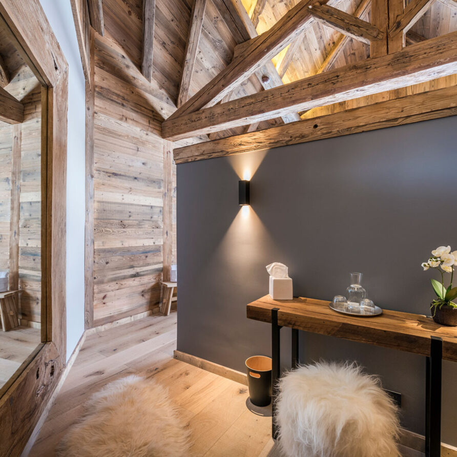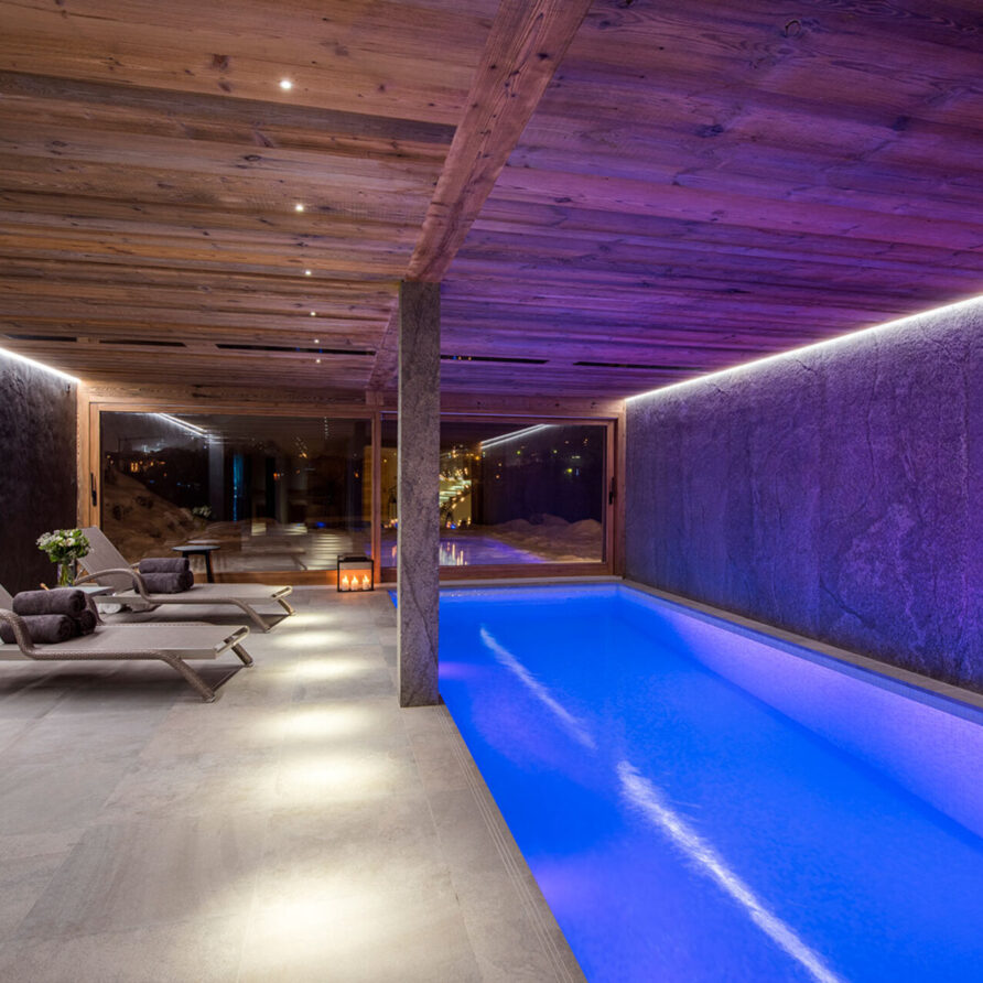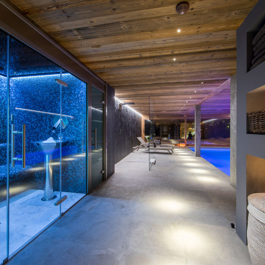 The impressive spa and wellness areas are very spacious for a private chalet. It offers an indoor swimming pool with massage and counter current jets as well as a view of the mountains. There is also a hamman and massage room. Wellness at the chalet isn’t just about relaxation, it is very much seen as a holistic vision which perfectly echoes the modern active lifestyles. Alongside the fantastic spa facilities there is a well equipped gym, and forest trails starting at the foot of the garden.