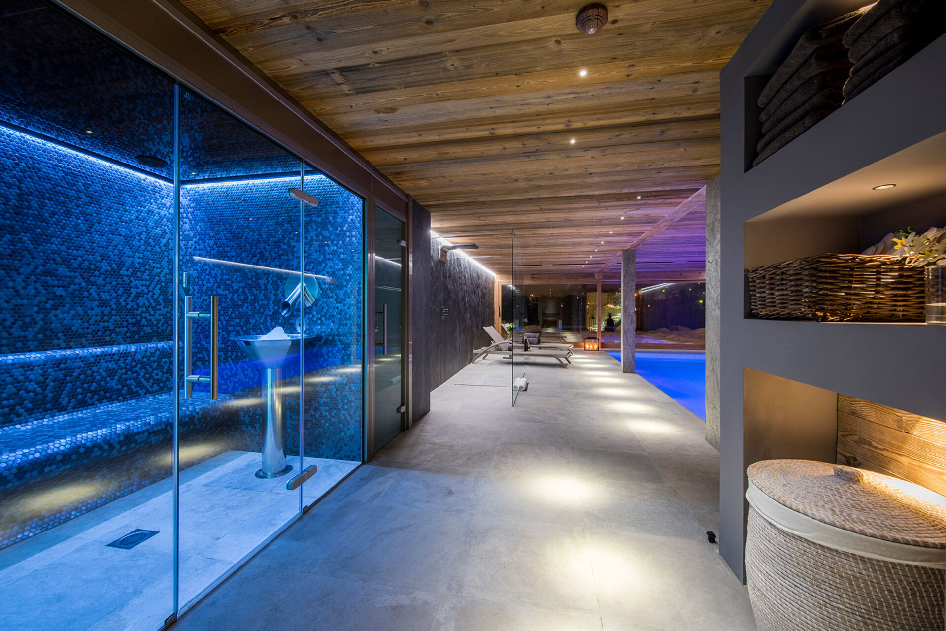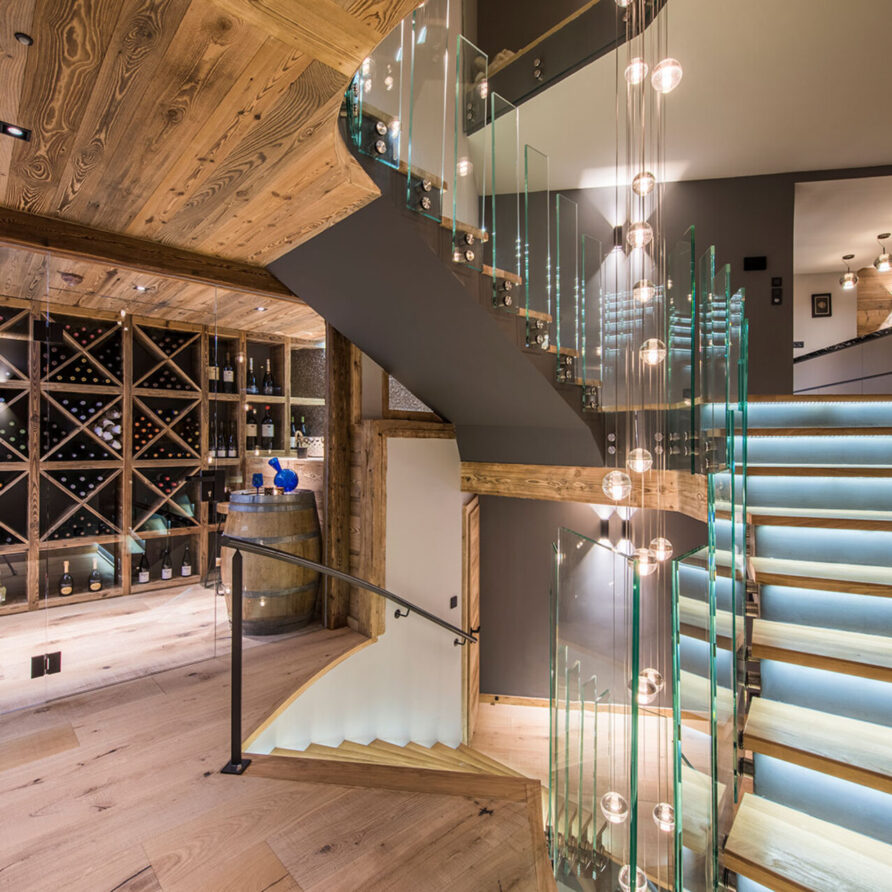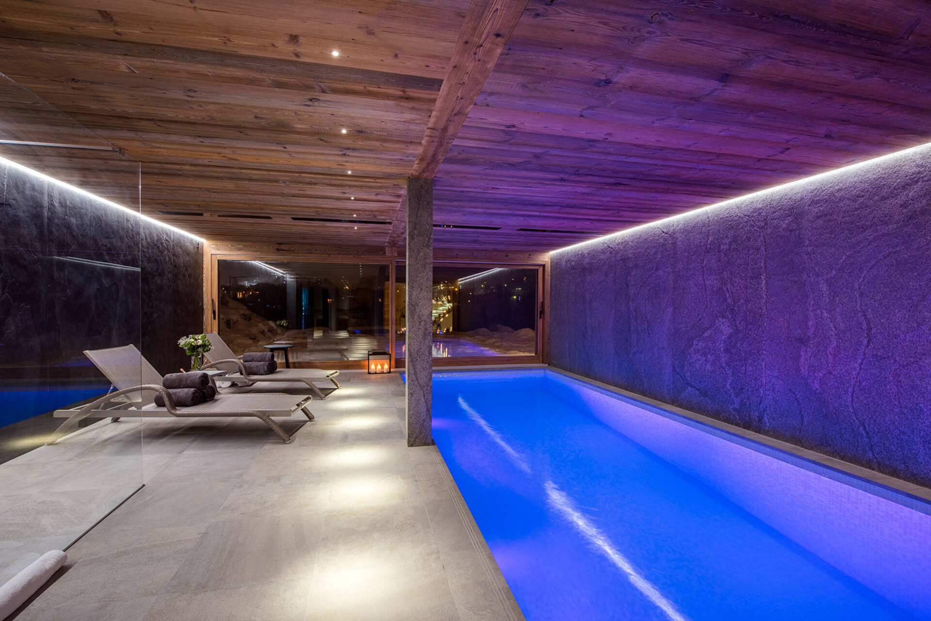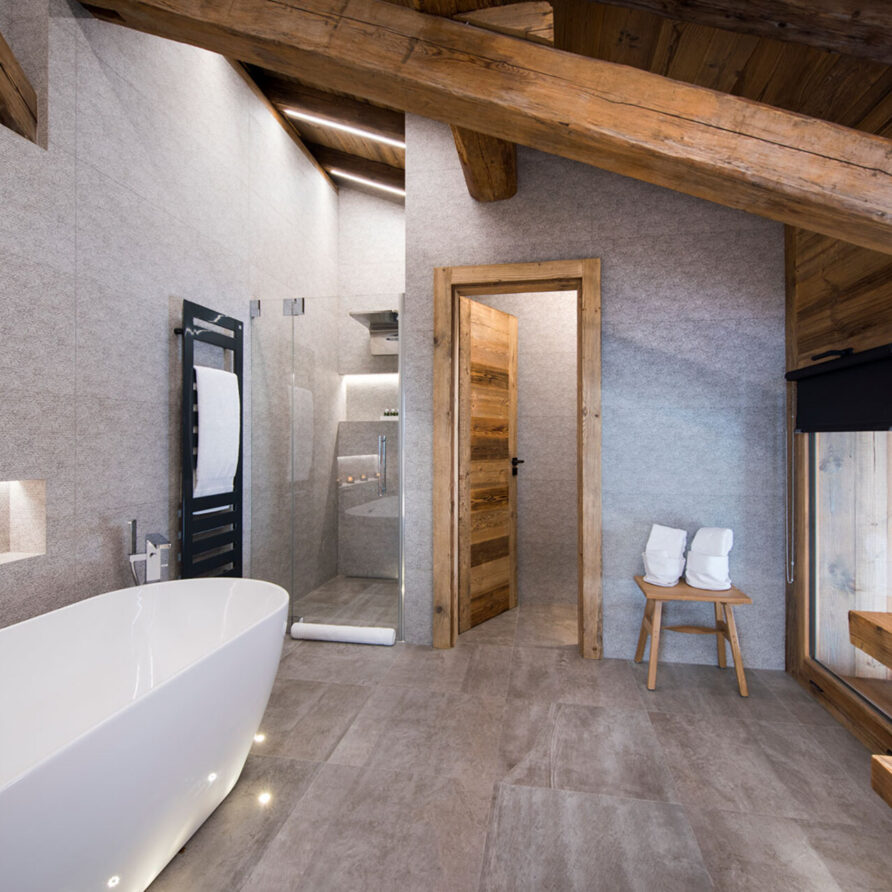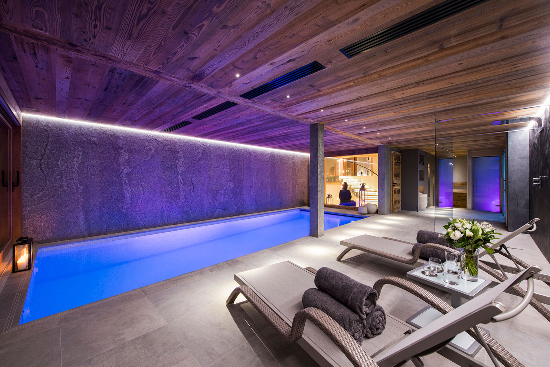 The impressive spa and wellness areas are very spacious for a private chalet. It offers an indoor swimming pool with massage and counter current jets as well as a view of the mountains. There is also a hamman and massage room. Wellness at the chalet isn’t just about relaxation, it is very much seen as a holistic vision which perfectly echoes the modern active lifestyles. Alongside the fantastic spa facilities there is a well equipped gym, and forest trails starting at the foot of the garden.