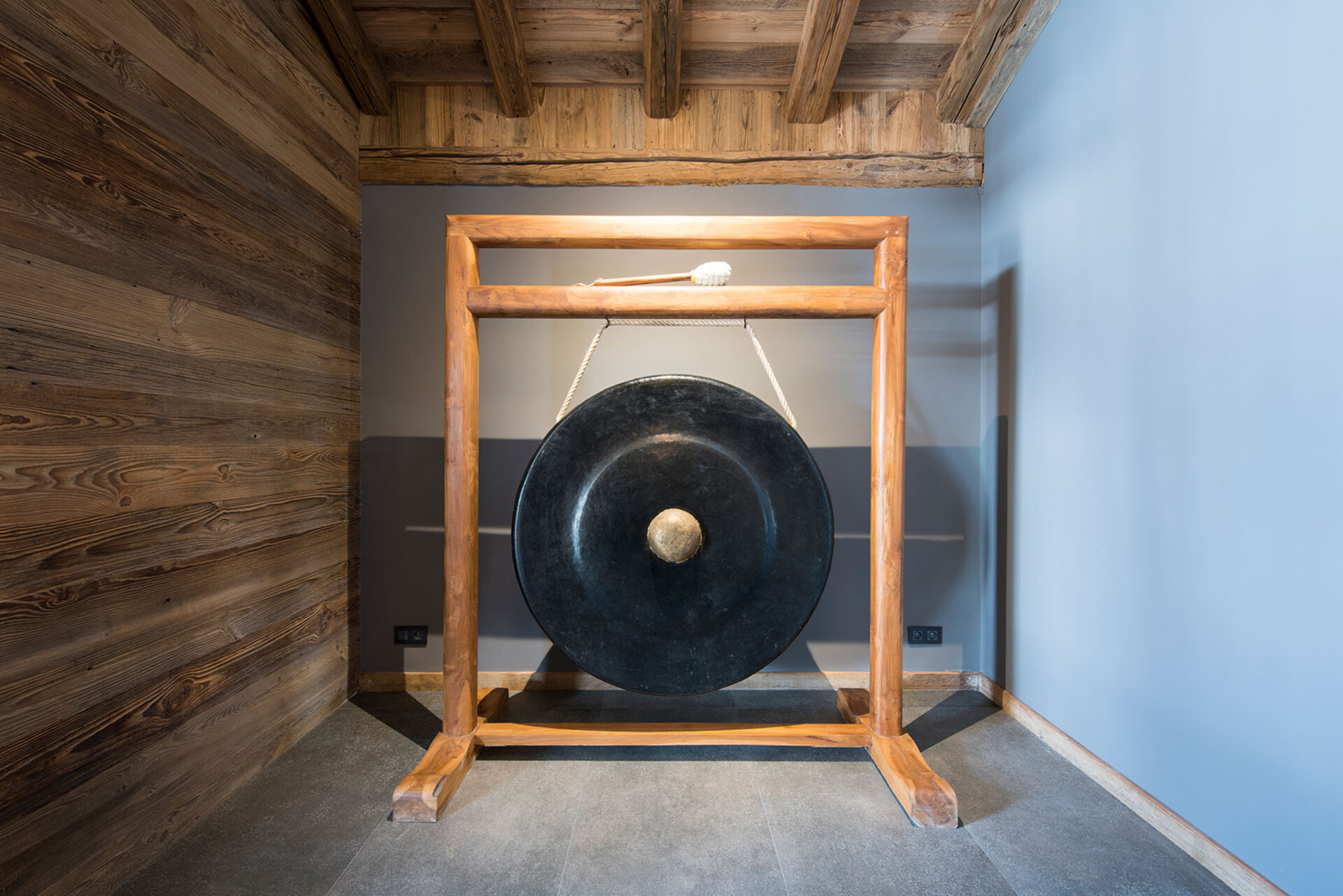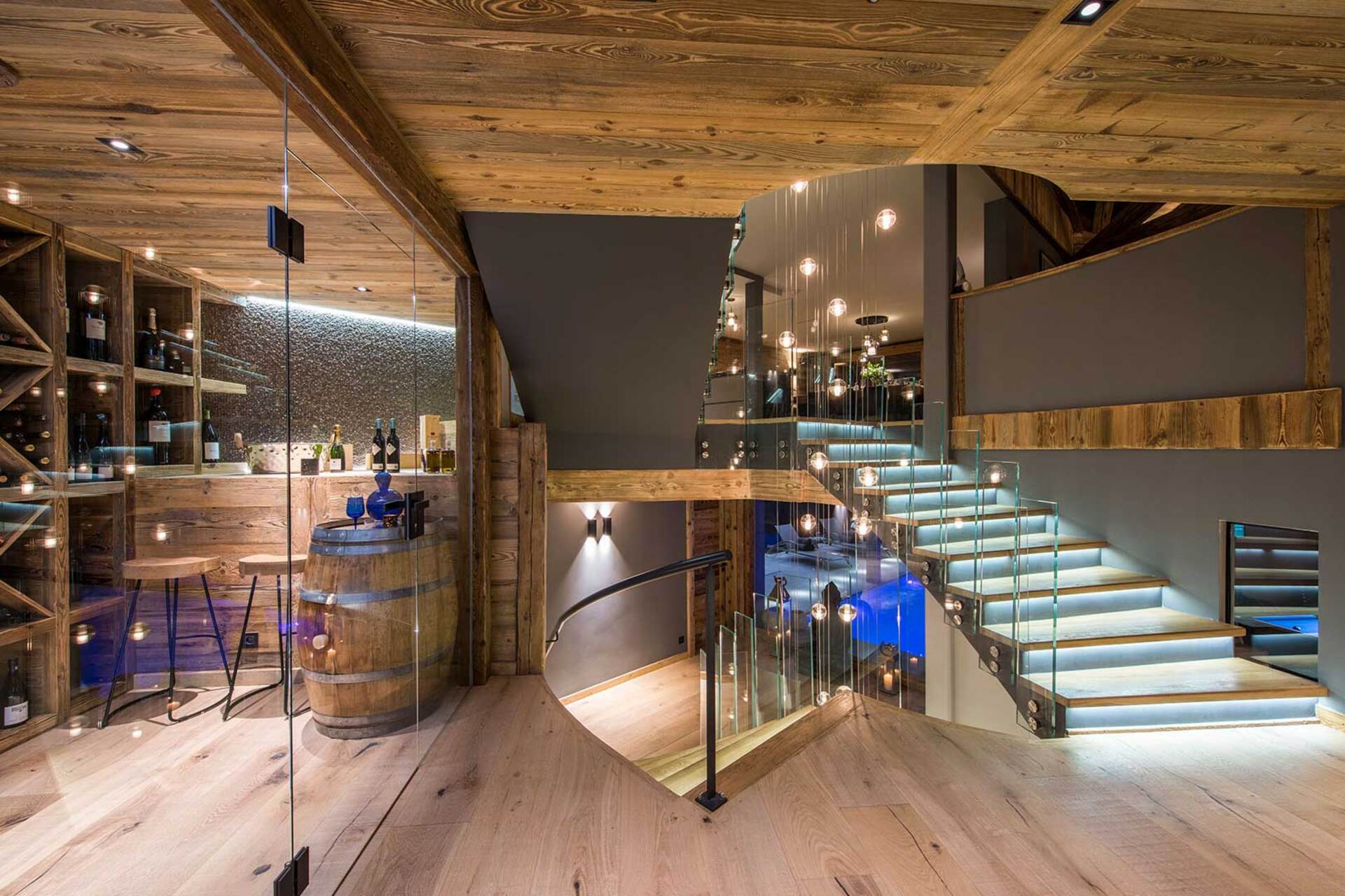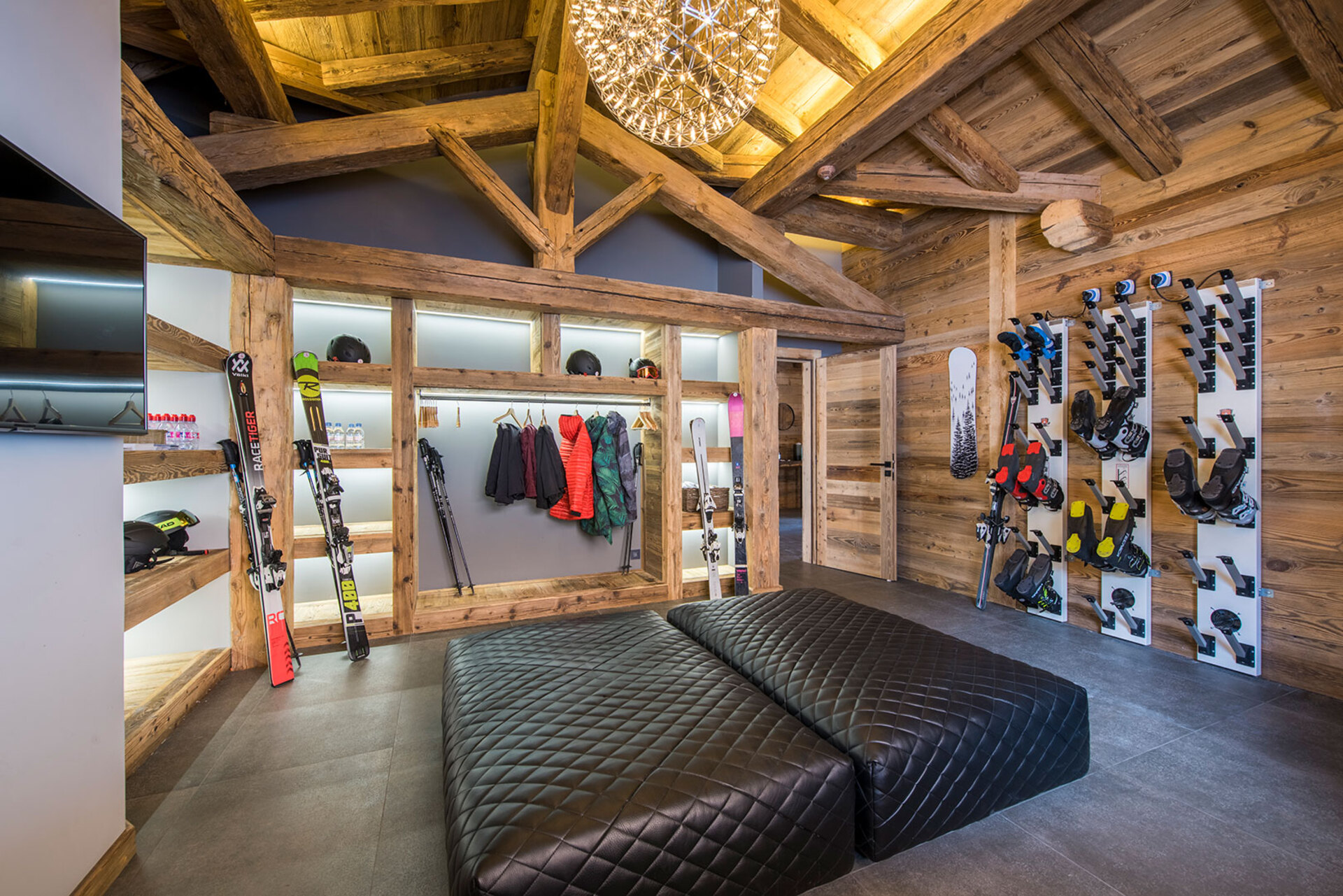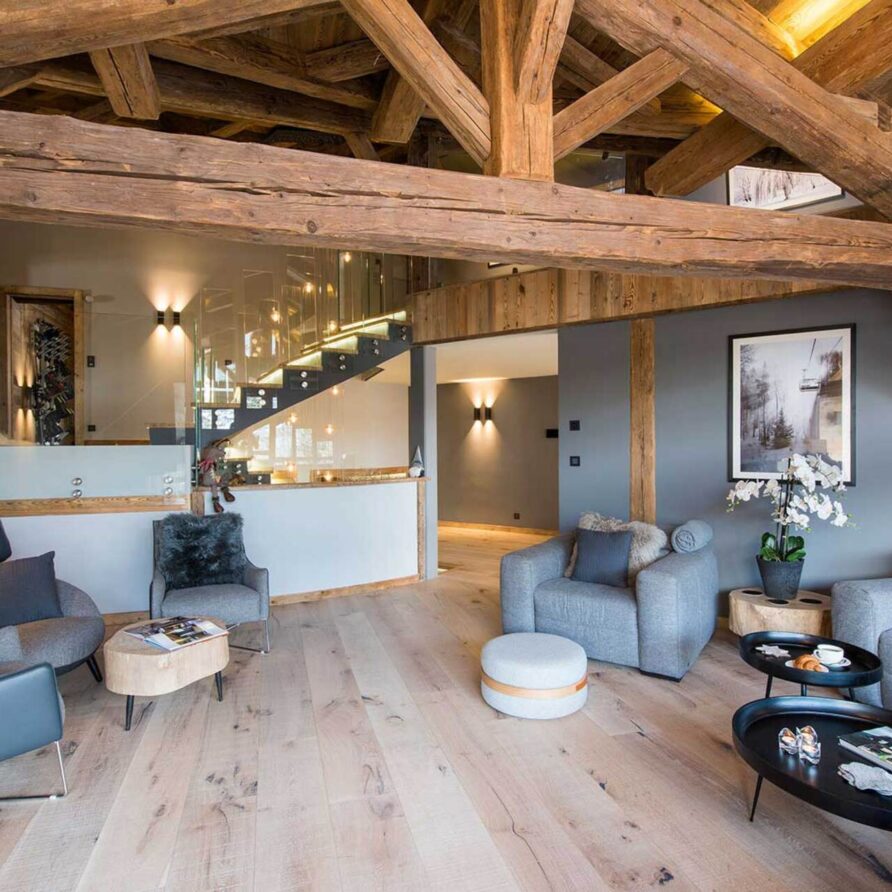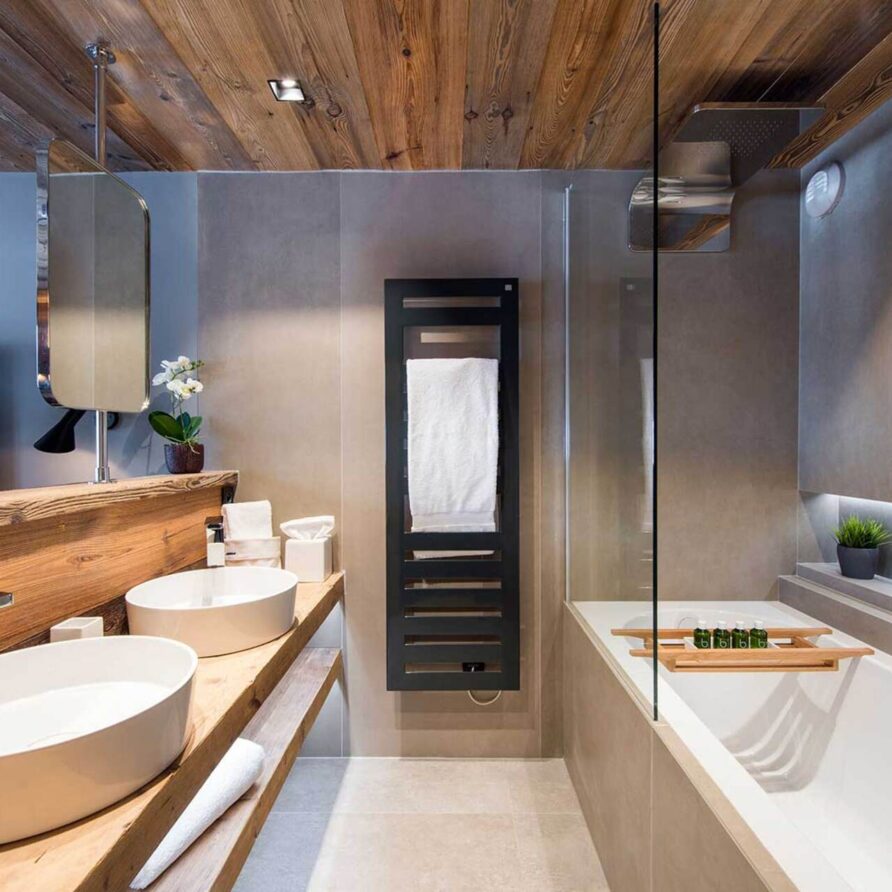 The impressive spa and wellness areas are very spacious for a private chalet. It offers an indoor swimming pool with massage and counter current jets as well as a view of the mountains. There is also a hamman and massage room. Wellness at the chalet isn’t just about relaxation, it is very much seen as a holistic vision which perfectly echoes the modern active lifestyles. Alongside the fantastic spa facilities there is a well equipped gym, and forest trails starting at the foot of the garden.
