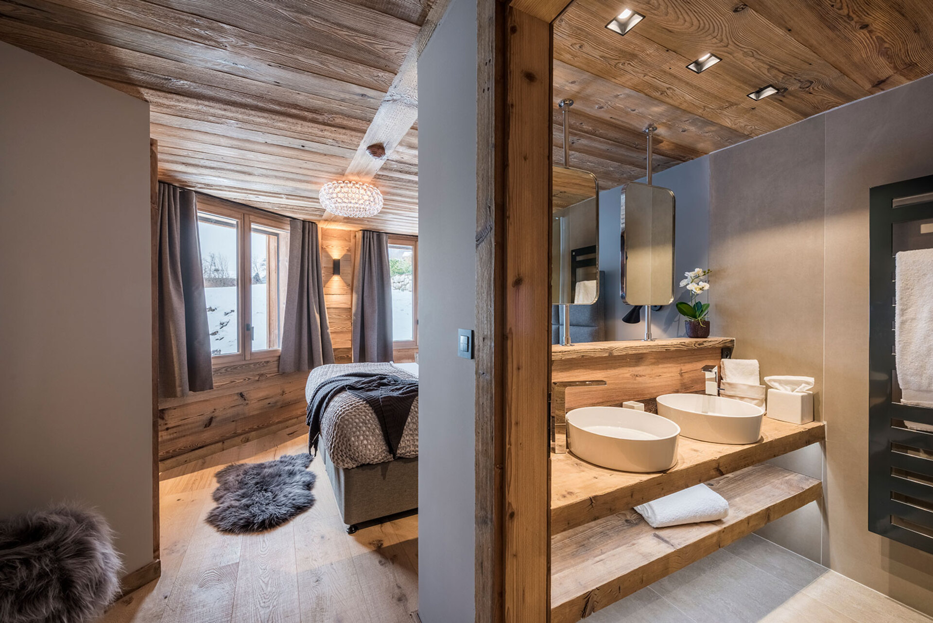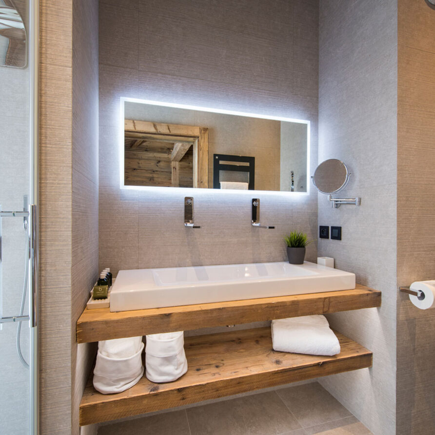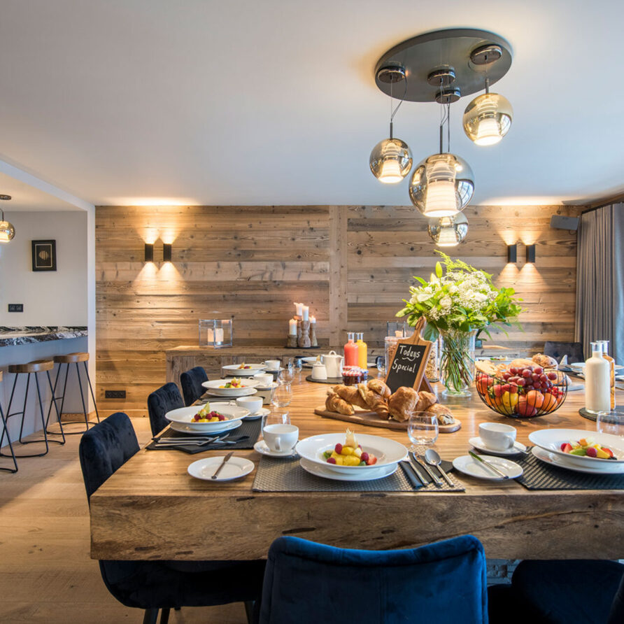 The chalet with 520sqm can accommodate 10 guests in 5 bedrooms en-suite. The chalet offers a very chic and stylish alpine interior with fantastic views across to the mountains. To unwind after a day on the slopes the living area with fireplace is the perfect place. Adjacent to the main living area is the dining room, set around a large handmade Balinese teak table. An inset balcony frames yet another stunning view towards the mountains. There’s a professional closed kitchen for the ‘serious’ work, and an open show kitchen for service and chef demonstrations. From here your chef will serve stunning contemporary cuisine.