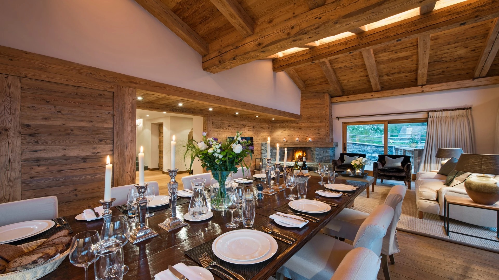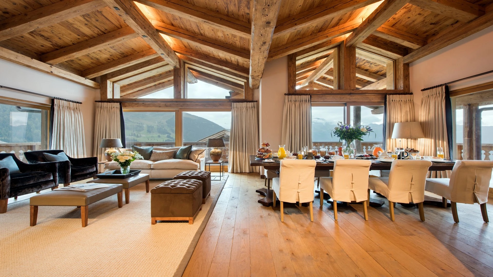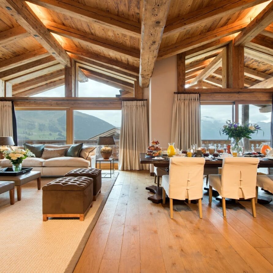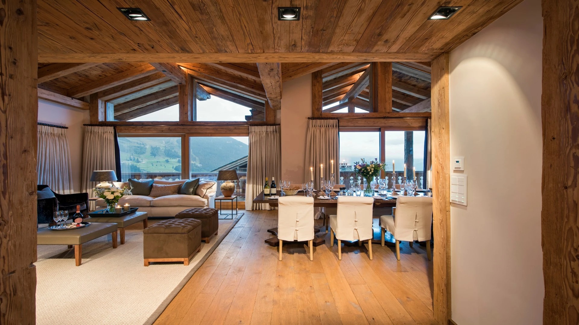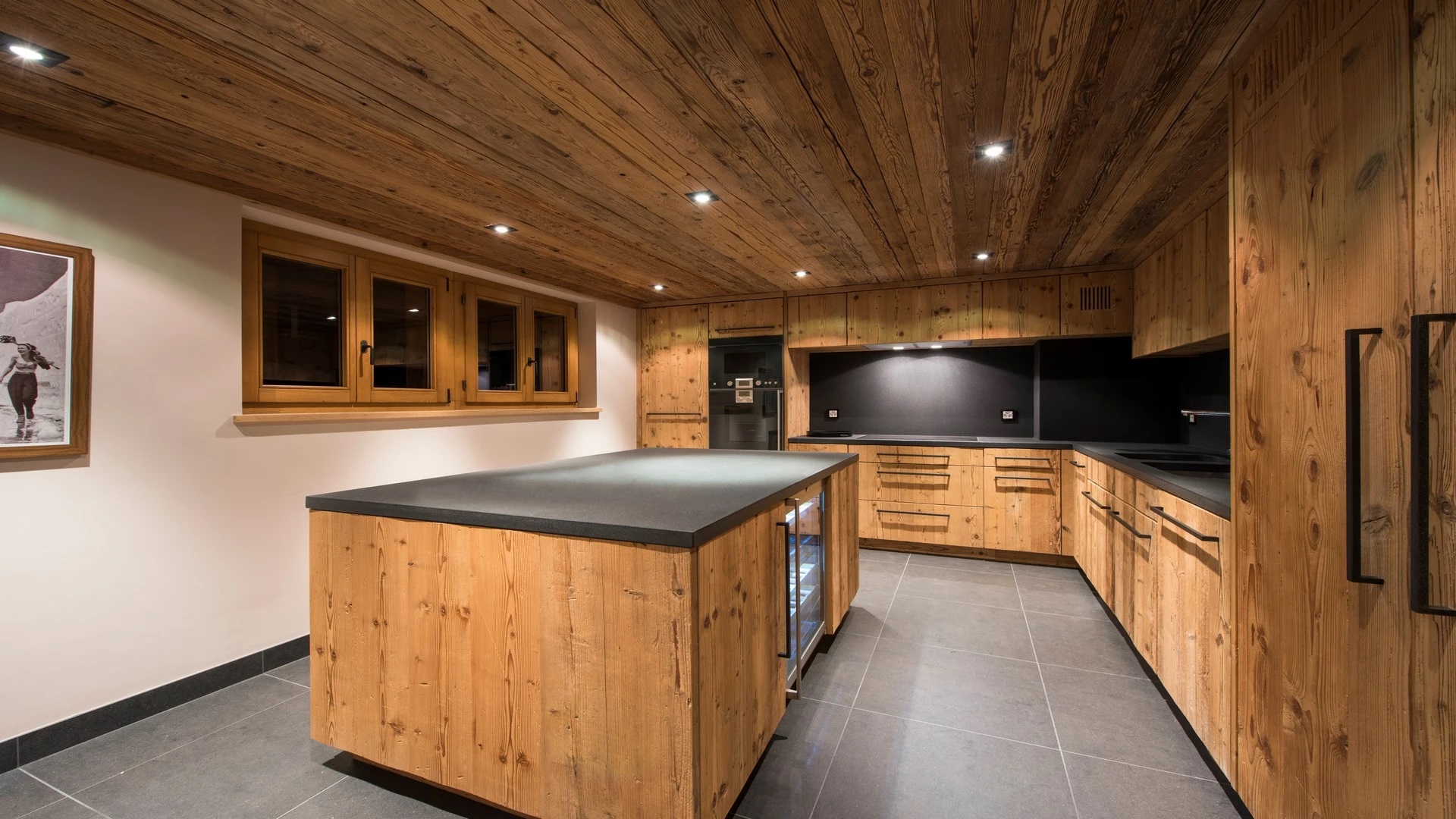 The living area on the second floor welcomes guests with a stone fireplace, serving as a meeting point for the whole family – an ideal space to chat after a day on the slopes. The interior exudes elegance, featuring cozy sofas and armchairs arranged around the fireplace in soft cream and grey hues. The large dining table is perfect for enjoying self-prepared meals or indulging in delicious dishes prepared by the private chef, all paired with fine wines from the wine cellar. A wood ceiling creates a warm ambiance, and expansive windows flood the room with natural light. The well-equipped kitchen, though closed off, ensures maximum privacy while you savor your dinner.