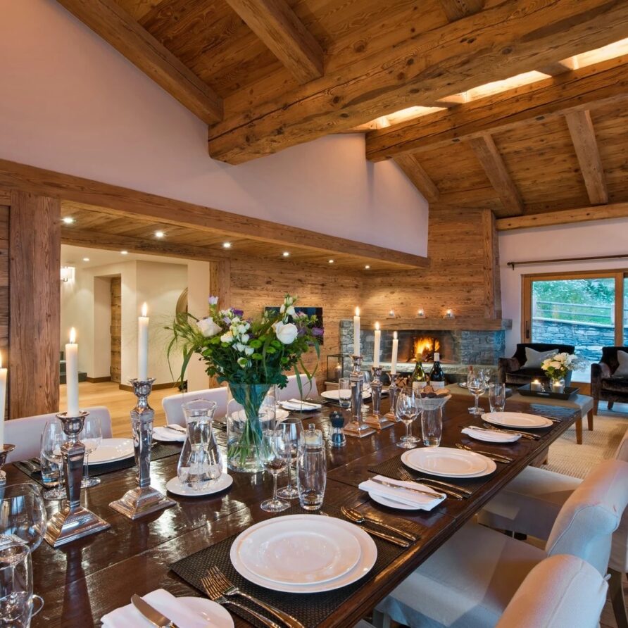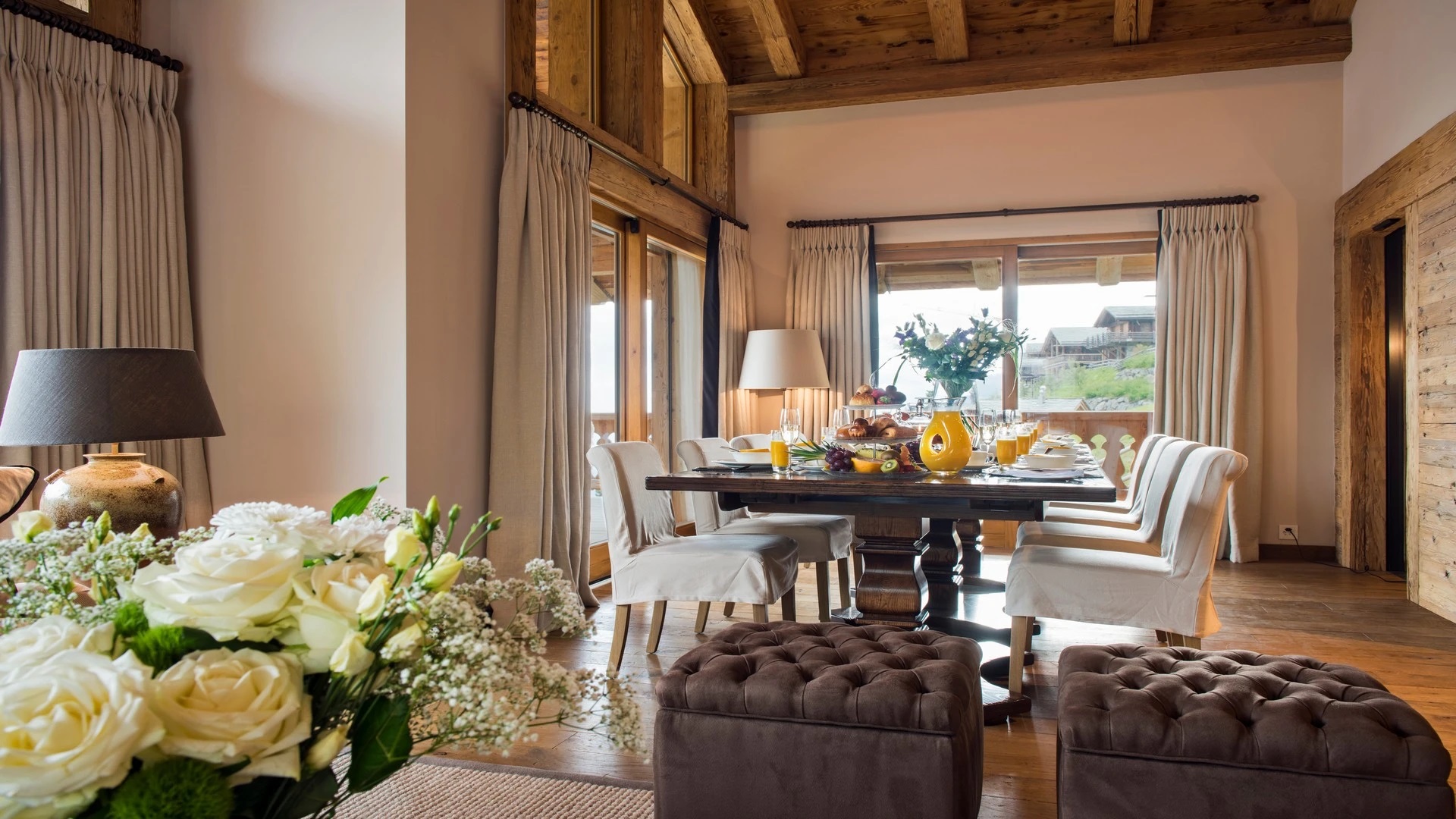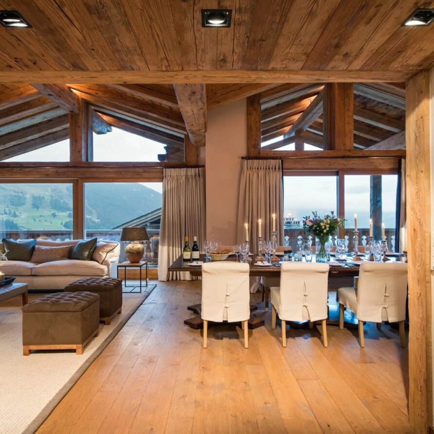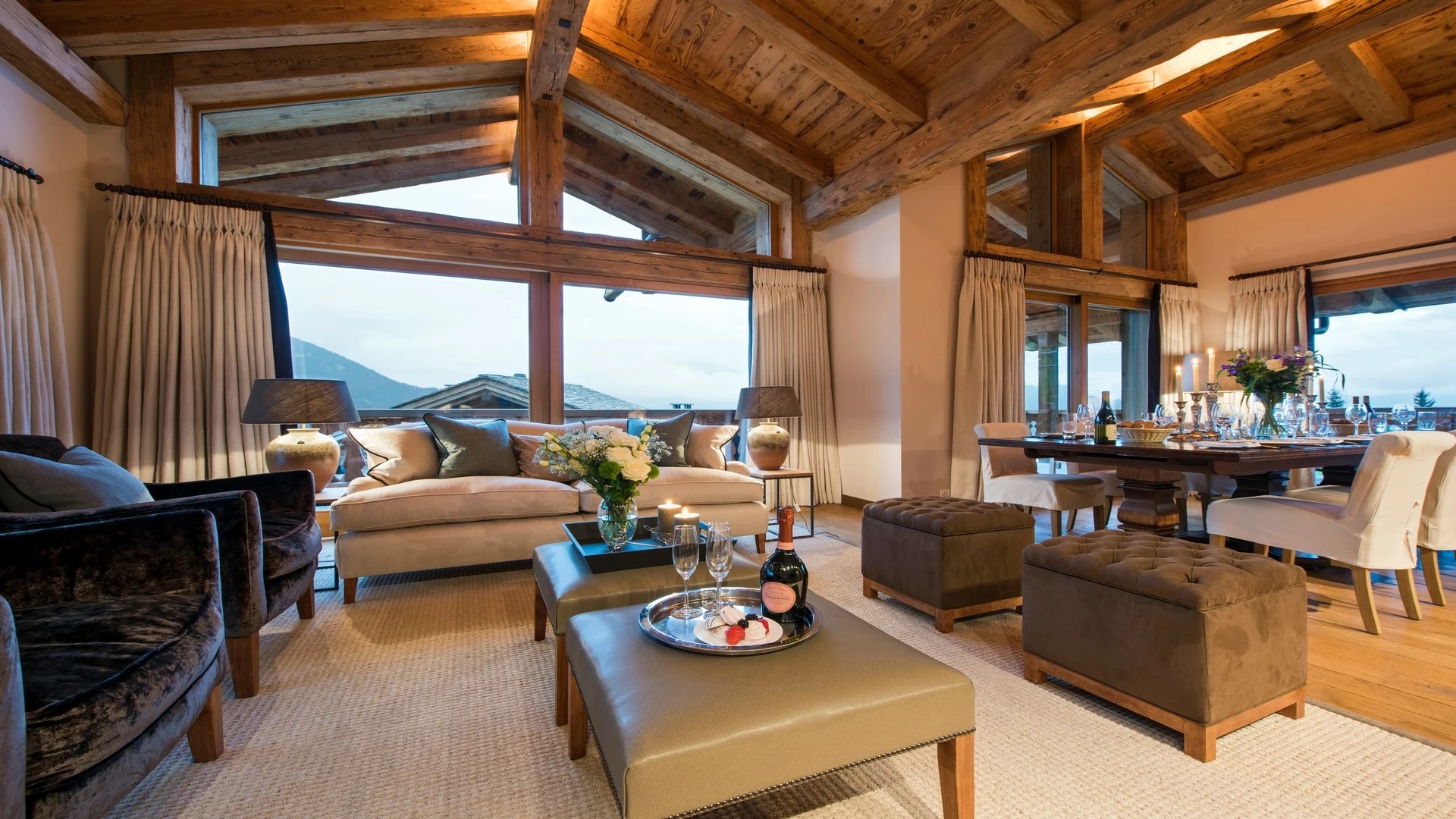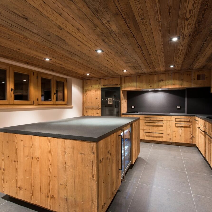 The living area on the second floor welcomes guests with a stone fireplace, serving as a meeting point for the whole family – an ideal space to chat after a day on the slopes. The interior exudes elegance, featuring cozy sofas and armchairs arranged around the fireplace in soft cream and grey hues. The large dining table is perfect for enjoying self-prepared meals or indulging in delicious dishes prepared by the private chef, all paired with fine wines from the wine cellar. A wood ceiling creates a warm ambiance, and expansive windows flood the room with natural light. The well-equipped kitchen, though closed off, ensures maximum privacy while you savor your dinner.