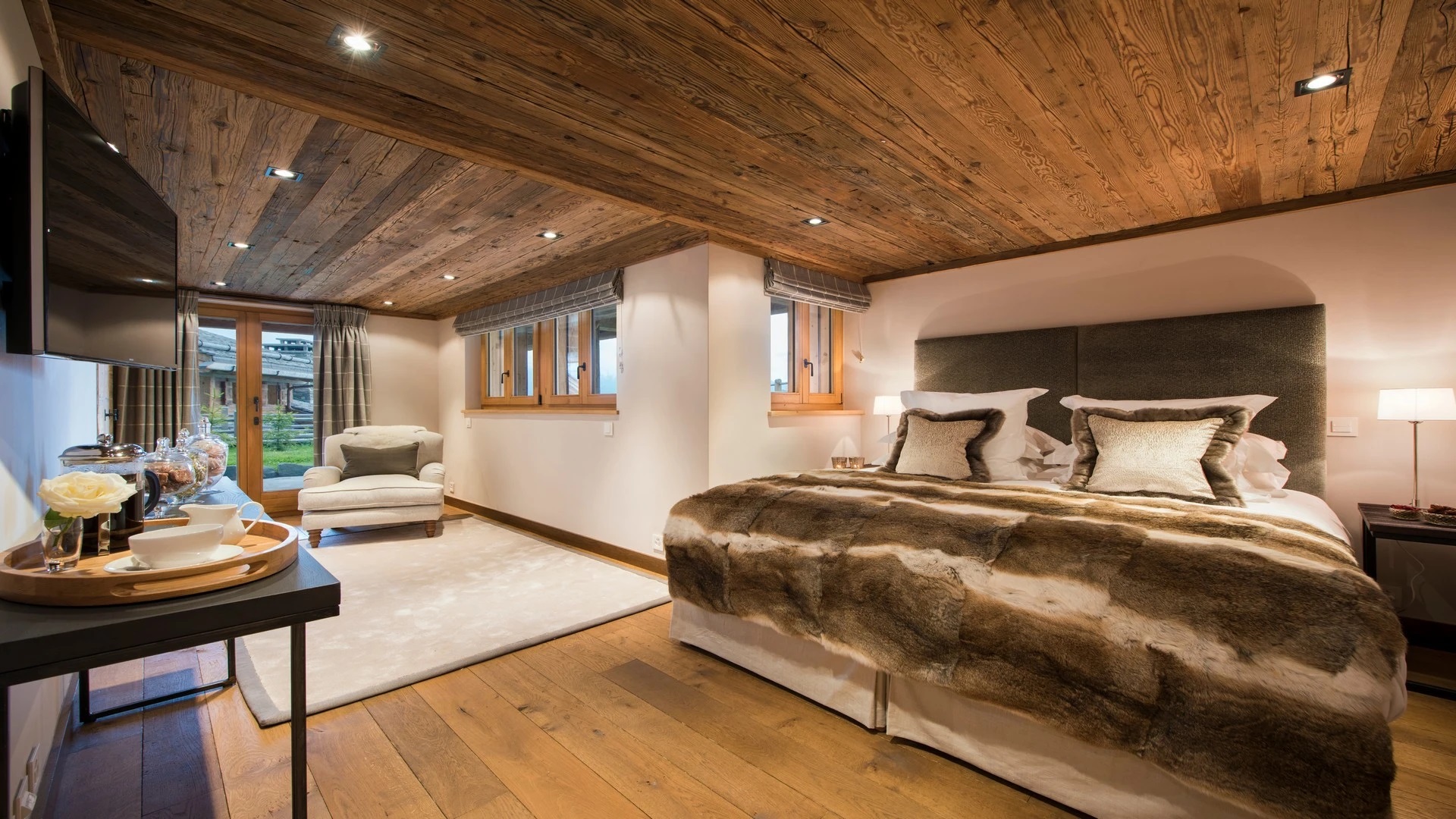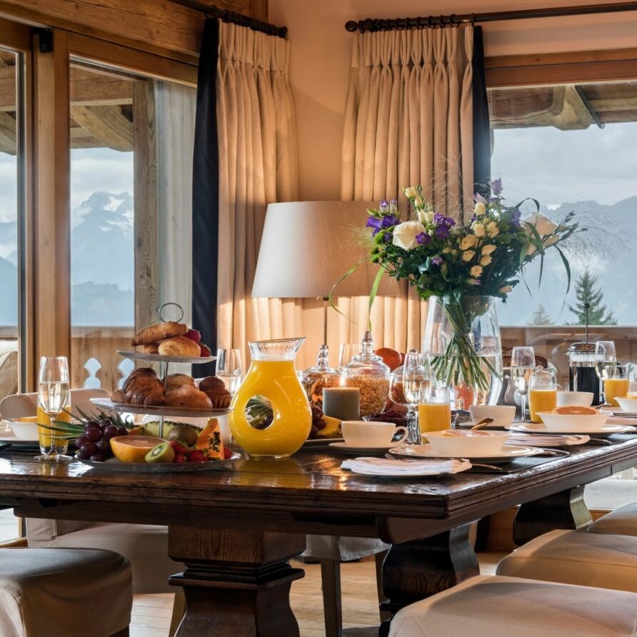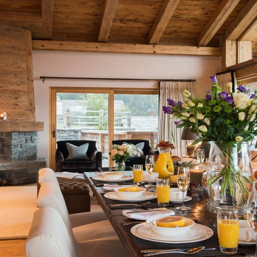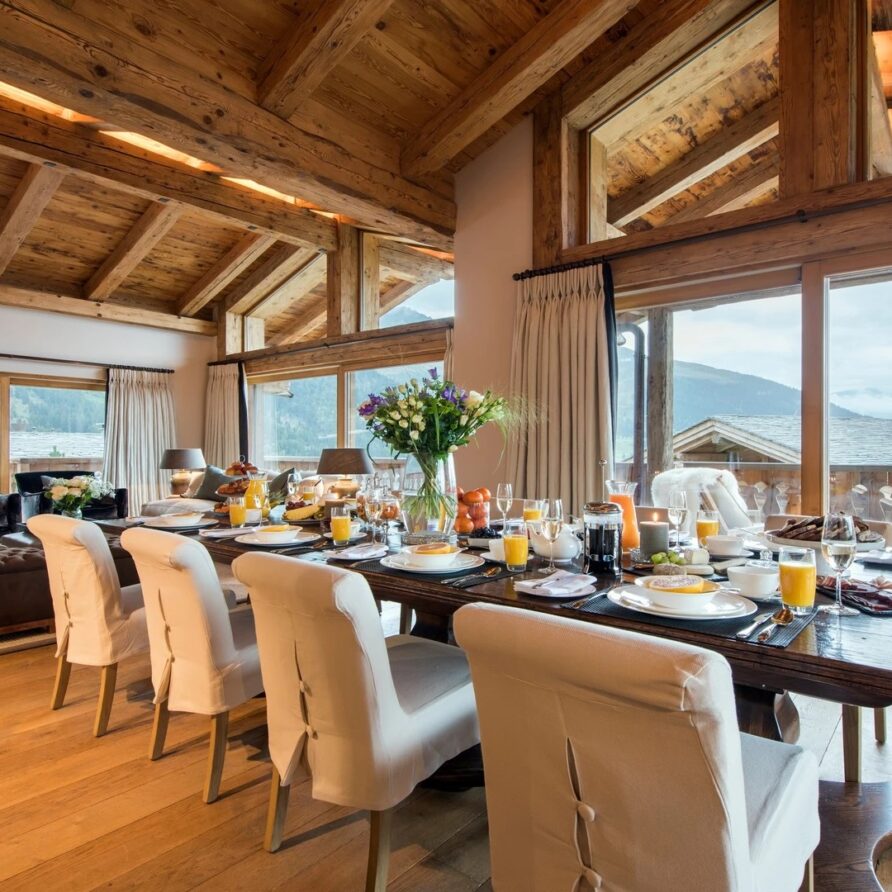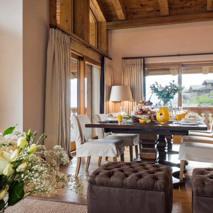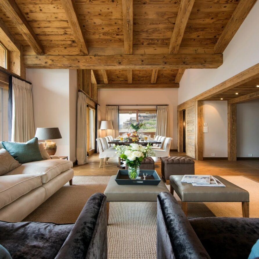 The living area on the second floor welcomes guests with a stone fireplace, serving as a meeting point for the whole family – an ideal space to chat after a day on the slopes. The interior exudes elegance, featuring cozy sofas and armchairs arranged around the fireplace in soft cream and grey hues. The large dining table is perfect for enjoying self-prepared meals or indulging in delicious dishes prepared by the private chef, all paired with fine wines from the wine cellar. A wood ceiling creates a warm ambiance, and expansive windows flood the room with natural light. The well-equipped kitchen, though closed off, ensures maximum privacy while you savor your dinner.