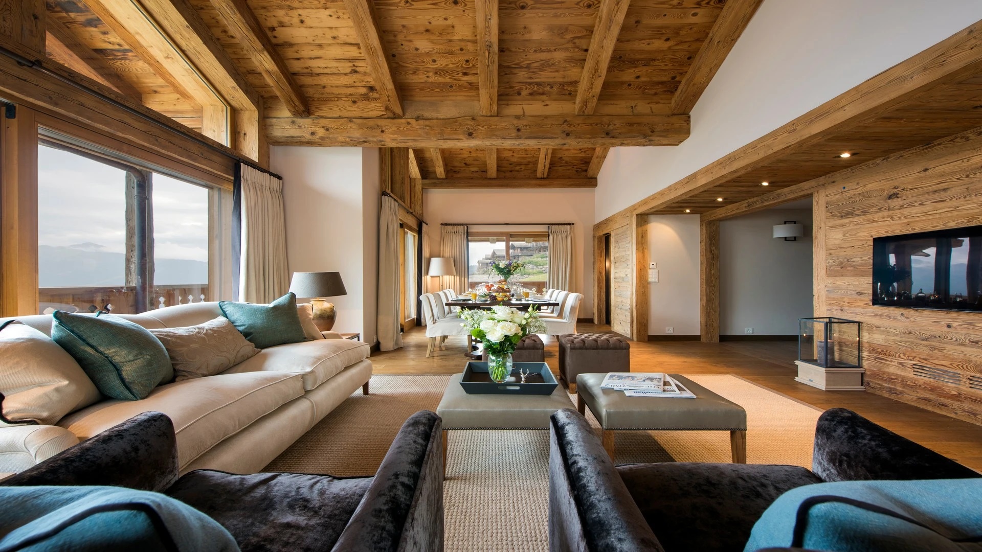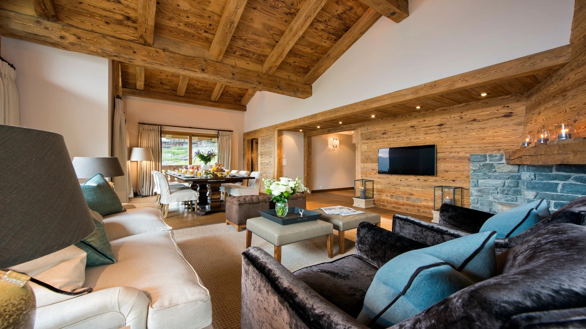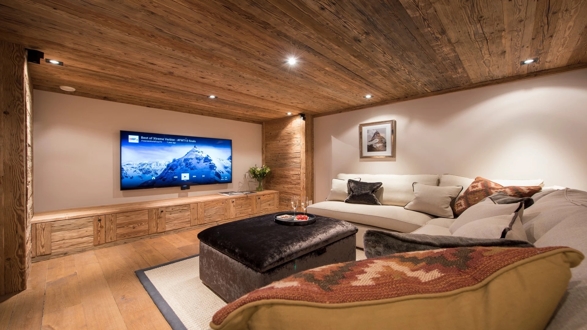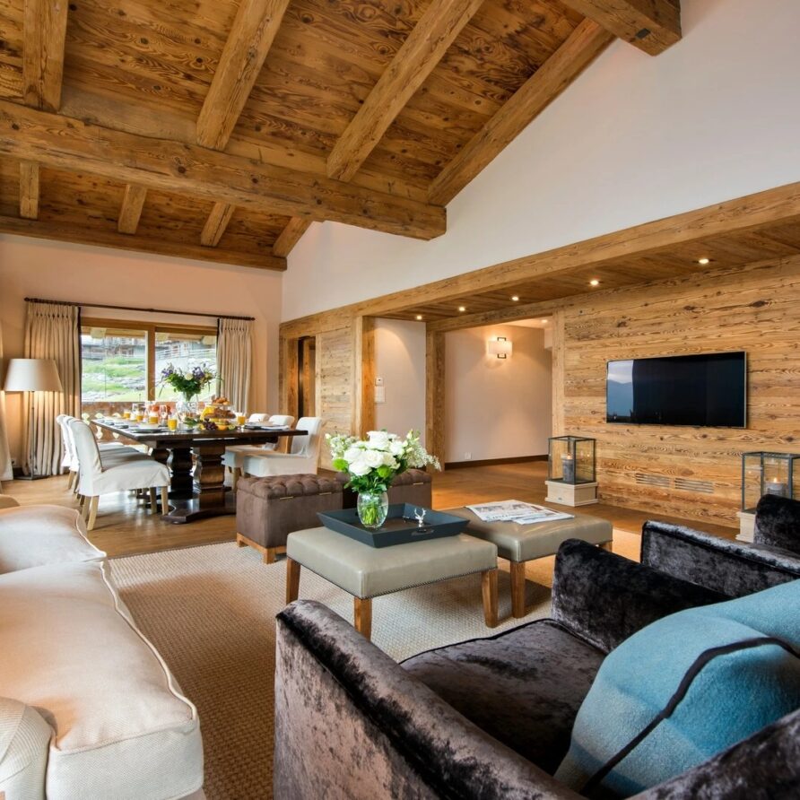 The living area provides direct access to a spacious terrace, creating a seamless blend of indoor and outdoor living. With the terrace acting as a sun-soaked haven, it becomes an ideal location to unwind and indulge in a leisurely sundowner. The terrace not only caters to those seeking a tranquil spot but also offers a picturesque mountain backdrop for social gatherings and entertaining guests. Moreover, the chalet is equipped with the latest sound and entertainment systems, ensuring that every moment is accompanied by cutting-edge audiovisual experiences. The large television in the living area invites you to watch movies or shows after dinner.