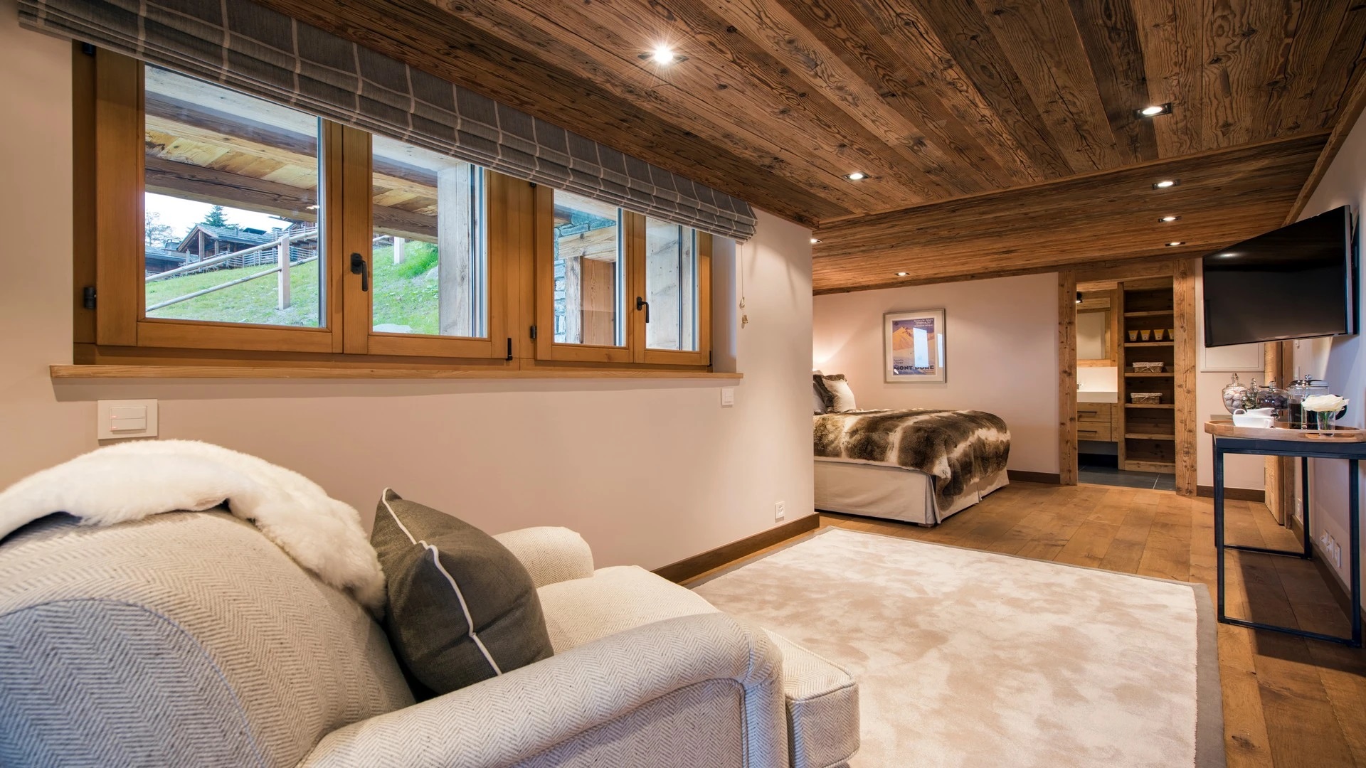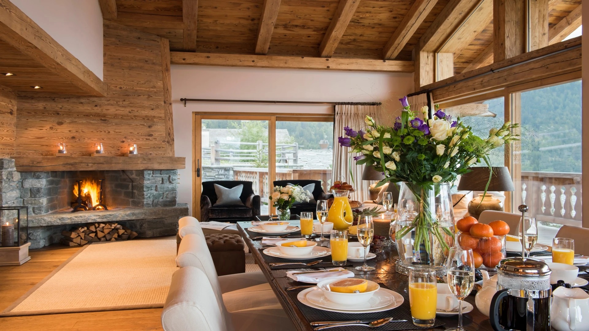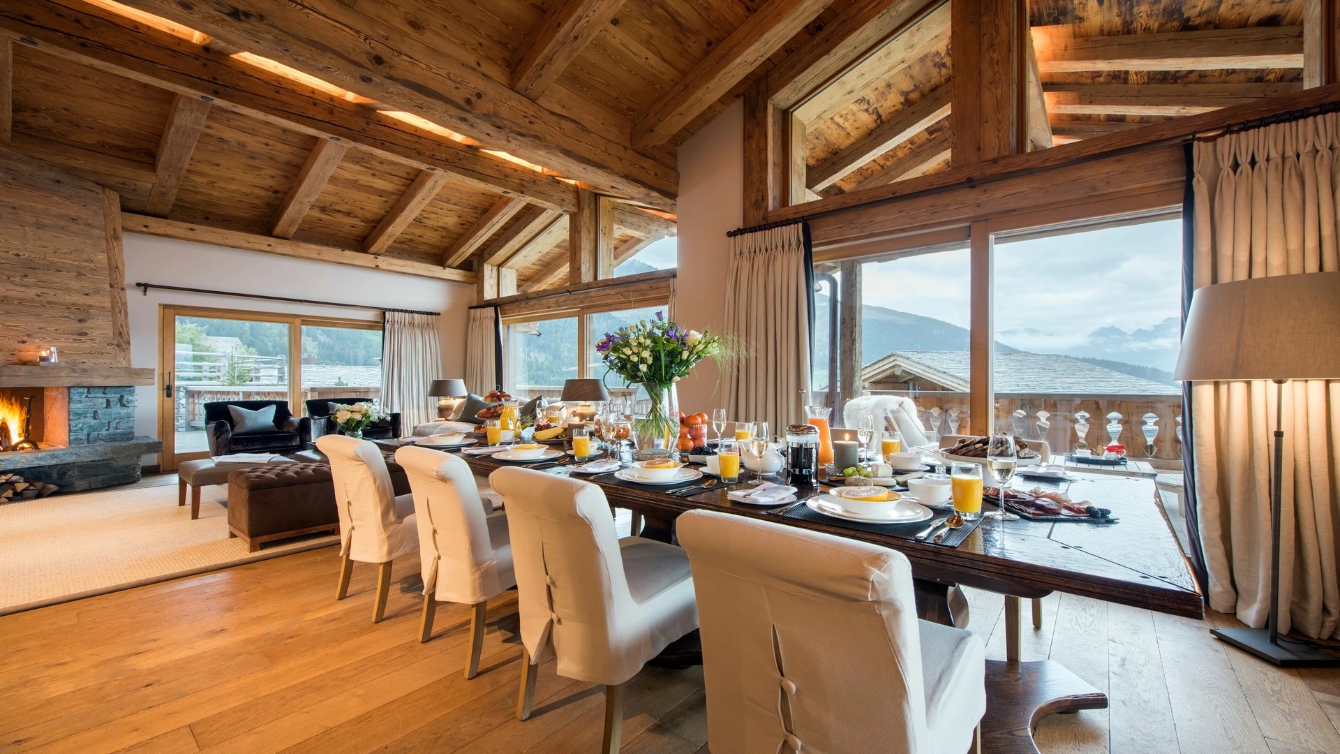 The living area provides direct access to a spacious terrace, creating a seamless blend of indoor and outdoor living. With the terrace acting as a sun-soaked haven, it becomes an ideal location to unwind and indulge in a leisurely sundowner. The terrace not only caters to those seeking a tranquil spot but also offers a picturesque mountain backdrop for social gatherings and entertaining guests. Moreover, the chalet is equipped with the latest sound and entertainment systems, ensuring that every moment is accompanied by cutting-edge audiovisual experiences. The large television in the living area invites you to watch movies or shows after dinner.