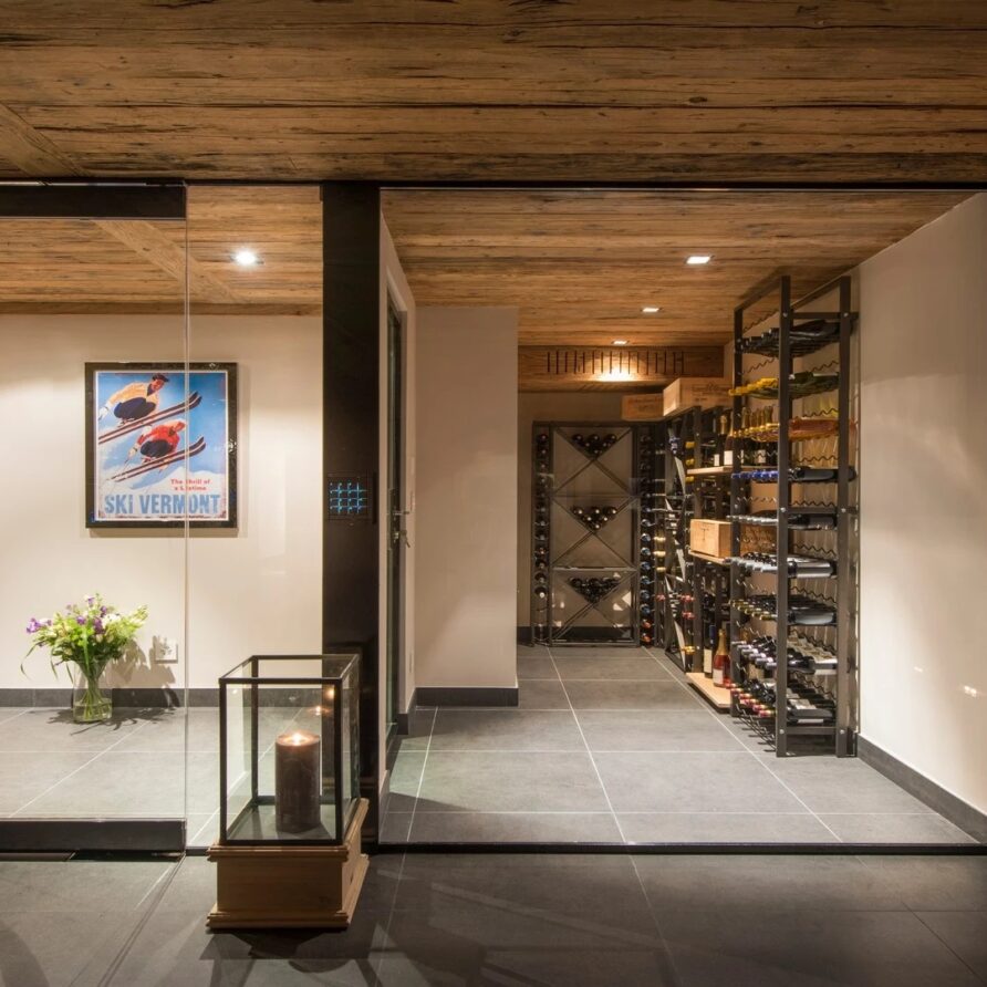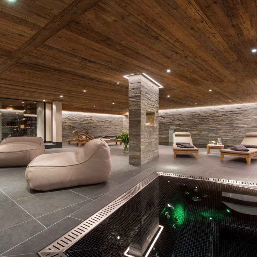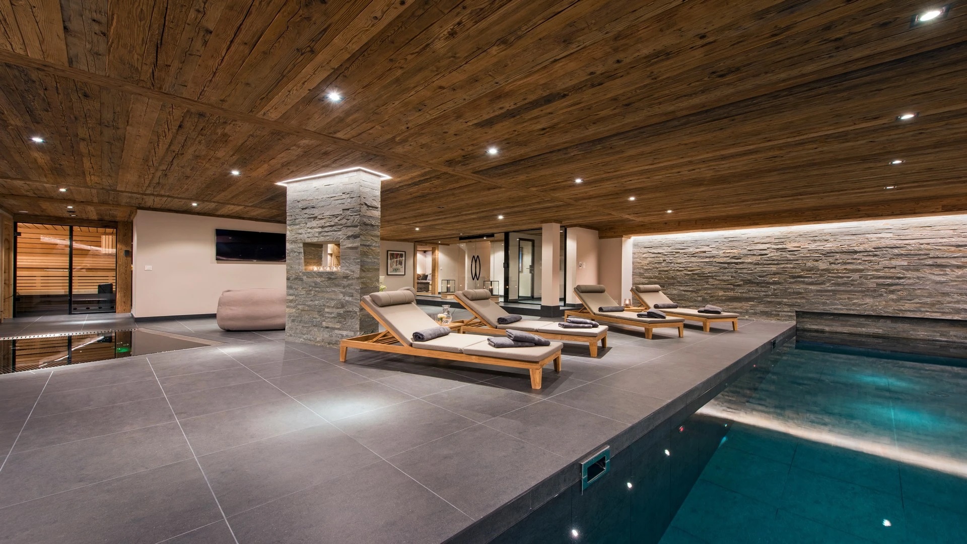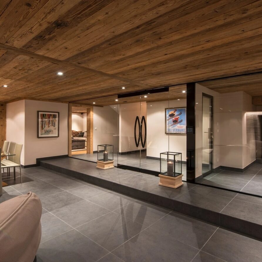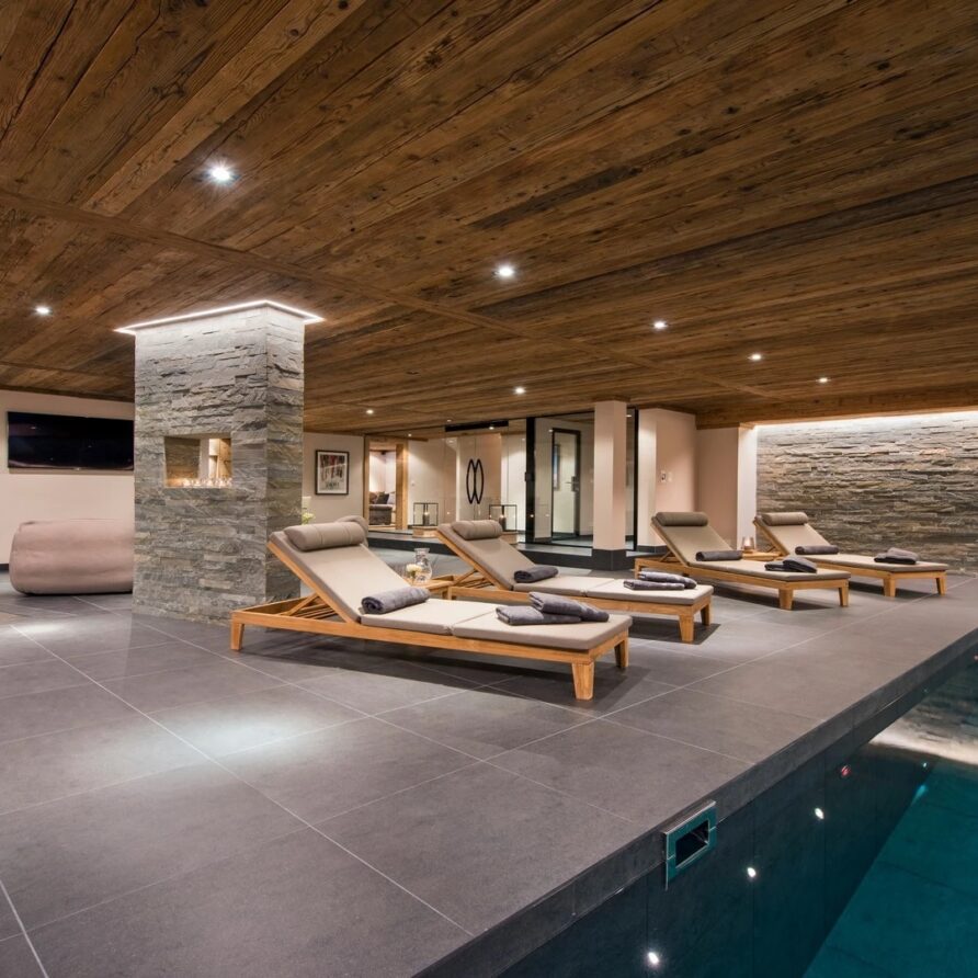 In this luxury chalet’s Entertainment and Spa Floor, every detail is meticulously crafted to provide an unrivaled experience of leisure. The indoor swimming pool beckons with its elegant design, offering a tranquil oasis for aquatic pleasures after an exciting skiing day. Take a dip in the indoor Jacuzzi or bask in the age-old tradition of the Sauna or hammam, promoting both rejuvenation and wellness. There is a flat-screen television in the relaxation area, perfect for unwinding after a day on the slopes with your favorite movies or TV shows. A well-appointed small kitchen/bar area, offering the convenience of preparing light snacks and beverages without leaving the indulgent surroundings.