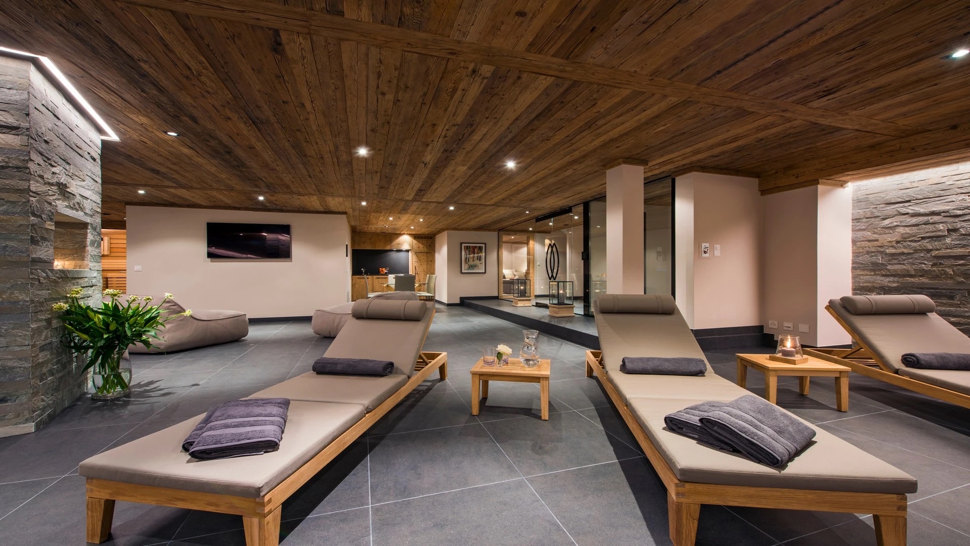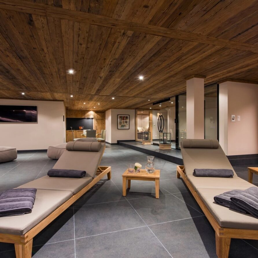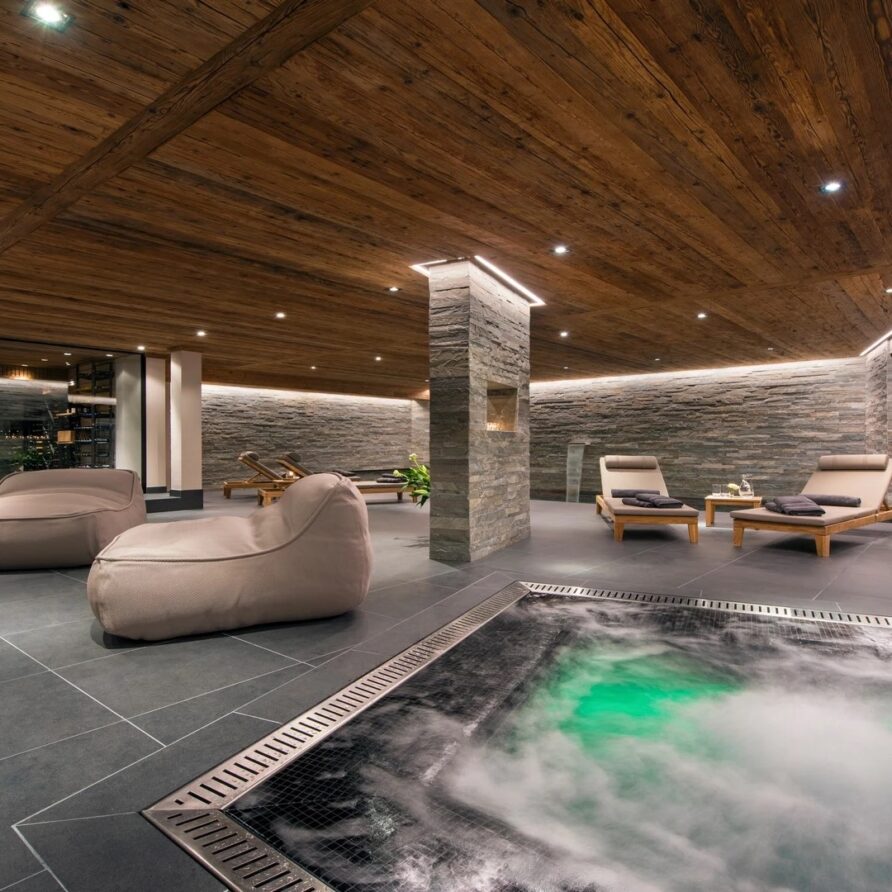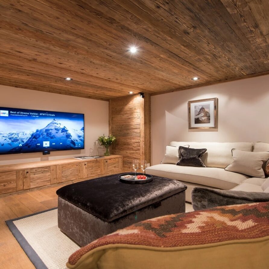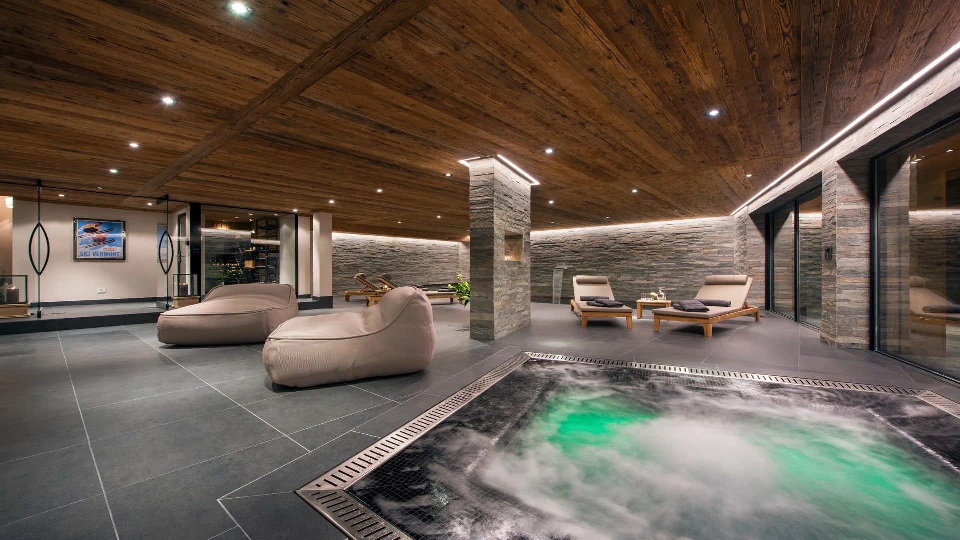 In this luxury chalet’s Entertainment and Spa Floor, every detail is meticulously crafted to provide an unrivaled experience of leisure. The indoor swimming pool beckons with its elegant design, offering a tranquil oasis for aquatic pleasures after an exciting skiing day. Take a dip in the indoor Jacuzzi or bask in the age-old tradition of the Sauna or hammam, promoting both rejuvenation and wellness. There is a flat-screen television in the relaxation area, perfect for unwinding after a day on the slopes with your favorite movies or TV shows. A well-appointed small kitchen/bar area, offering the convenience of preparing light snacks and beverages without leaving the indulgent surroundings.