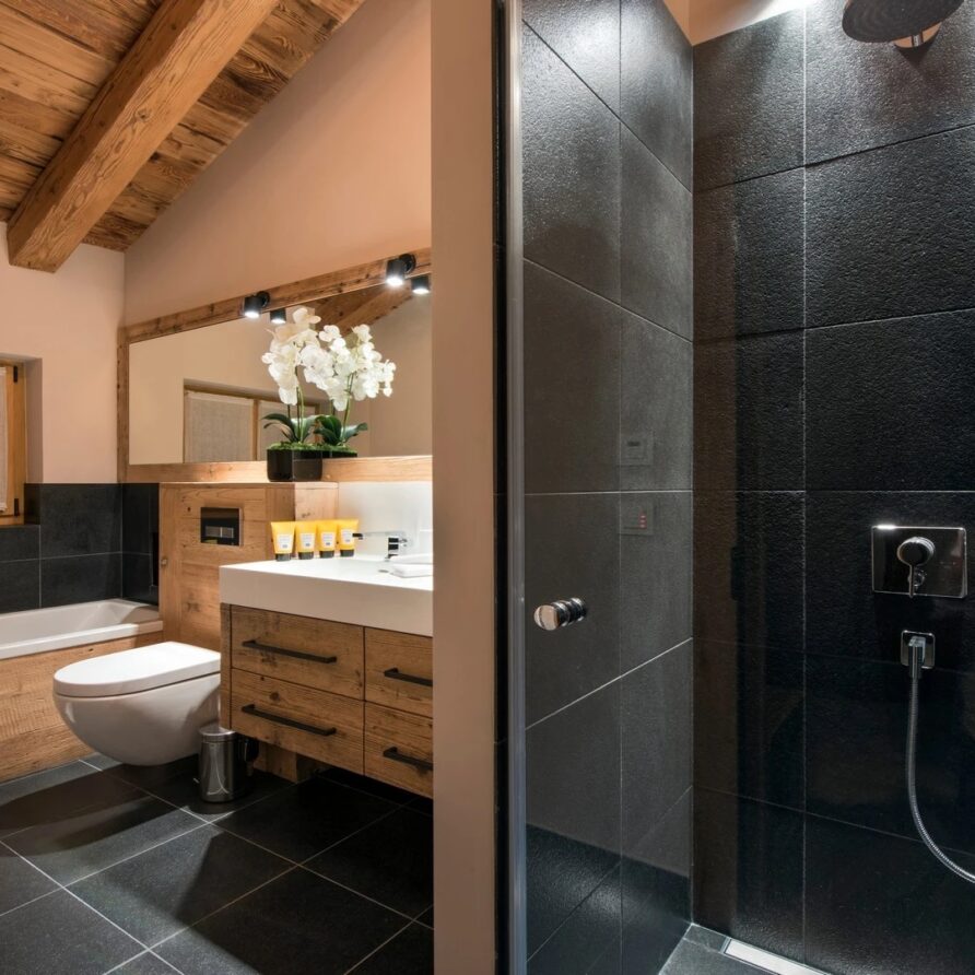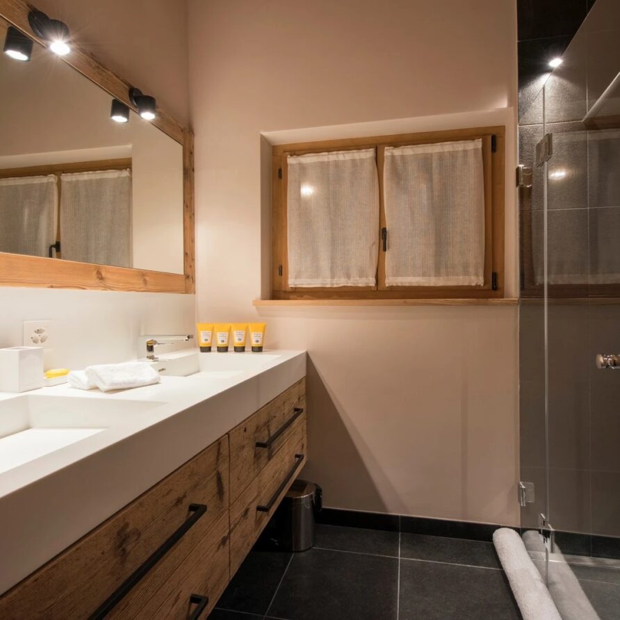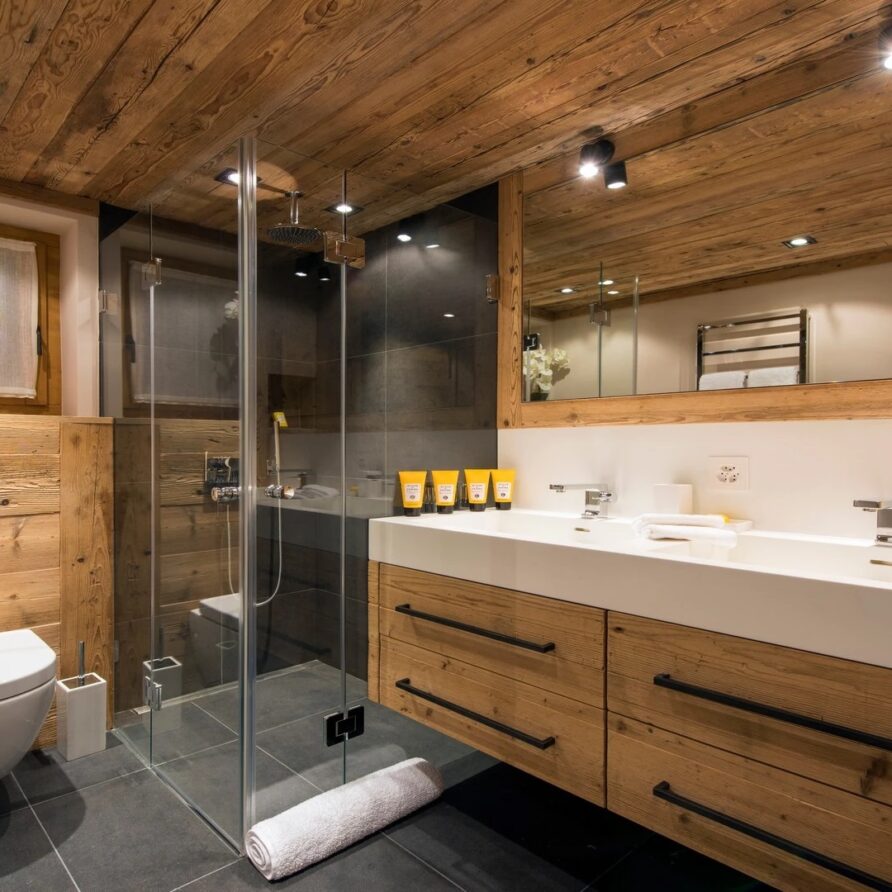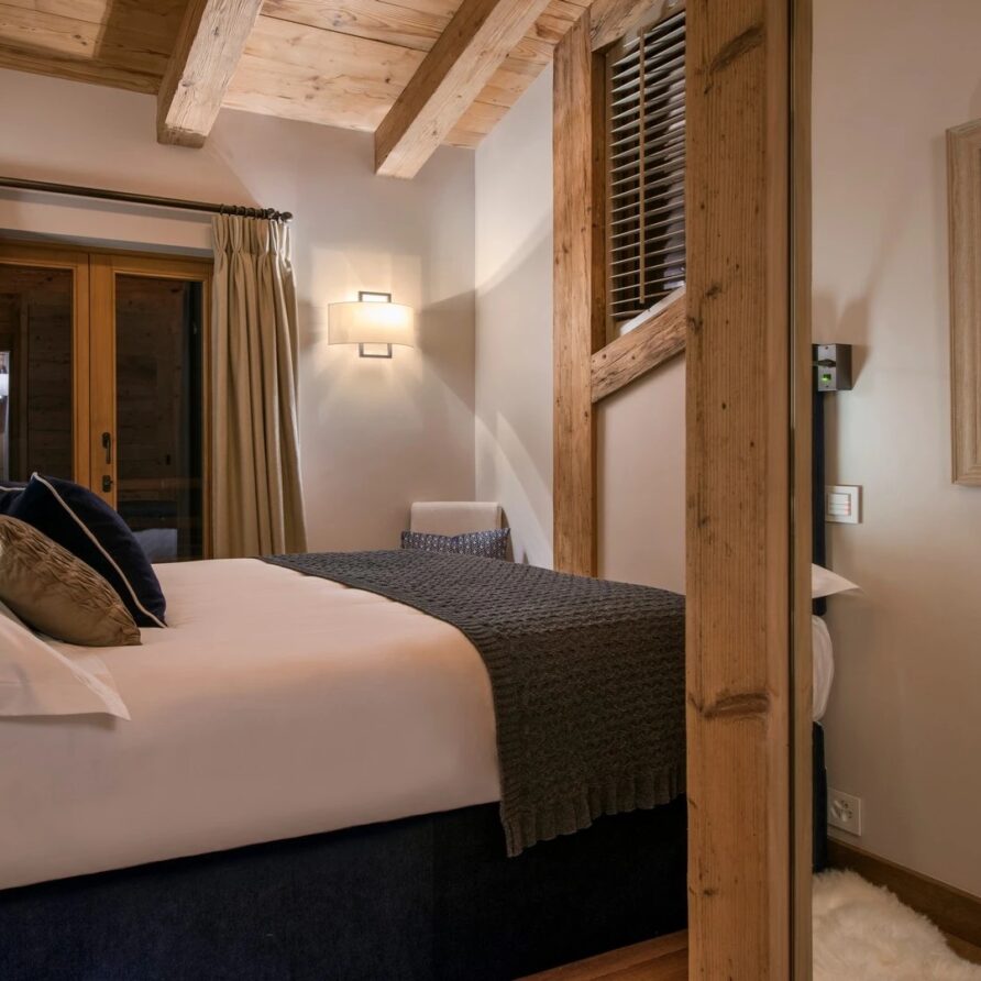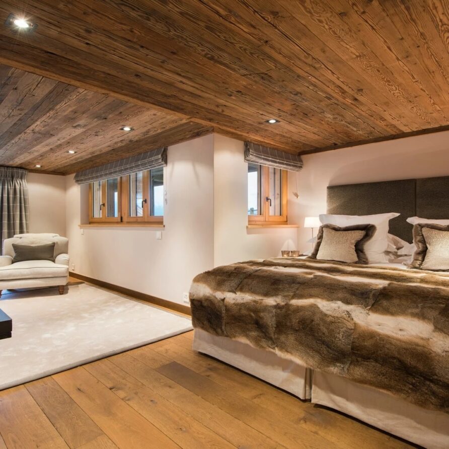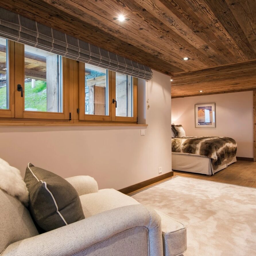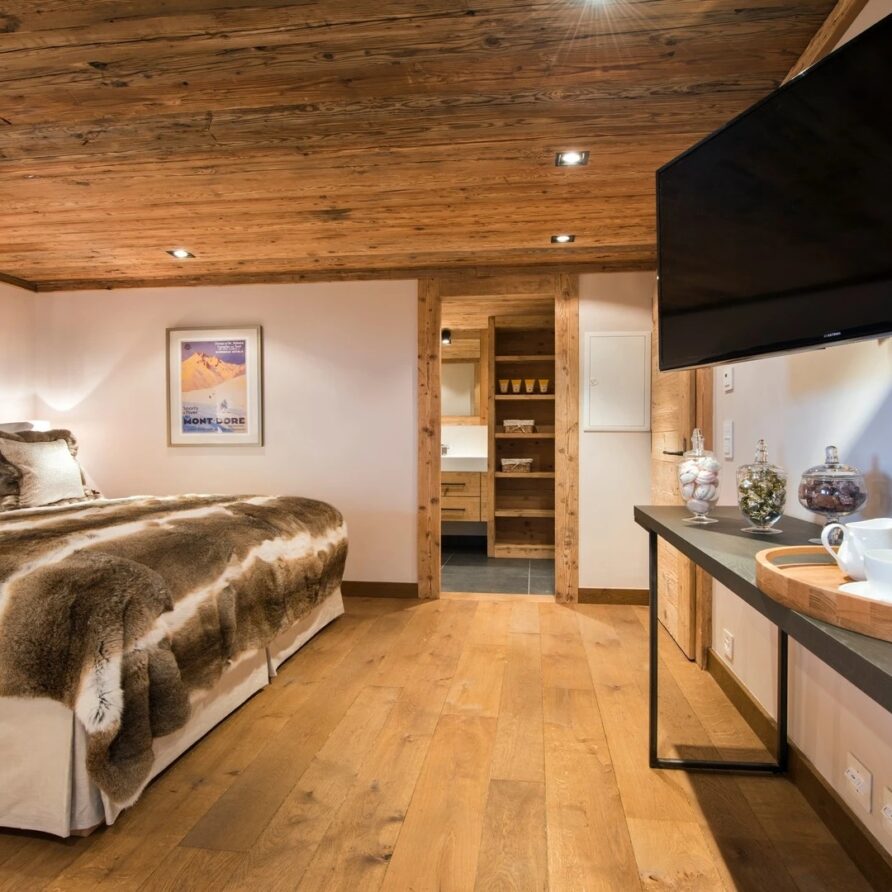 In this luxury chalet’s Entertainment and Spa Floor, every detail is meticulously crafted to provide an unrivaled experience of leisure. The indoor swimming pool beckons with its elegant design, offering a tranquil oasis for aquatic pleasures after an exciting skiing day. Take a dip in the indoor Jacuzzi or bask in the age-old tradition of the Sauna or hammam, promoting both rejuvenation and wellness. There is a flat-screen television in the relaxation area, perfect for unwinding after a day on the slopes with your favorite movies or TV shows. A well-appointed small kitchen/bar area, offering the convenience of preparing light snacks and beverages without leaving the indulgent surroundings.