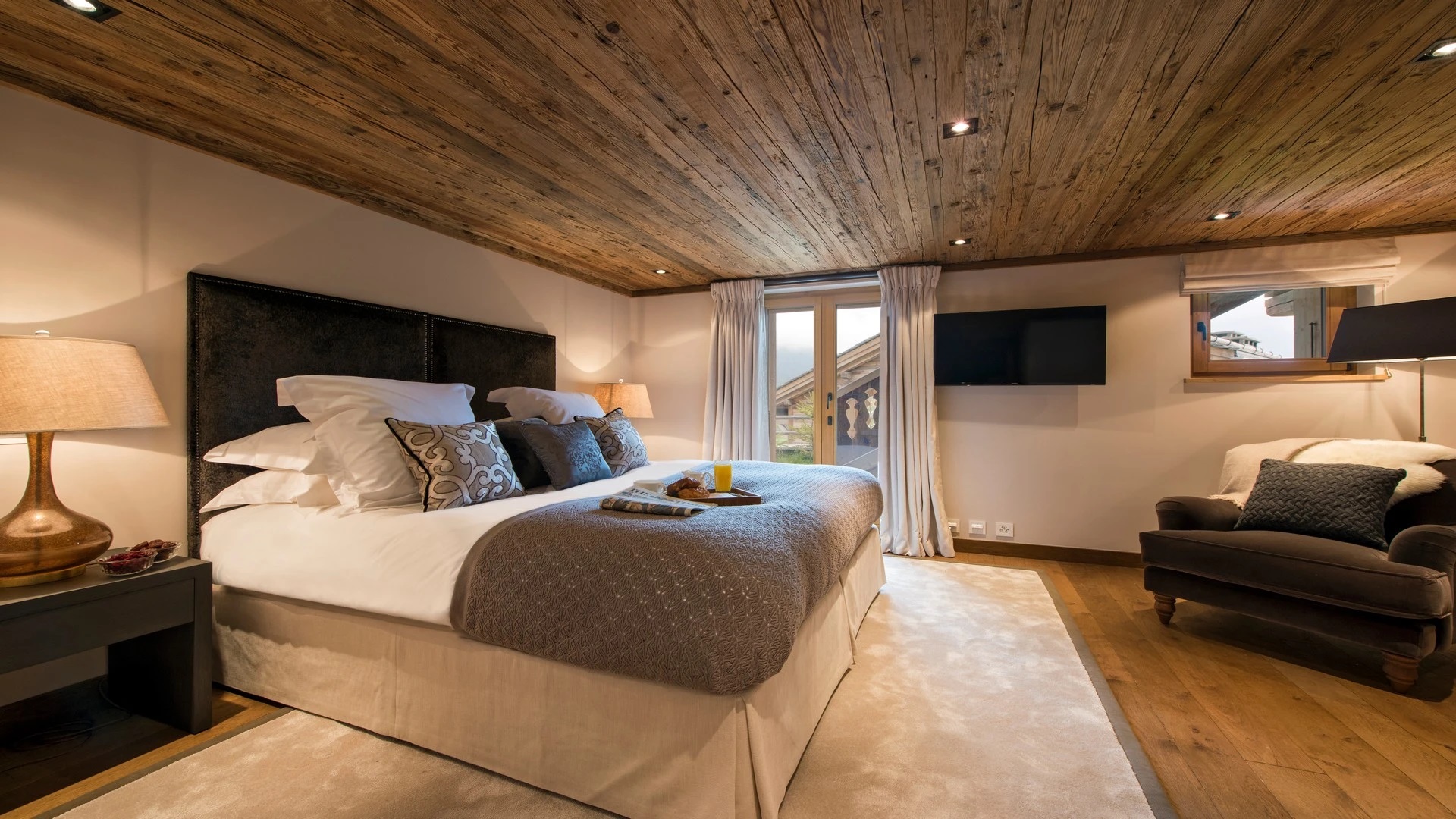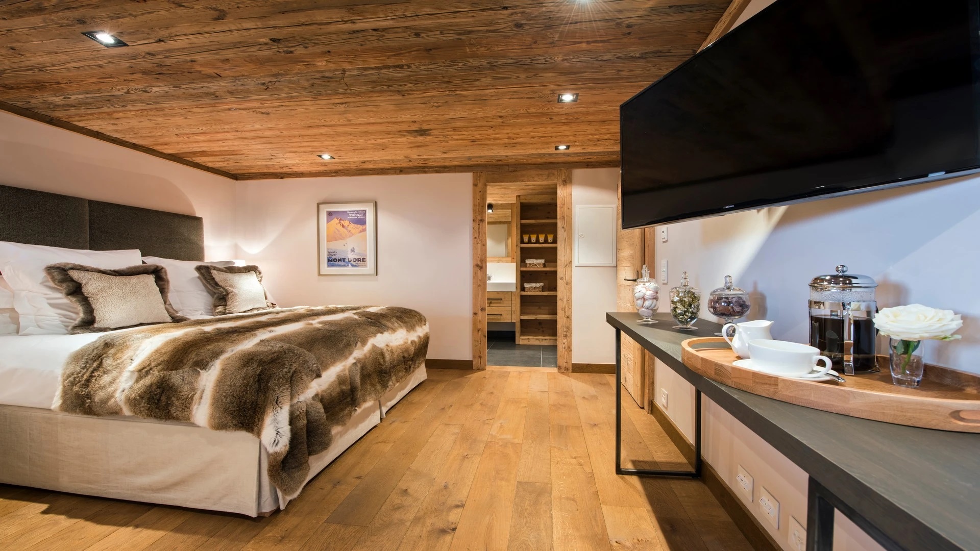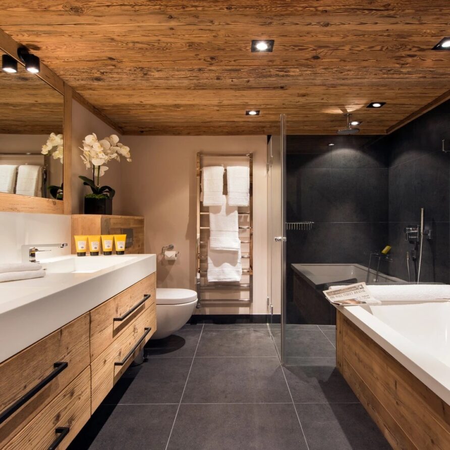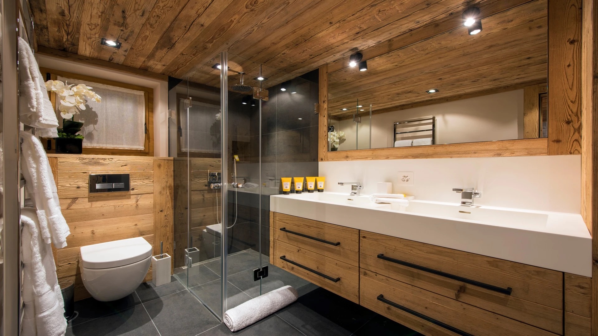 In this luxury chalet’s Entertainment and Spa Floor, every detail is meticulously crafted to provide an unrivaled experience of leisure. The indoor swimming pool beckons with its elegant design, offering a tranquil oasis for aquatic pleasures after an exciting skiing day. Take a dip in the indoor Jacuzzi or bask in the age-old tradition of the Sauna or hammam, promoting both rejuvenation and wellness. There is a flat-screen television in the relaxation area, perfect for unwinding after a day on the slopes with your favorite movies or TV shows. A well-appointed small kitchen/bar area, offering the convenience of preparing light snacks and beverages without leaving the indulgent surroundings.