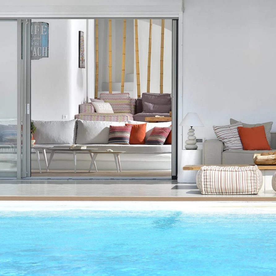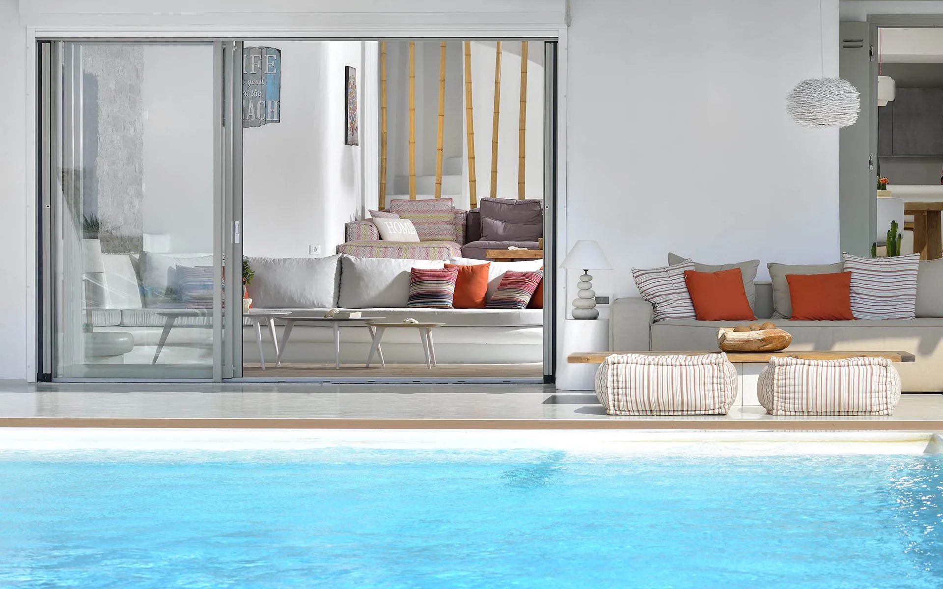 Wander past the al fresco kitchen-dining area and two separate outdoor living areas and you’ll find yourself – almost without noticing – inside the villa. With the bifold doors open, the transition from outside to in is so seamless that it’s only the wooden floors which notify you of your entrance. Once you are in, enjoy the open-plan layout of the living spaces – which include a lounge, dining room and modern kitchen.